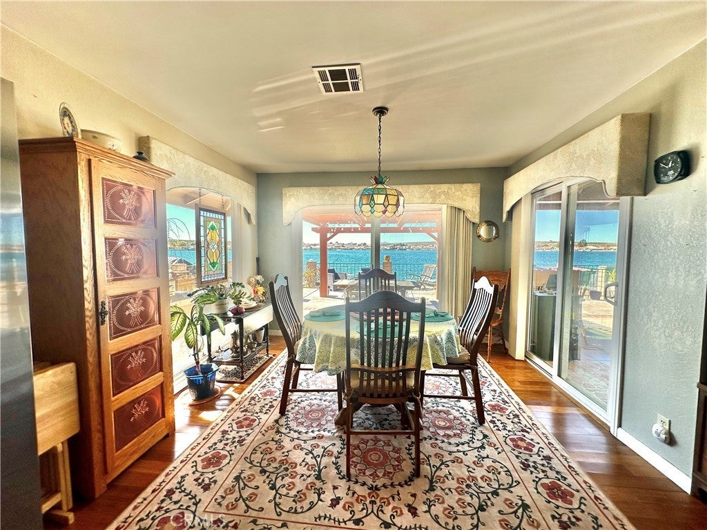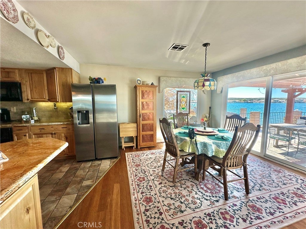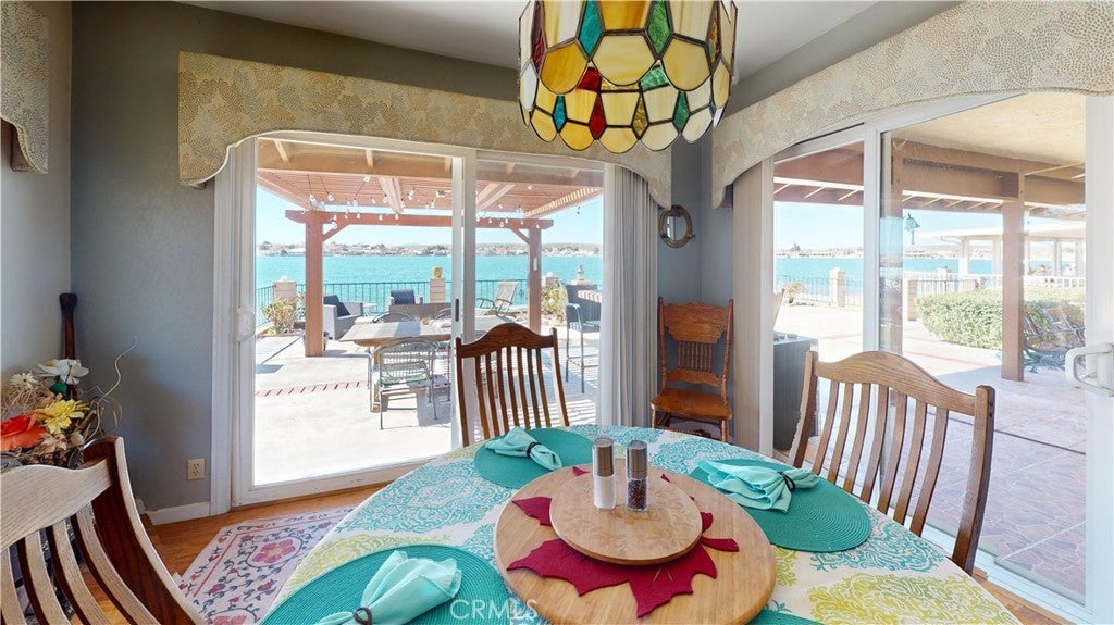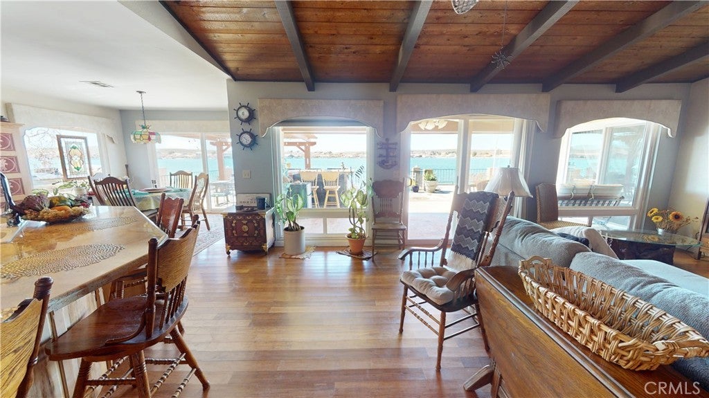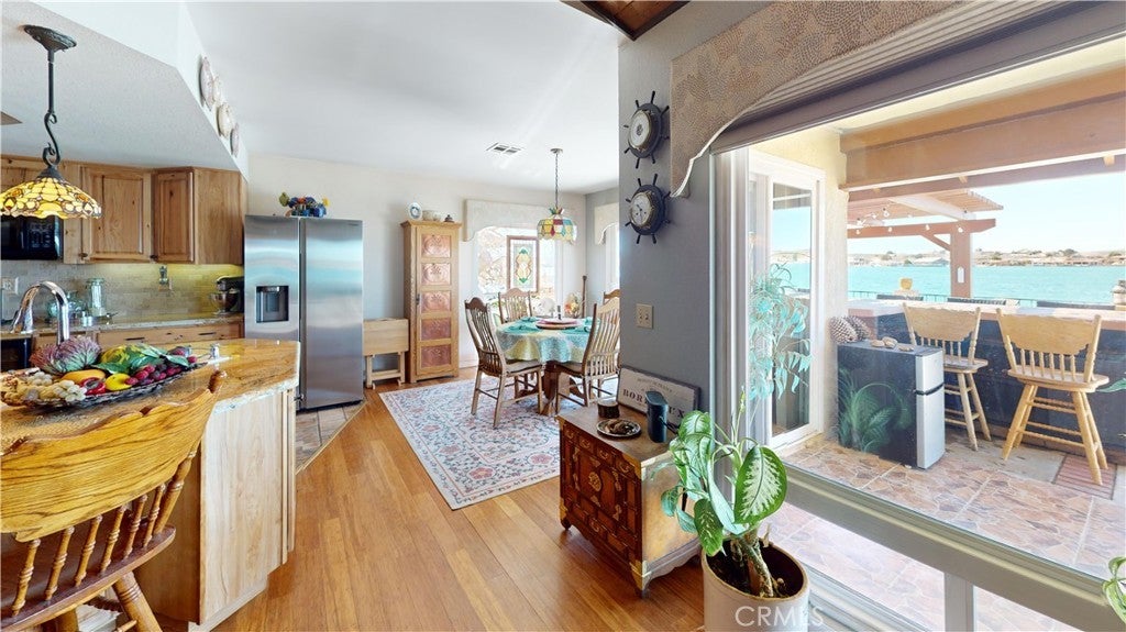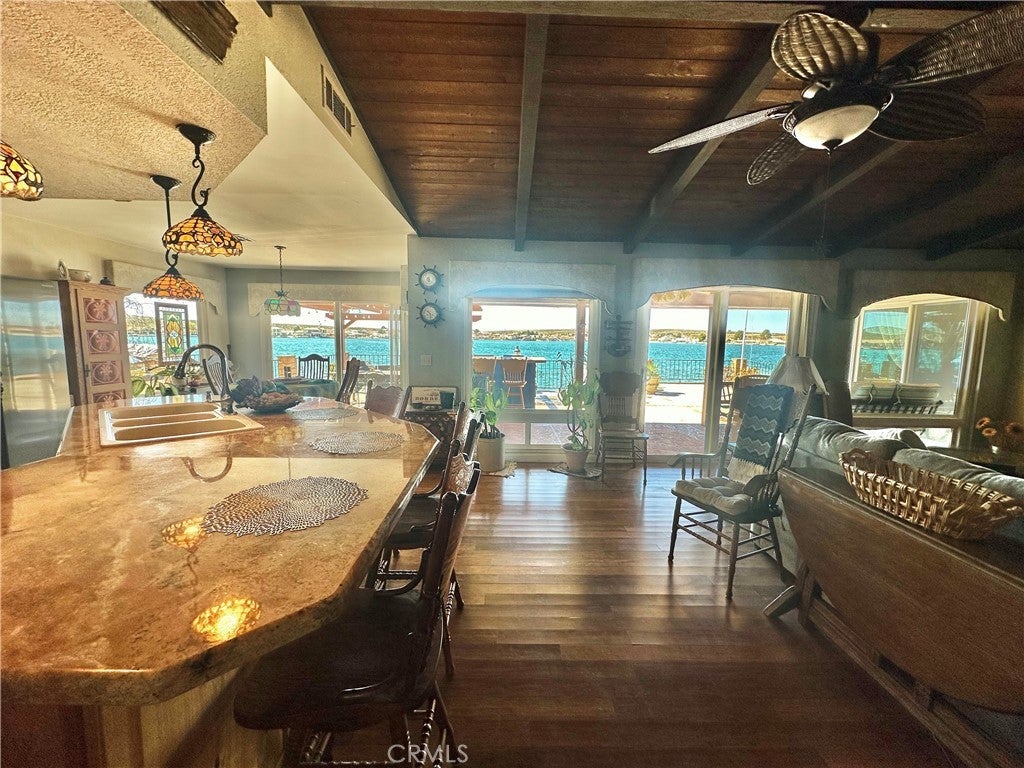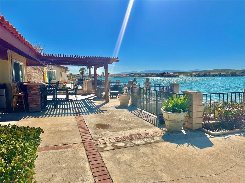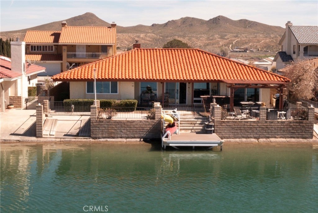 *JUST LISTED!* Encounter stunning sunset views ON THE OPEN WATER every evening from your back patio. If you have been looking for a house right on the lake, this may be the one. This charming 2 bedroom 2 bath home features a delightful courtyard entry area and a perfect layout with each bedroom and bath on separate sides of the home. The living room boasts gorgeous vaulted wood beam ceilings and a grand brick fireplace that looks out to glimmering lake views. It is truly an entertainer’s kitchen with custom tiling and oak cabinetry throughout. The dining area looks out onto the lake with 180 degree views and sliding glass doors for easy access to the back patio. The primary suite is exquisite, with spacious walk-in closet, custom shower and heated floors in the bathroom, sliding doors to patio, it’s own heating and cooling unit, and phenomenal water views every time you wake up. Lush landscaping and roses set the tone of the patio seating area in your new backyard paradise, ready for barbecues and entertaining. Mature olive, avocado, apple, cherry plum, and crepe myrtle trees surround the property and fresh star jasmine and lemon verbena are planted to delight your senses. The backyard includes it’s own deck on the water and boat launch! Aside from the great features at the house, you’ll also gain access to all of the wonderful community amenities of Silver Lakes including 27-hole championship golf course, pool, jacuzzi, tennis, pickle ball, and volleyball courts, outdoor recreation parks and fields, library, gym, equestrian center, and members only lake access.