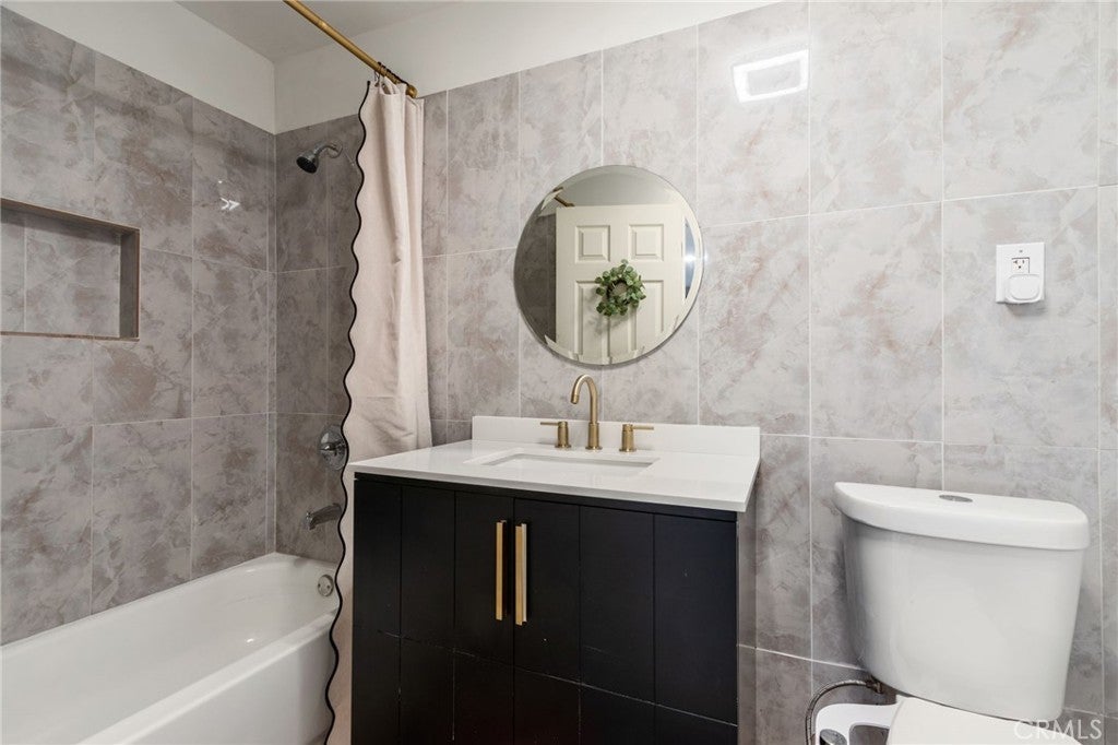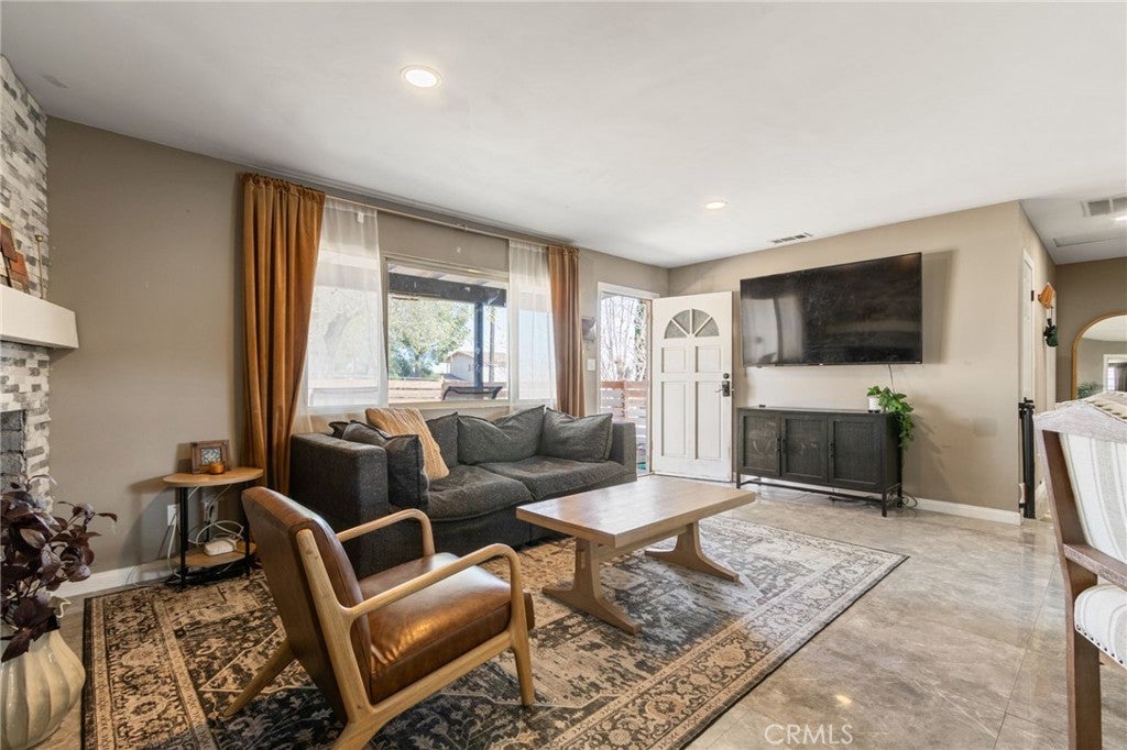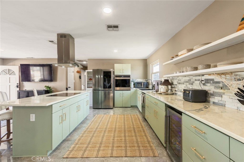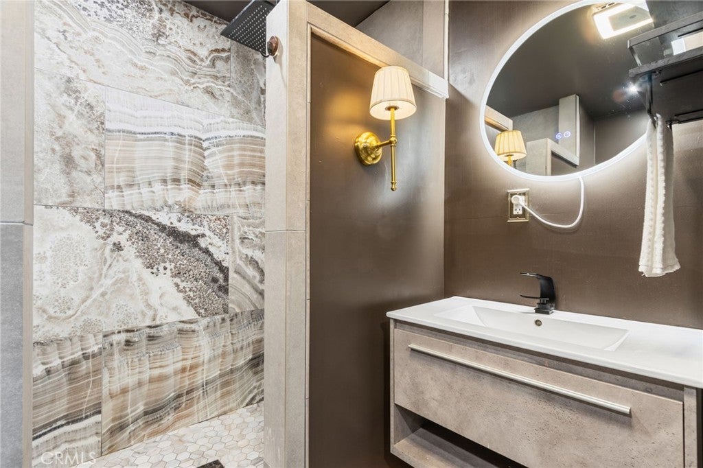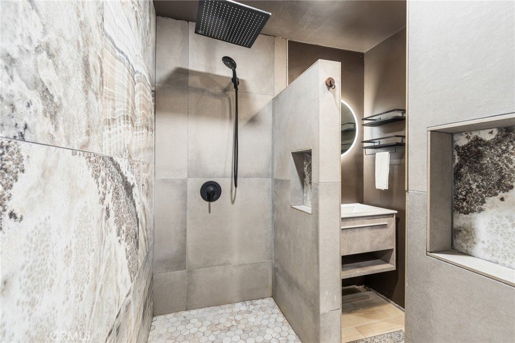 DOUBLE MASTER BEDROOMS! This beautifully remodeled home offers a rare dual primary suite layout, ideal for extended family, guests, or flexible living arrangements. One of the primary bedrooms was thoughtfully converted into a private suite from the garage space and features its own bathroom, closet, and built-in wall safe. The second primary bedroom showcases a stunning upgraded bathroom with three shower heads, creating a spa-like experience. Bathrooms also feature built-in Bluetooth speakers and customizable lighting controlled through a smartphone app. Property records reflect 2 bedrooms, 2 bathrooms, and approximately 1,000 sq ft. After renovations, the home is currently configured as 3 bedrooms, 3 bathrooms with approximately 1,627 sq ft of living space. Conversion and square footage may not be reflected in public records; buyer to verify permits and all information to their satisfaction. The home features a modern open layout with polished porcelain flooring and smooth drywall finishes throughout. The kitchen includes epoxy countertops, soft-close cabinetry, floating shelves, an electric cooktop on the island, electric wall oven, dishwasher, and a built-in wine cooler beverage fridge, making it perfect for entertaining. Major system upgrades include new electrical wiring with recessed lighting throughout, a full-home PEX re-pipe with new ABS drains, and an energy-efficient tankless water heater. Step outside to a backyard designed for gatherings, featuring a built-in barbecue with natural gas hookup, a kids’ sandbox area, and a propane gas fire pit table—perfect for relaxing or entertaining. A must-see home offering modern upgrades and flexible living space!