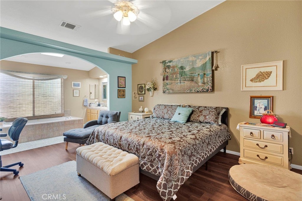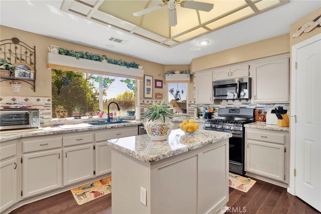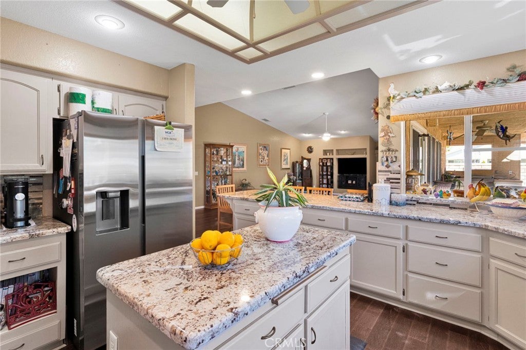 Welcome to a home where pride of ownership truly shines. Offered for the first time in over 25 years by its original owners, this beautifully maintained property, built by Leisure Homes, is a rare find in Silver Lakes. From the moment you arrive, you’re greeted by a gated front porch with a charming garden, mature cherry and pear trees, automatic sprinklers, and an inviting entry featuring an iron front door screen. Inside, the home boasts five-year-old luxury vinyl plank flooring throughout and an open-concept layout designed for both comfort and entertaining. The living room showcases vaulted ceilings with decorative pot shelves, is pre-wired for speakers, and centers around a cozy gas fireplace with a tile surround and log insert. The adjacent dining area flows seamlessly into the kitchen, which offers granite countertops, abundant storage, a pantry, stainless steel appliances, a glass backsplash, and a charming “pass-through” window to the backyard—perfect for entertaining. Additional highlights include an indoor laundry room with a built-in ironing board, ample hallway storage, and a custom built-in display for your favorite pieces. The primary suite is a relaxing retreat featuring LVP flooring, pot shelves with up-lighting, and custom built-ins. The primary bathroom includes dual hammered copper sinks, a jetted soaking tub, a separate tiled shower, and a private water closet. Bedrooms two and three also feature LVP flooring, while the guest bathroom offers upgraded tile finishes and a newer toilet/bidet. Step outside to a backyard designed to enjoy the beauty of Silver Lakes, complete with a covered patio, built-in barbecue, grassy area, rose bushes, and breathtaking sunrise views. Additional bonus: paid solar for energy efficiency. Sellers are motivated and will require a replacement home—