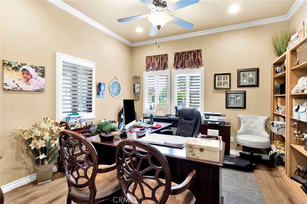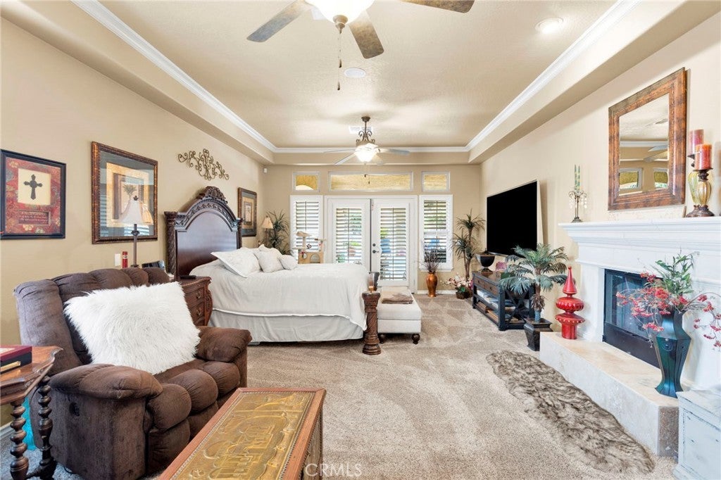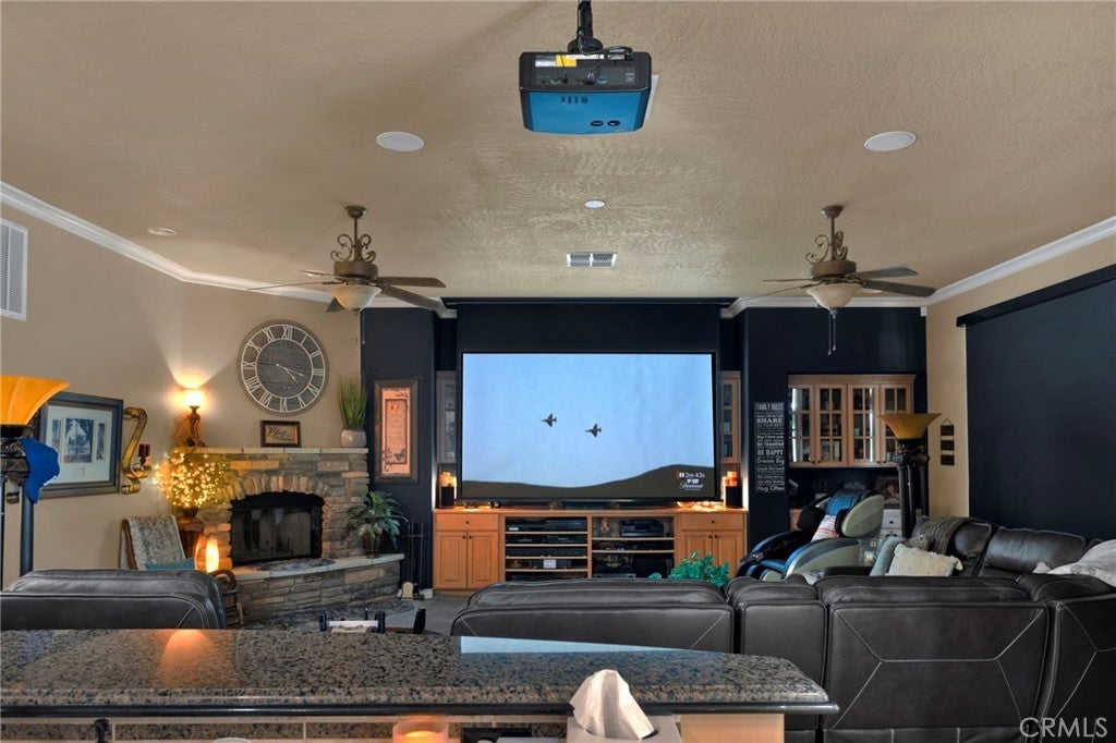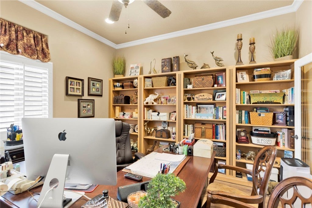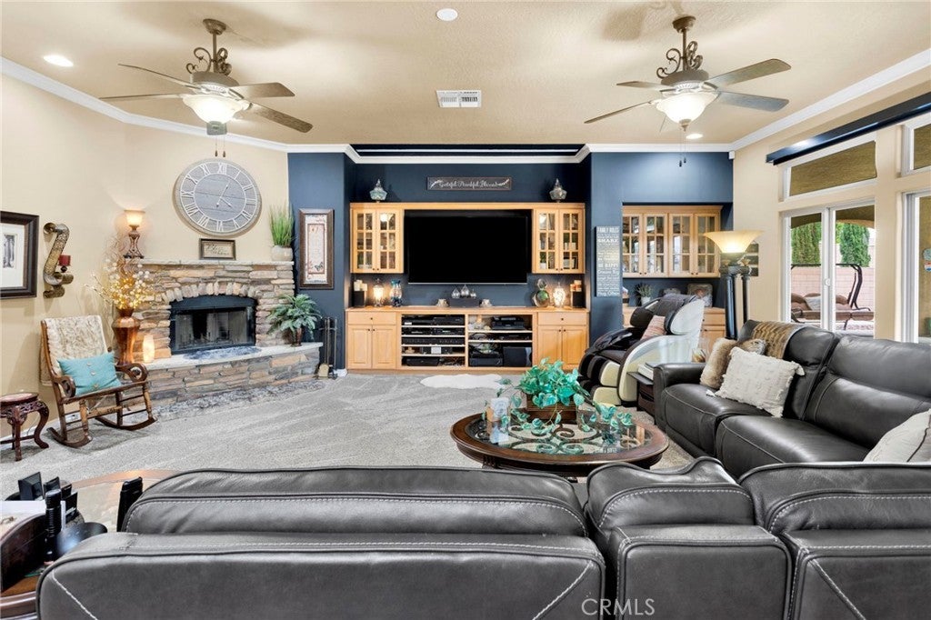 Open and bright 4 bedroom and office/den with 3 full and one half baths. Gated courtyard leads to grand entry and large living/great room off of open kitchen with stainless steel dual ovens, warming drawer, built-in refrigerator, massive 8 burner cooktop stove, trash compacter, microwave, vent hood, double dishwasher and an additional sink area in the large center island. Great formal dining room with butler's pantry attached includes a wine cooler and lots of storage. Dining room with fireplace opens to front courtyard. Large primary suite with another fireplace has attached bath consisting of jetted tub, huge walk-in shower with dual shower heads and pass through master closet with built-in cabinets. Wood shutters throughout, ceiling fans in all rooms with 10" ceilings. Crown molding in kitchen, master bedroom, office and living room, newer carpet and luxury vinyl wood flooring in several rooms. Living room has ceiling projector with drop down and motorized 120" built-in TV with surround sound and components. Living room black-out shades are motorized as well as small entry windows. Off of the primary suite is an office/den with a wall of built-in cabinets and faces the front of the home. East side of home consists of 3 additional bedrooms, one with a private bath and a central bath in the hallway. Indoor laundry room has lots of storage and a hook up and space for an additional refrigerator. Laundry leads to one car garage that opens to another 3 car garage. Expansive driveway provides ample parking for additional vehicles, and RV and boat. Outside, enjoy a private covered pool and spa, lots of concrete patio areas and mature landscaping. Enjoy all the amenities Stonebrook Estates has to offer. Quiet and serene, private and secure! Come see for yourself!!