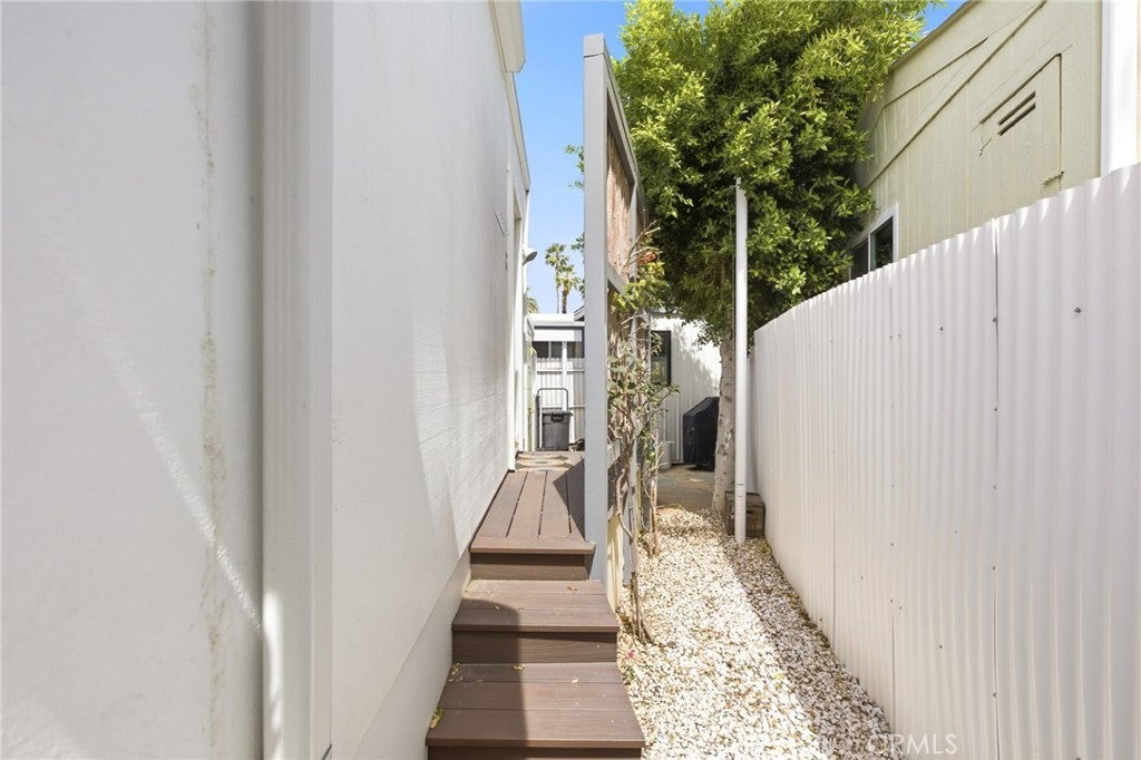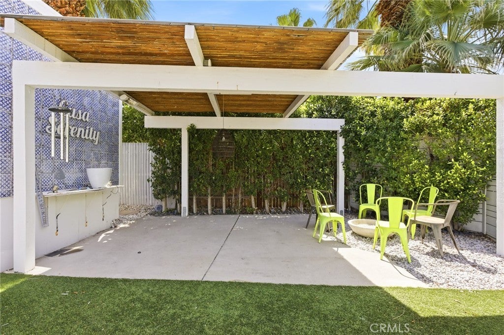 Wake up to sweeping mountain views from this charming DOUBLE-LOT RETREAT in the peaceful Warm Sands community. This thoughtfully designed home offers 690 sq ft of stylish living space with PLUS A DETACHED GUEST ROOM PERFECT FOR VISITORS, A STUDIO, OR PRIVATE WORKSPACE. The property welcomes you with a covered patio, spacious cement and wood deck, and a unique outdoor soaking tub—an inviting setting to relax and take in the desert sky. Inside, the home blends modern style with warmth, featuring hardwood laminate flooring, quartz and wood countertops, crisp white appliances with elegant gold accents, sleek cabinetry and fixtures, and ceiling fans throughout. The custom bathroom showcases beautiful inlaid tile and modern finishes that create a timeless look and feel. Ramon Mobile Home Community 55+ offers a peaceful, quiet setting with nearby grocery stores, restaurants, and cafés for everyday convenience, along with bike-friendly streets, nearby schools, and easy access to parks and green spaces—making this property not just a home, but a lifestyle.
