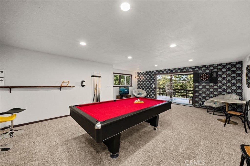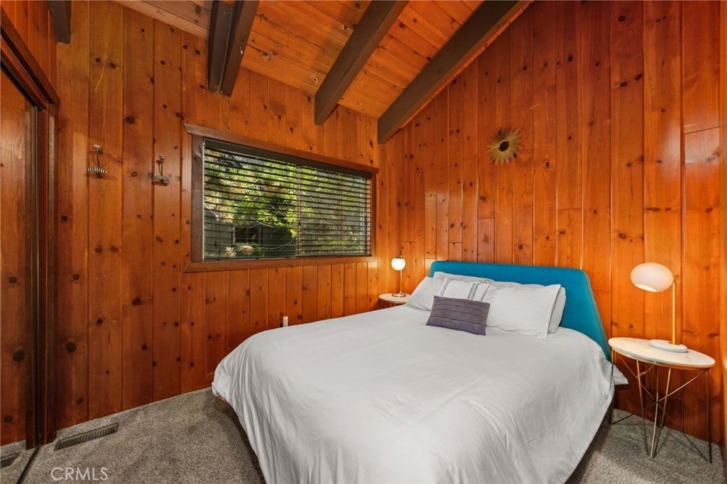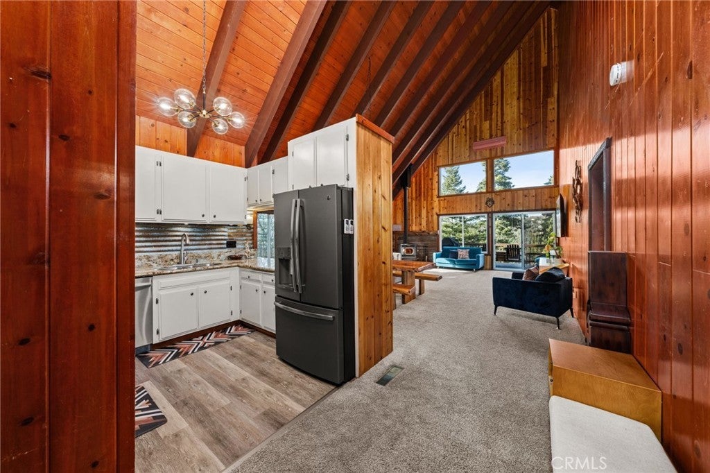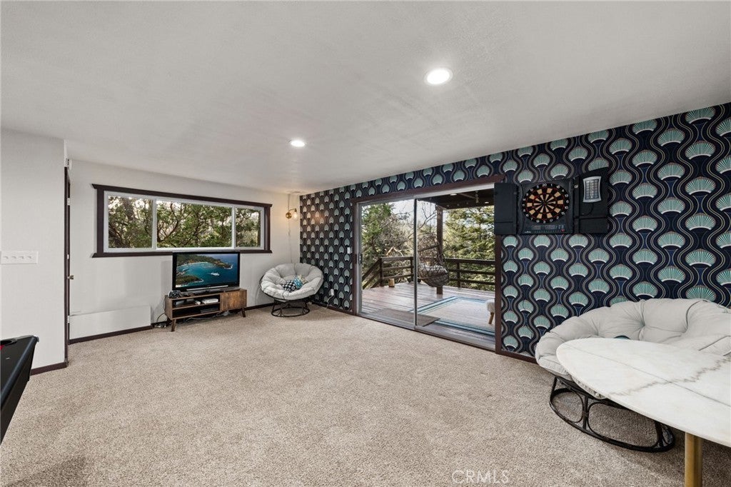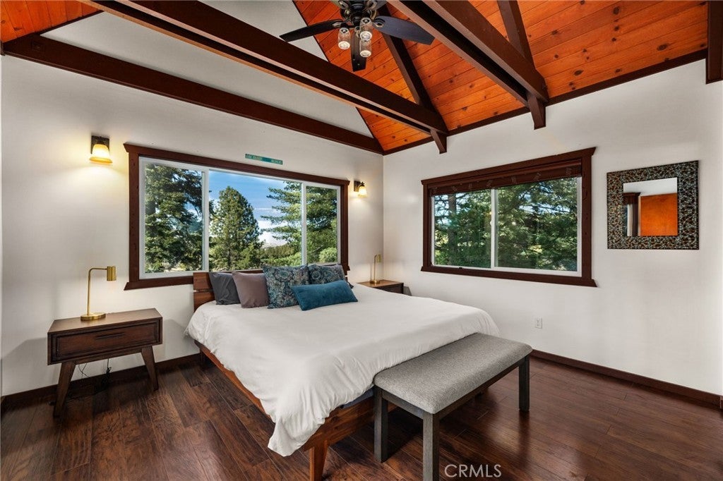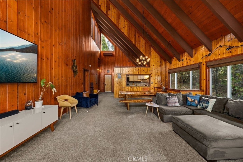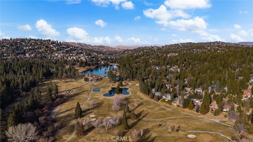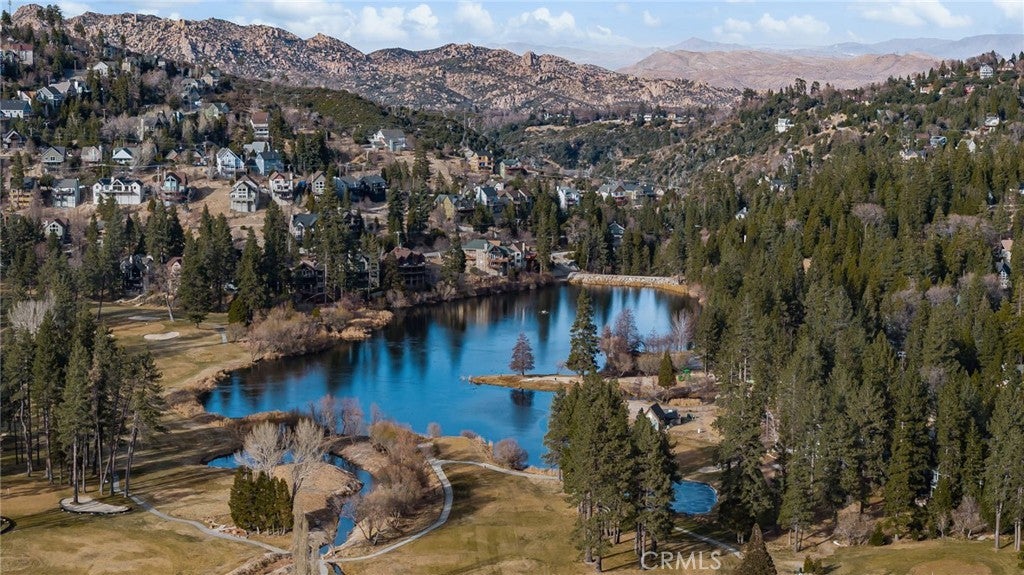 ICONIC ... this lakeview modified A-frame exemplifies modern architecture and aesthetics - while simultaneously capturing the essence of mountain living! Situated on a cul-de-sac with level entry, a 2 car attached garage, golf course adjacent and boasting a 1/3 acre lot of pristine forest ~ this home is being sold fully furnished! While the exterior of the home presents expressive lines & dramatic effect ... the interior is truly inspiring. Expansive ceilings seem to soar forever allowing for the multitude of windows to cast their spells of wonder - as you watch the nature around you unfold and the skies morph into remarkable works of art. A modern open concept design dominates the main level and is highlighted by an updated kitchen with newer appliances, newer dual pane windows and a towering fireplace. A custom wooden plank dining table is a perfect complement to the contemporary elements that punctuate this home. A total of 3 bedrooms and a hall bathroom complete this floor - with each of the secondary bedrooms featuring the cathedral ceilings present in the main living areas. The primary suite is stunning - with expansive ceilings, exposed wooden trusses and views of the golf course and lake. The primary suite also features access to the upper deck ... where you'll find uncompromising views and open skies. As you descend to the lower level, you'll notice a transformation from warmer/richer wood tones to a brighter lighter space that's been designed for the perfect entertaining area. Able to accommodate a large game or family room - this design can also be applied to host multiple families or guests, while allowing them to still enjoy an elevated mountain experience - including another deck that's even larger that its upper counterpart and provides access to the fenced in backyard and another patio space. This level features 2 bedrooms and a full bathroom with tons of additional storage and potential expansion/design possibilities. Thinking of designing separate living quarters with its own entrance - this would be your perfect canvas! An exquisite Lake Arrowhead property includes LAKE RIGHTS, two ductless air conditioning systems and is less than 10 minutes from Lake Arrowhead Village and even closer to downtown Blue Jay. This highly coveted location also places you just down the street from the Lake Arrowhead Country Club and Grass Valley Lake. This truly eclectic work of art is ready to inspire its next owners ... the wilderness is beckoning!
