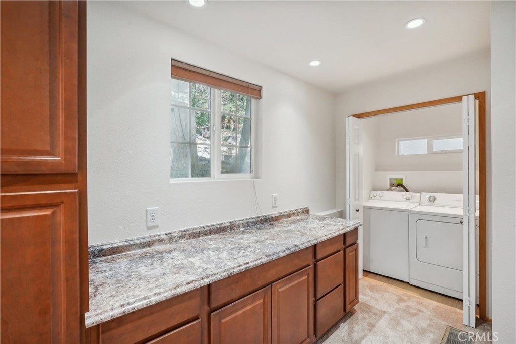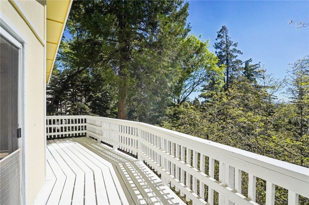 Welcome to Daffodil Cottage, a private mountain retreat in Twin Peaks, CA offering sweeping forest and distant mountain views the moment you walk through the door. Expansive sliding glass walls flood the open-concept main level with natural light, highlighting the cozy fireplace, dining area, and kitchen—all thoughtfully designed for comfort and connection. A full bath is cleverly tucked away on this floor, while downstairs you'll find two bedrooms, including one with an en-suite bath and a convenient laundry area. A separate building on the property offers flexible potential as a creative studio, workshop, or guest space. Recent renovations include new luxury vinyl plank flooring and carpet, fresh interior paint, updated appliances, and more—making this home truly move-in ready. Whether you're escaping for the weekend or embracing full-time mountain living, you'll enjoy all four seasons in one of Southern California's most peaceful and scenic locations. Experience a lifestyle shift—away from the noise, closer to nature—at Daffodil Cottage.