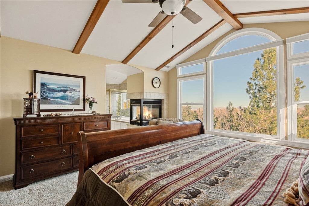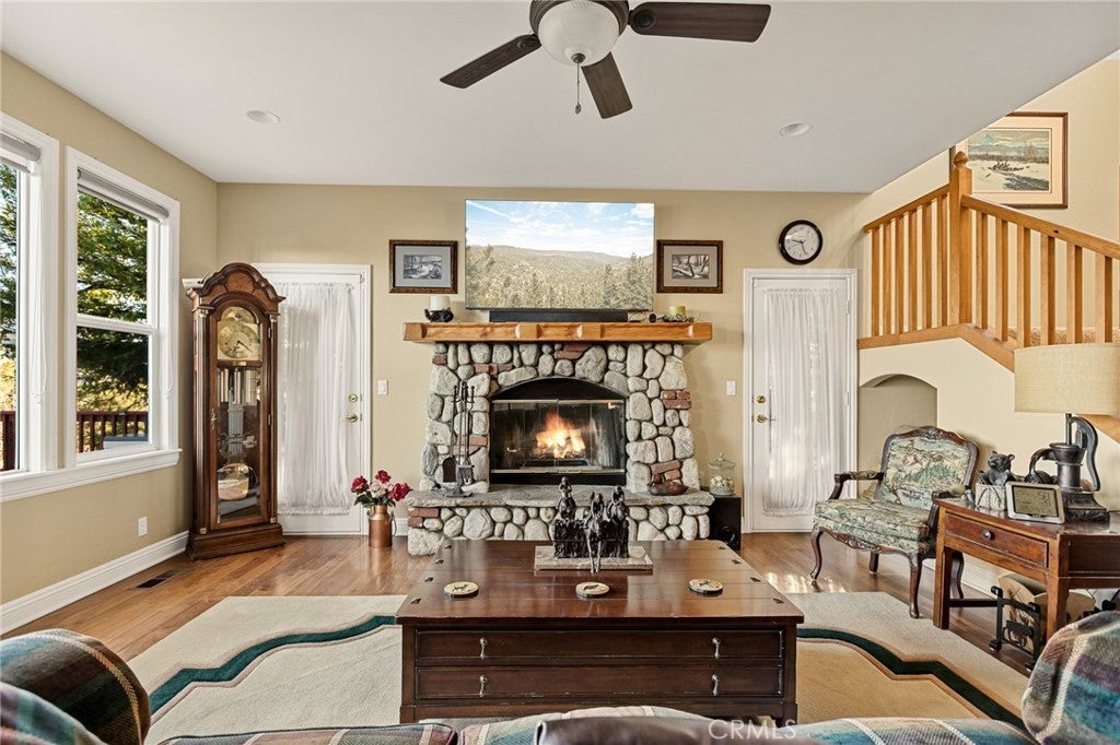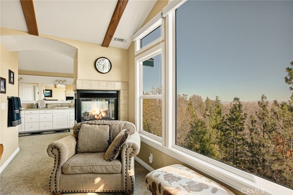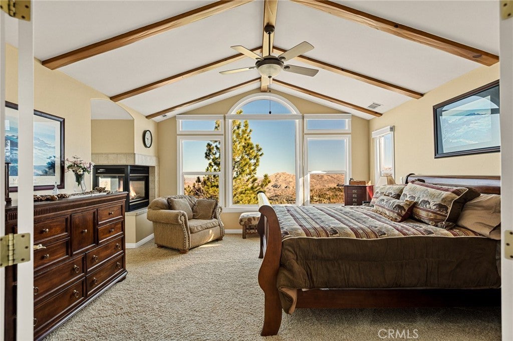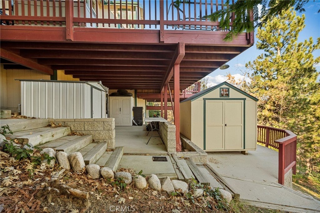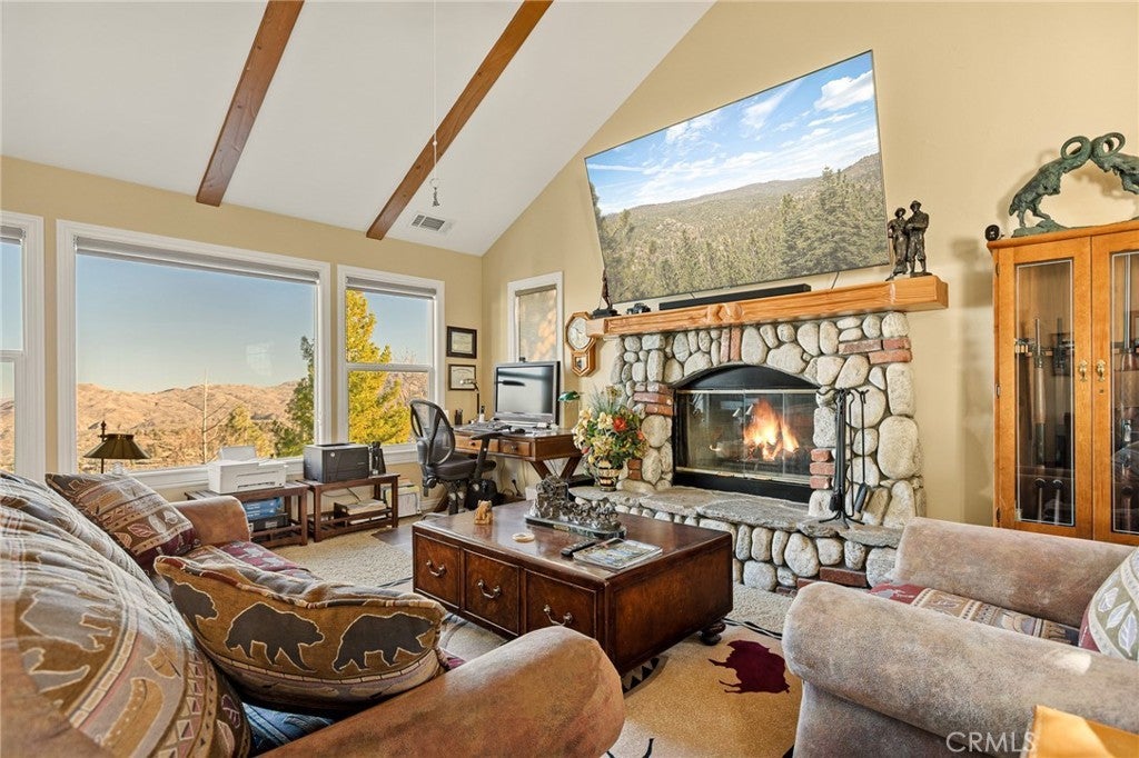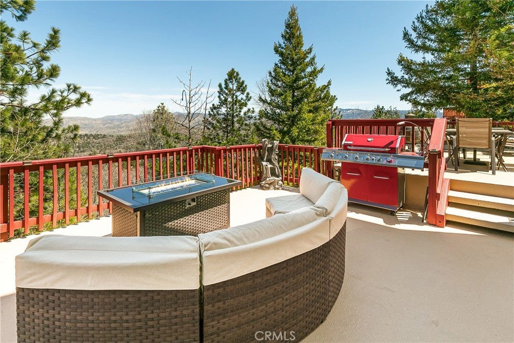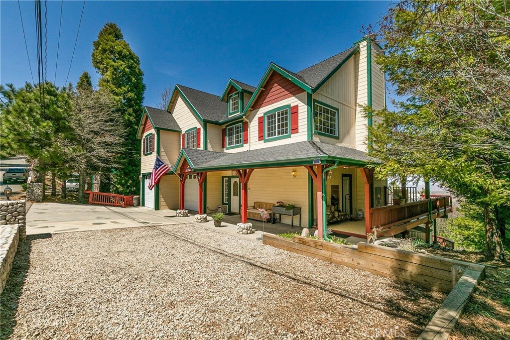 A Rare Mountain Gem with Views That Will Take Your Breath Away. Tucked away in a peaceful, low-traffic neighborhood, this mountain retreat offers the kind of views that are truly indescribable—like stepping into a painting. With 180-degree panoramic vistas stretching across forested ridgelines, the high desert, and twinkling city lights, you’ll find serenity and inspiration from every window. Plus, this home includes coveted lake rights to Lake Arrowhead—adding even more value to mountain living. Enjoy true level entry—a prized feature in snowy mountain communities—with not a single step to the front door. A large driveway able to hold 8 cars, deep two-car garage, and bonus RV parking or boat storage make this home as functional as it is beautiful. Inside, the cozy yet open living room welcomes you with rich hardwood floors, a striking river rock fireplace, and expansive windows that perfectly frame the show-stopping views. A spacious dining area flows into the charming farmhouse-style kitchen featuring white cabinetry, granite countertops, and stainless steel appliances—perfect for hosting holidays and special gatherings. The outdoor living space rivals the interior, with several distinct entertaining decks—all finished with a weatherproof surface for year-round use and durability. Whether you're enjoying al fresco dinners, sipping morning coffee, or relaxing under the stars around the firepit, every space was thoughtfully designed to take full advantage of the incredible views. Upstairs, all bedrooms await along with a flex space perfect for game nights, movie marathons, or additional sleeping. This bonus room features vaulted ceilings, a fireplace, and some of the best views in the house. The primary suite is a true retreat with ample space for a king bed, a double-sided fireplace shared with the ensuite bath, and more stunning views of the National Forest. The bathroom includes a soaking tub, walk-in shower, dual vanities, and a huge walk-in closet with attic access. Two more spacious bedrooms and a stylish full bath are just down the hall. Below the home is a third level for storage or potential expansion, and additional outdoor sheds are perfect for tools, gear, or seasonal décor. A private access road below offers even more flexibility, ideal for off-road vehicle storage. AC, generator, & lake rights. Whether you’re looking for a full-time residence, second home, or future short-term rental, this property checks every box. Comes fully furnished.