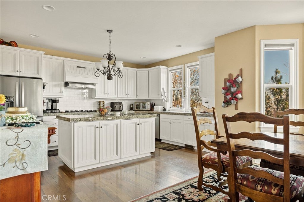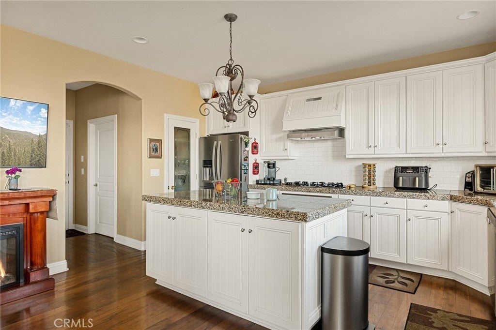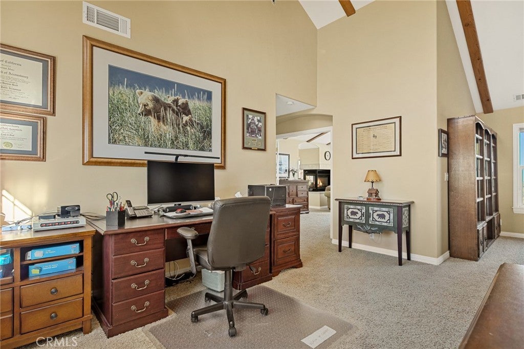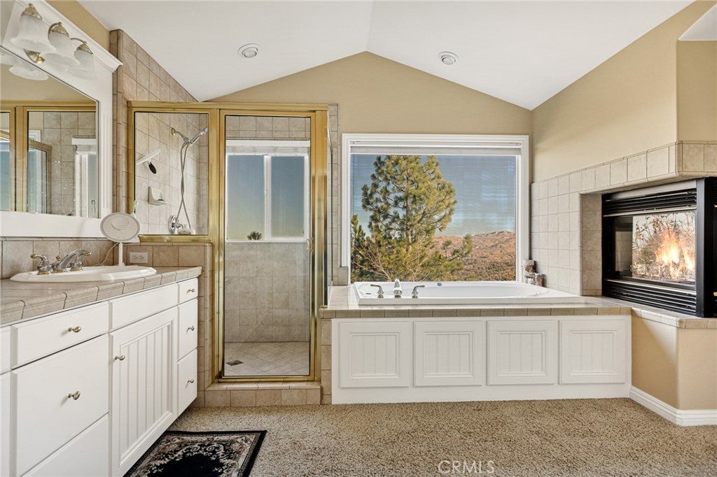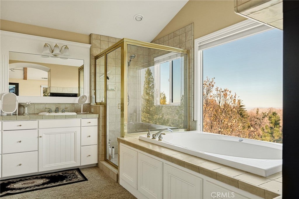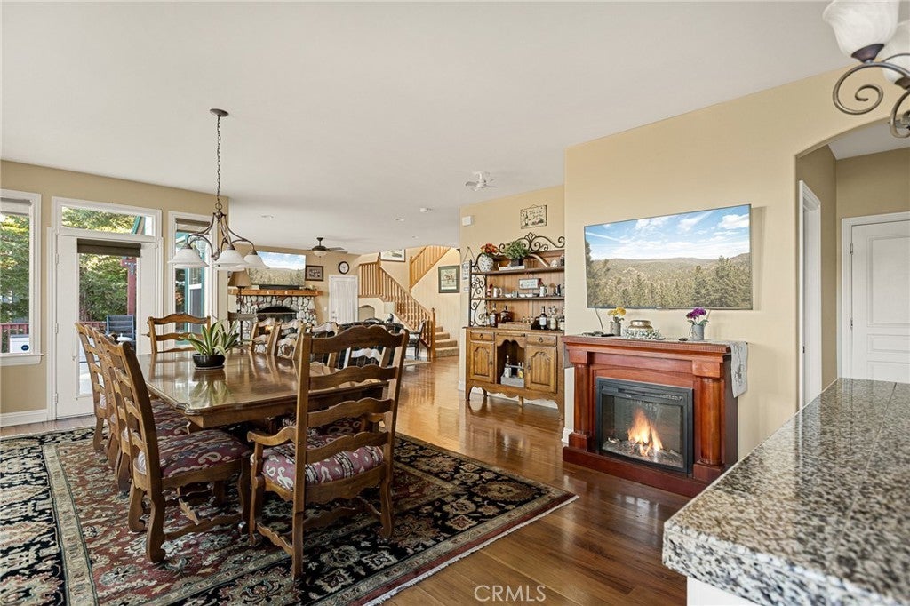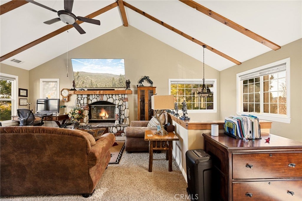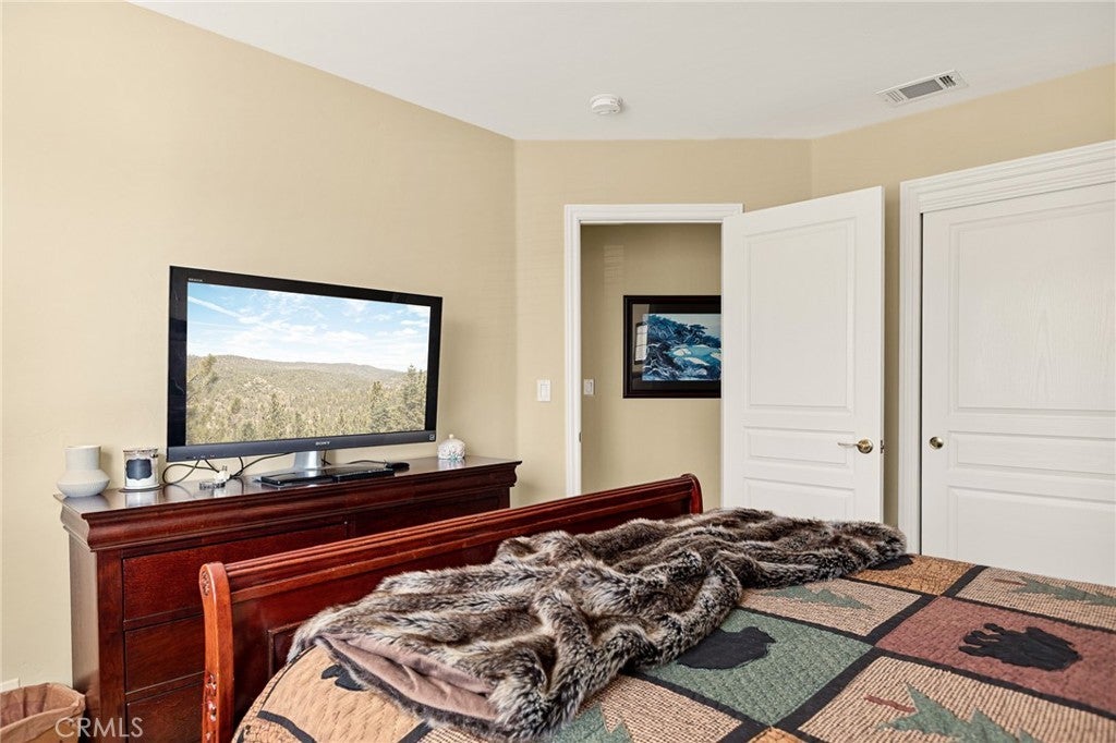 A Rare Mountain Gem with Views That Will Take Your Breath Away. Tucked away in a peaceful, low-traffic neighborhood, this mountain retreat offers the kind of views that are truly indescribable—like stepping into a painting. With 180-degree panoramic vistas stretching across forested ridgelines, the high desert, and twinkling city lights, you’ll find serenity and inspiration from every window. Plus, this home includes coveted lake rights to Lake Arrowhead—adding even more value to mountain living. Enjoy true level entry—a prized feature in snowy mountain communities—with not a single step to the front door. A large driveway able to hold 8 cars, deep two-car garage, and bonus RV parking or boat storage make this home as functional as it is beautiful. Inside, the cozy yet open living room welcomes you with rich hardwood floors, a striking river rock fireplace, and expansive windows that perfectly frame the show-stopping views. A spacious dining area flows into the charming farmhouse-style kitchen featuring white cabinetry, granite countertops, and stainless steel appliances—perfect for hosting holidays and special gatherings. The outdoor living space rivals the interior, with several distinct entertaining decks—all finished with a weatherproof surface for year-round use and durability. Whether you're enjoying al fresco dinners, sipping morning coffee, or relaxing under the stars around the firepit, every space was thoughtfully designed to take full advantage of the incredible views. Upstairs, all bedrooms await along with a flex space perfect for game nights, movie marathons, or additional sleeping. This bonus room features vaulted ceilings, a fireplace, and some of the best views in the house. The primary suite is a true retreat with ample space for a king bed, a double-sided fireplace shared with the ensuite bath, and more stunning views of the National Forest. The bathroom includes a soaking tub, walk-in shower, dual vanities, and a huge walk-in closet with attic access. Two more spacious bedrooms and a stylish full bath are just down the hall. Below the home is a third level for storage or potential expansion, and additional outdoor sheds are perfect for tools, gear, or seasonal décor. A private access road below offers even more flexibility, ideal for off-road vehicle storage. AC, generator, & lake rights. Whether you’re looking for a full-time residence, second home, or future short-term rental, this property checks every box. Comes fully furnished.