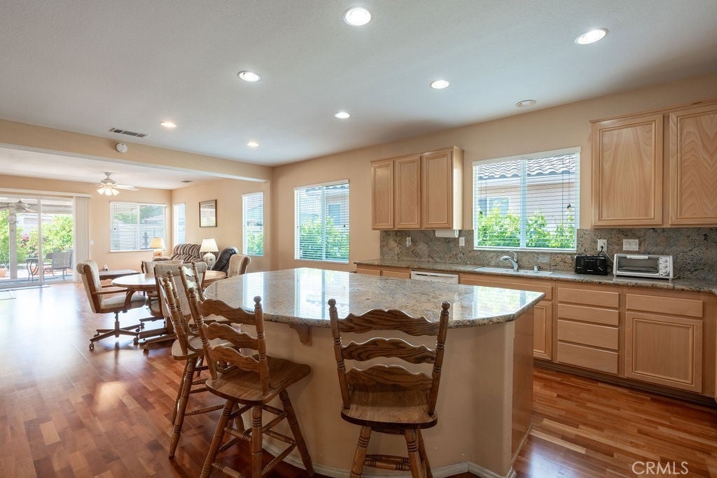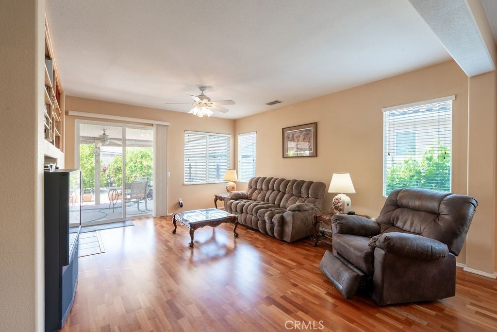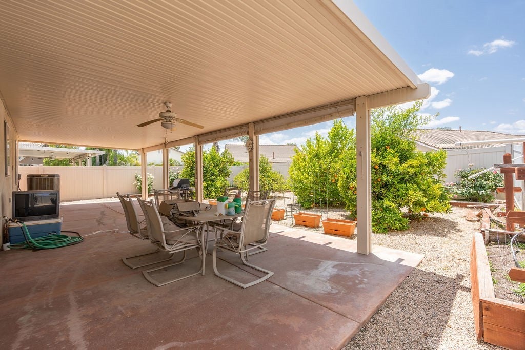 Relaxed Resort-Style Living in The Oasis – 55+ Community Welcome to The Oasis, where active adult living meets comfort and style! This charming 2-bedroom, 2-bathroom home PLUS OFFICE THAT CAN BE MADE A THIRD BEDROOM- offers the perfect blend of functionality and peaceful retreat. Step inside to a spacious kitchen featuring a large center island, ideal for casual meals, entertaining guests, or your next culinary adventure. The open-concept layout provides a seamless flow into the dining and living areas—bright, welcoming, and thoughtfully designed. Enjoy the outdoors year-round under the expansive covered patio, complete with a durable Alumawood cover for shade and comfort. The beautifully landscaped backyard is a true gem, featuring fruit trees and a well-tended garden—perfect for those with a green thumb or anyone who enjoys the simple pleasures of nature. Located in the gated, amenity-rich Oasis community, residents enjoy access to a golf course, pool, spa, fitness center, clubhouse, and social events—all designed with lifestyle and leisure in mind. Whether you’re looking to downsize, simplify, or just enjoy a vibrant 55+ lifestyle, this home offers it all in a beautifully maintained setting