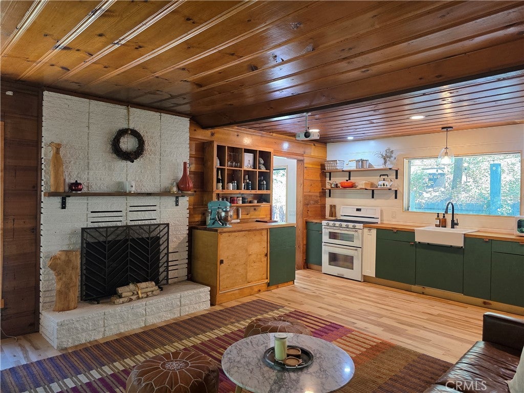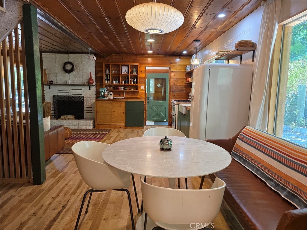 Step into the kind of storybook cabin that makes you believe in second chances—for homes, and maybe even people. Tucked into the trees on .60 acres, 606 Crest Estates Drive is a fully updated 100-year-old mountain retreat that still holds all the soul of its original architecture. The main house offers 3 bedrooms and 1 full bath, with a spacious bedroom on the main level and two more upstairs tucked under charming sloped ceilings with exposed beams. Recent updates (kitchen, bath, windows, roof, paint, floors—yes, all of it within 2 years) meet old-world craftsmanship like carved wood walls and ceilings, and a grand white brick fireplace that anchors the sun-drenched great room. The open kitchen features butcher block counters and retro-style appliances, blending function with charm. Upstairs, under sloped ceilings, two cozy bedrooms wait; getting there is half the fun thanks to a floating wood staircase with a cleverly concealed surprise for the curious. Downstairs, a separate-entry bonus space offers a studio layout with bath and kitchenette. Not coded for living, but perfect for creating—art, memories, or something more mysterious. There’s even a whisper of a hidden compartment, though what lies within is left to your imagination - or if you're the new steward of this home, for you to discover. A generous covered deck wraps the front of the home, while out back, a granite patio lets you dine or dream among the pines. Though only a mile from Lake Arrowhead Village, you’ll feel a world away.