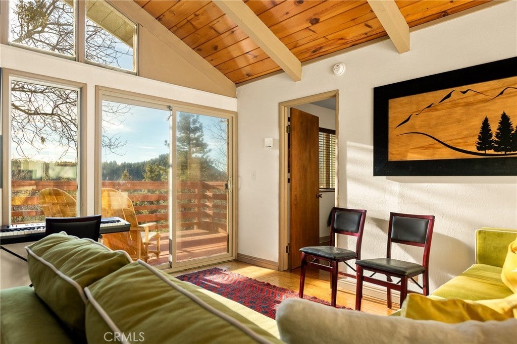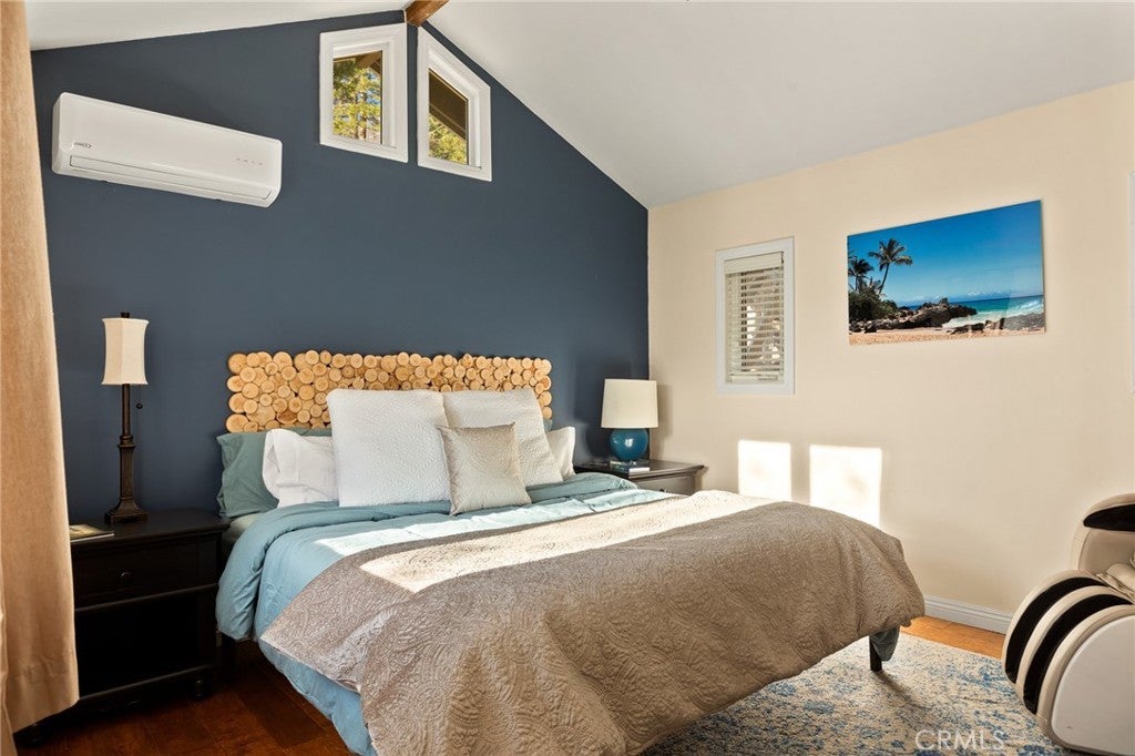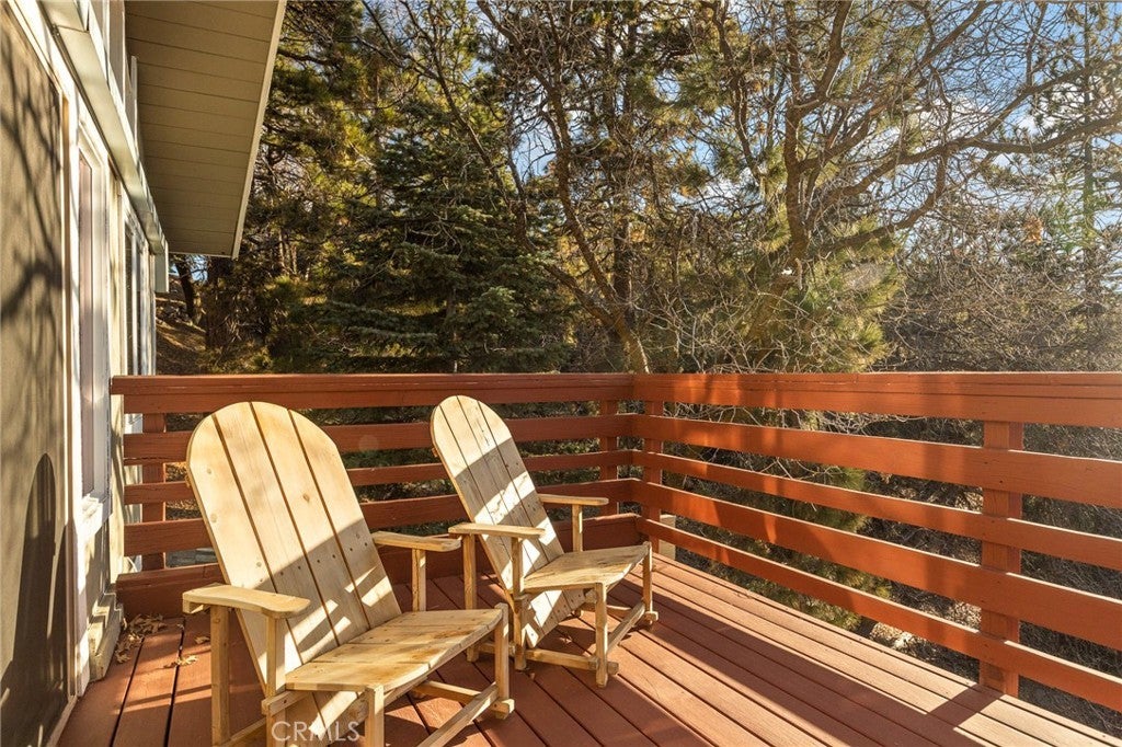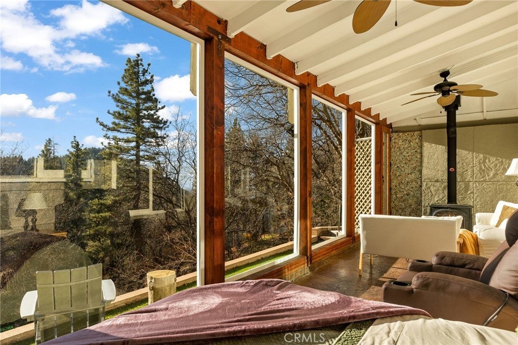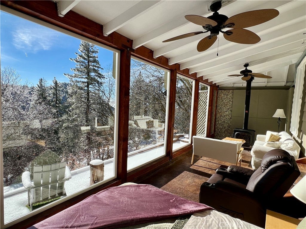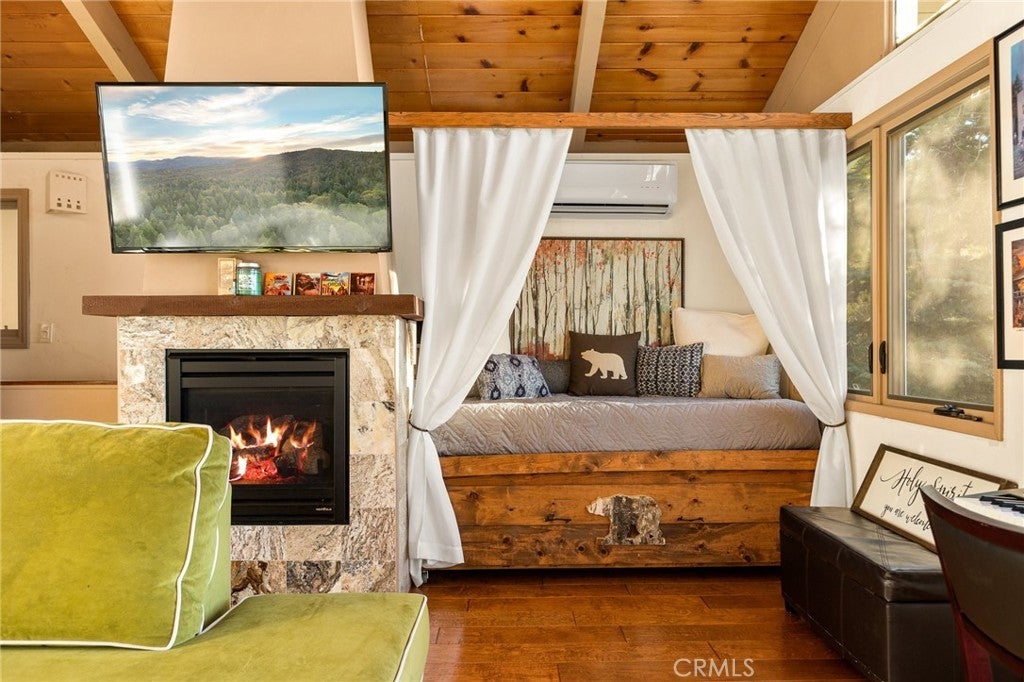 Nestled in the heart of Running Springs, this unique property is designed for those who crave tranquility and modern mountain living. Offering 3 bedrooms, 2 bathrooms, sunroom, three fireplaces, AC and amazing views! Step into the main level with primary bedroom, three-quarter bathroom, and open-concept living area with fireplace that flows seamlessly into the kitchen. The enclosed sunroom with wood burning stove is a standout feature on the main level, bathing the home in natural light and offering panoramic views of the surrounding forest, where towering pines and wildlife create a breathtaking backdrop. Upstairs you will find the additional two bedrooms, one of which has its own fireplace and custom built-in trundle bed. The second level also offers a full bathroom with laundry, and back deck with endless views. Outside, the large parking pad provides ample space for multiple vehicles making this home as practical as it is picturesque. Upgrades include new front retaining walls built in 2024, tankless electric hot water heater in 2022, and AC split units installed in 2020. Whether you’re a weekend adventurer or seeking a full-time mountain sanctuary, this property delivers unmatched charm and functionality. Conveniently located just one street over from local shops and dining, 15 minutes to Lake Arrowhead, and 25 minutes to Big Bear or Highland via Hwy 18 and Hwy 330. Schedule your private tour today and experience the magic of mountain living!