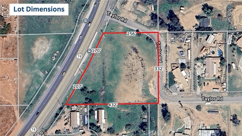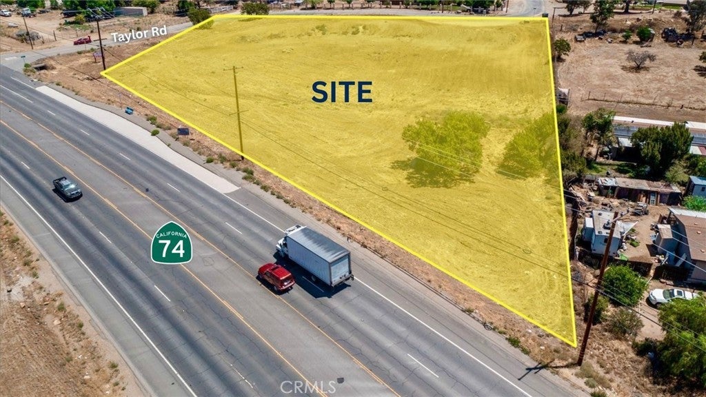 Prime 2.63 Acre Commercial Parcel on State Highway 74. This property has HIGH VISIBILITY with traffic counts exceeding 25,000 cars per day on the highway. Great potential for businesses as the land use designation for the county of Riverside shows COMMERCIAL RETAIL (CR). This property is also flat and easily developable. Very convenient location for businesses and commuting as you are on the main highway and can get to Riverside, Perris, Moreno Valley, Lake Elsinore and other cities very quickly, as well as a few minute drive from the 215 FWY and 15 FWY. You also have DUAL ACCESS points for ingress/egress for work vehicles, customers etc via Taylor Rd on the backside of property. WATER UTILITIES are readily available on both Hwy 74 and Taylor Road with EMWD, as well as edison POWER POLES existing on the street. Ideal for retail, service businesses, or commercial strip centers, this site presents a rare opportunity to capitalize on a high-traffic corridor in a rapidly growing market. Buyers to satisfy themselves as the the validity of any and all marketing information. LAND USE DESIGNATION MAP is downloadable in Supplements. APN#: 345-060-060