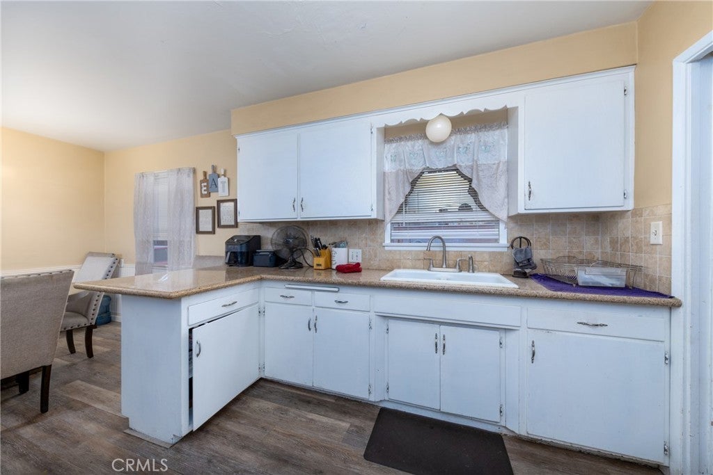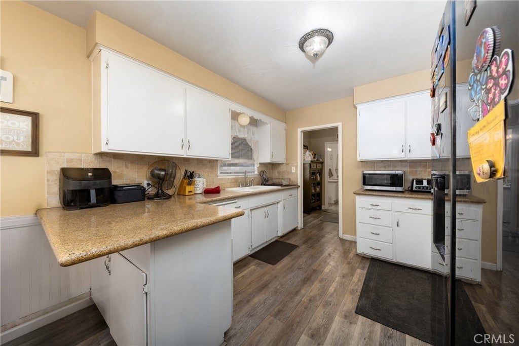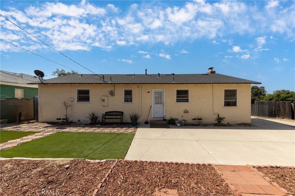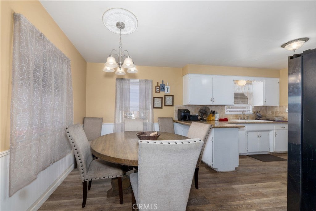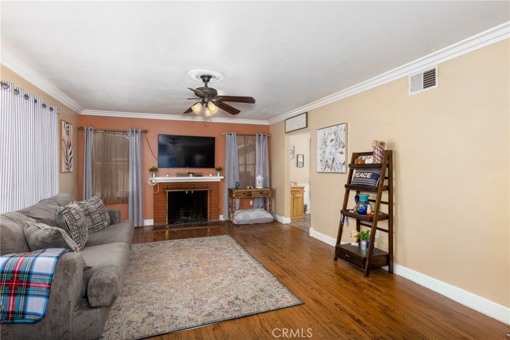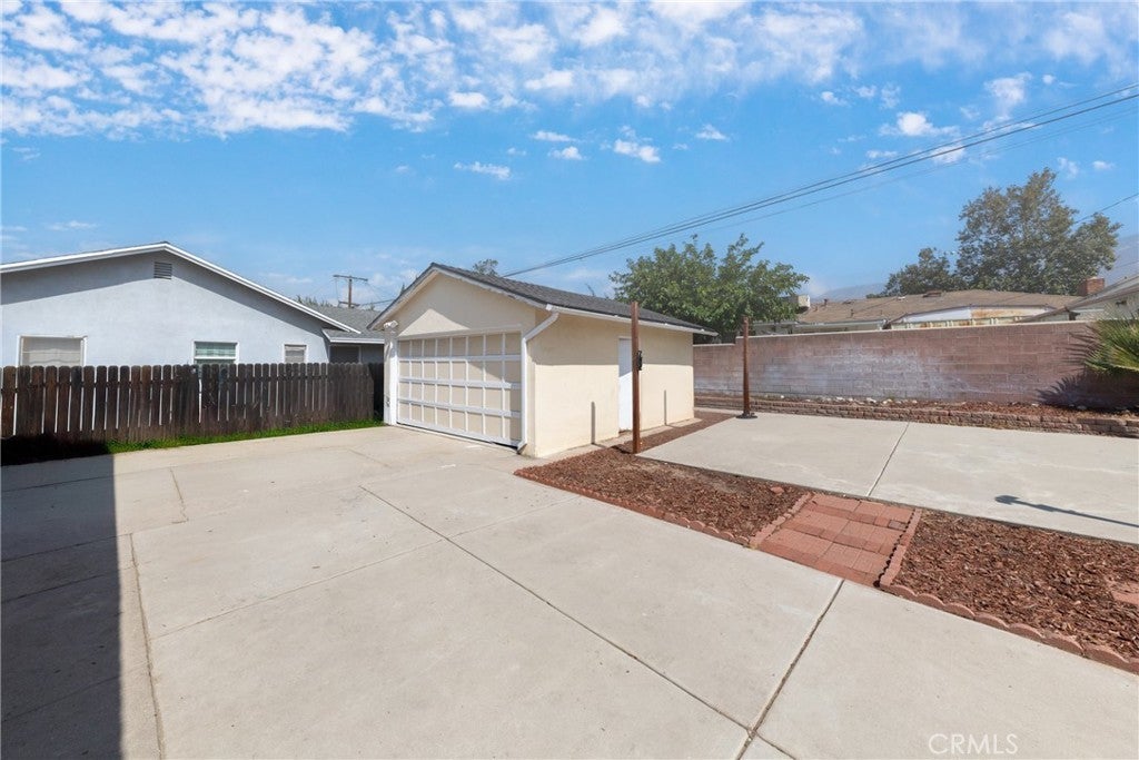 Charming home with stylish light fixtures, eat in kitchen dining area, granite counter tops in the kitchen and both bathrooms, tile flooring in the bathrooms, hardwood flooring in living room and hall, and stylish waterproof wood-laminate in kitchen and laundry room, carpet in all bedrooms. Nice fireplace in the living room, upgraded crown molding throughout, and baseboards/casings. The yard features mountain views, lots of space for gatherings, a fire pit, and requires minimal upkeep. Located near Arrowhead Country Club Golf Course, in a desirable neighborhood. North San Bernardino home situated on an attractive, tree-lined street. This home offers three bedrooms, two bathrooms, a detached two-car garage, and an extended driveway with RV parking.