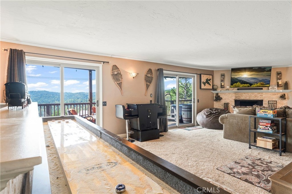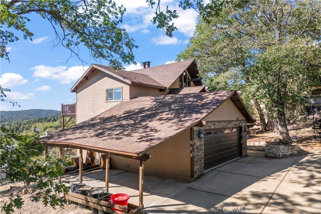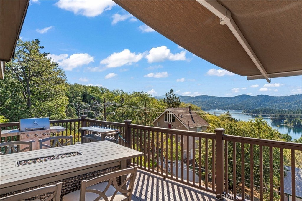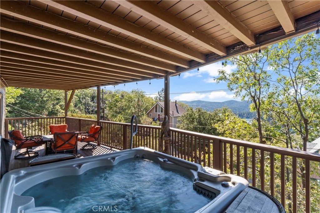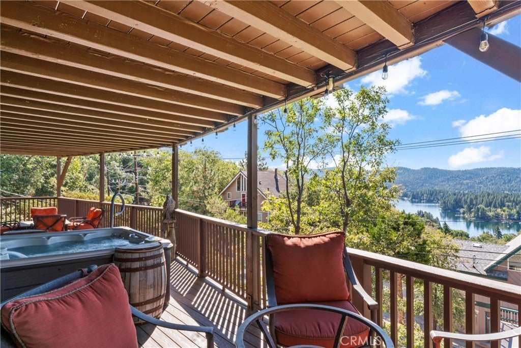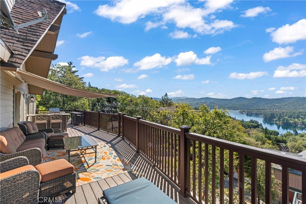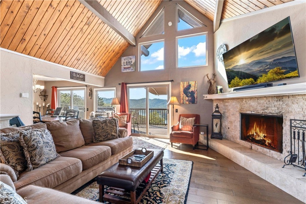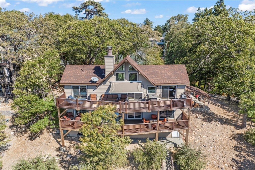 Panoramic Lake Views, Full Lake Rights, and Turnkey Luxury in Lake Arrowhead! This Lake Arrowhead lodge checks every box and more! Panoramic lake views, full lake rights, turnkey, and loaded with premium upgrades and features. Enjoy the new central heat & air, a whole-home generator, tankless water heater, and dual-pane windows & doors. Includes an EV charger, upgraded electrical panel, winter-ready water shutoff and pipe drain system, a private hot tub with lake views, a Sonos sound system throughout the whole house, a newly paved access road, rebuilt front steps, and a newer roof. Additional highlights include a finished two-car garage with a carport for parking up to 6 cars with even more room to park your boat or RV in front of the home. The open-concept floor plan is designed for both entertaining and relaxation. The spacious kitchen offers abundant storage and flows effortlessly into the dining area and oversized trex decks with built-in lighting. The great room features soaring vaulted wood-beamed ceilings, a floor-to-ceiling stone fireplace, and expansive glass doors that perfectly frame the lake views and fill the home with natural light. The main-level primary suite offers direct access to the deck—perfect for your morning coffee with a view! Downstairs, the lower level features a massive game room with a second fireplace, two guest bedrooms, a full bathroom, laundry area, and another expansive deck with a private hot tub. A separate bunk room on the third level provides extra sleeping space, complete with an electric fireplace, large-screen TV, and gym equipment. Sold fully furnished, decorated, and equipped for lake life, this home is a successful Airbnb rental, with income statements available for qualified buyers. A rare combination of location, amenities, and upgrades—this is lake living at its finest!