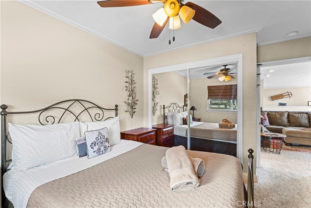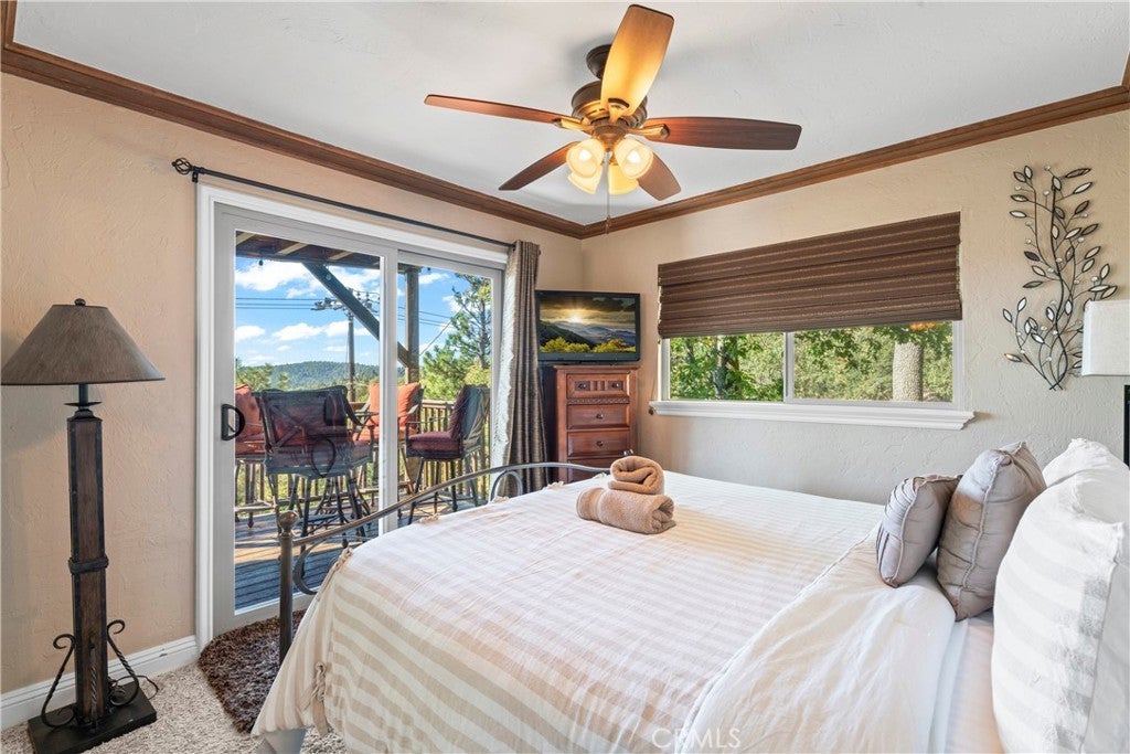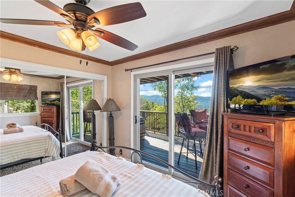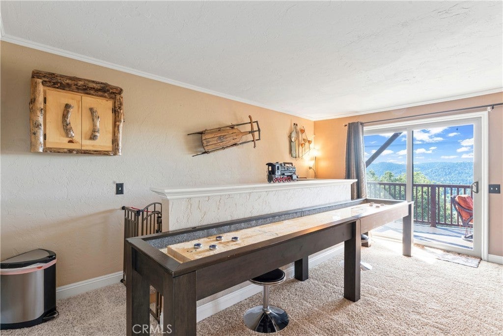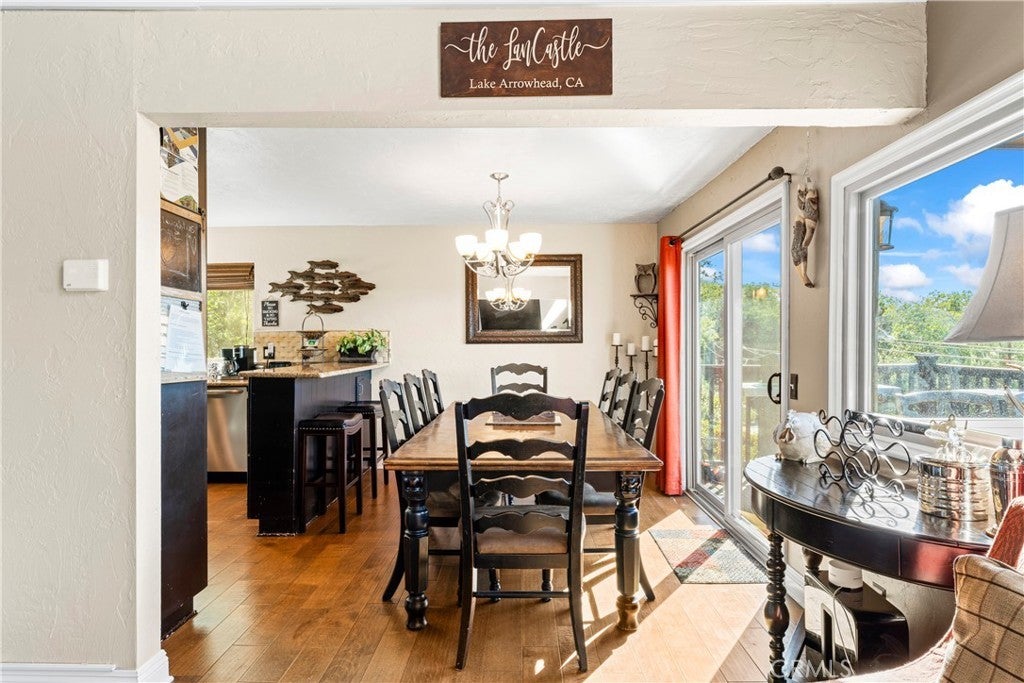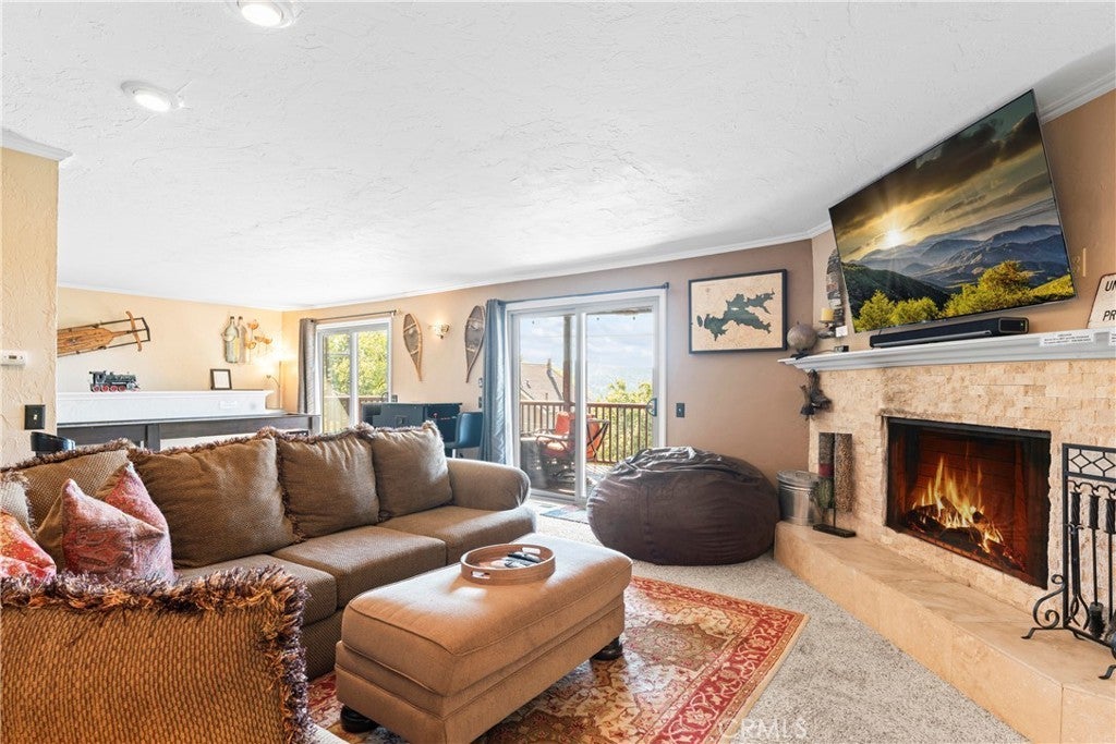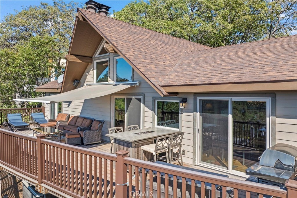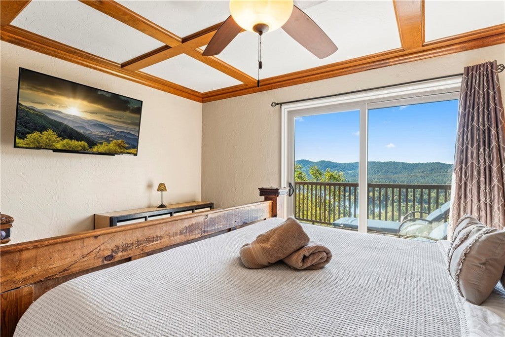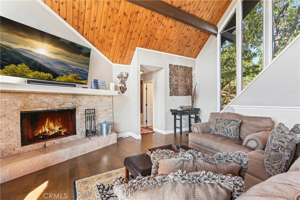 Panoramic Lake Views, Full Lake Rights, and Turnkey Luxury in Lake Arrowhead! This Lake Arrowhead lodge checks every box and more! Panoramic lake views, full lake rights, turnkey, and loaded with premium upgrades and features. Enjoy the new central heat & air, a whole-home generator, tankless water heater, and dual-pane windows & doors. Includes an EV charger, upgraded electrical panel, winter-ready water shutoff and pipe drain system, a private hot tub with lake views, a Sonos sound system throughout the whole house, a newly paved access road, rebuilt front steps, and a newer roof. Additional highlights include a finished two-car garage with a carport for parking up to 6 cars with even more room to park your boat or RV in front of the home. The open-concept floor plan is designed for both entertaining and relaxation. The spacious kitchen offers abundant storage and flows effortlessly into the dining area and oversized trex decks with built-in lighting. The great room features soaring vaulted wood-beamed ceilings, a floor-to-ceiling stone fireplace, and expansive glass doors that perfectly frame the lake views and fill the home with natural light. The main-level primary suite offers direct access to the deck—perfect for your morning coffee with a view! Downstairs, the lower level features a massive game room with a second fireplace, two guest bedrooms, a full bathroom, laundry area, and another expansive deck with a private hot tub. A separate bunk room on the third level provides extra sleeping space, complete with an electric fireplace, large-screen TV, and gym equipment. Sold fully furnished, decorated, and equipped for lake life, this home is a successful Airbnb rental, with income statements available for qualified buyers. A rare combination of location, amenities, and upgrades—this is lake living at its finest!