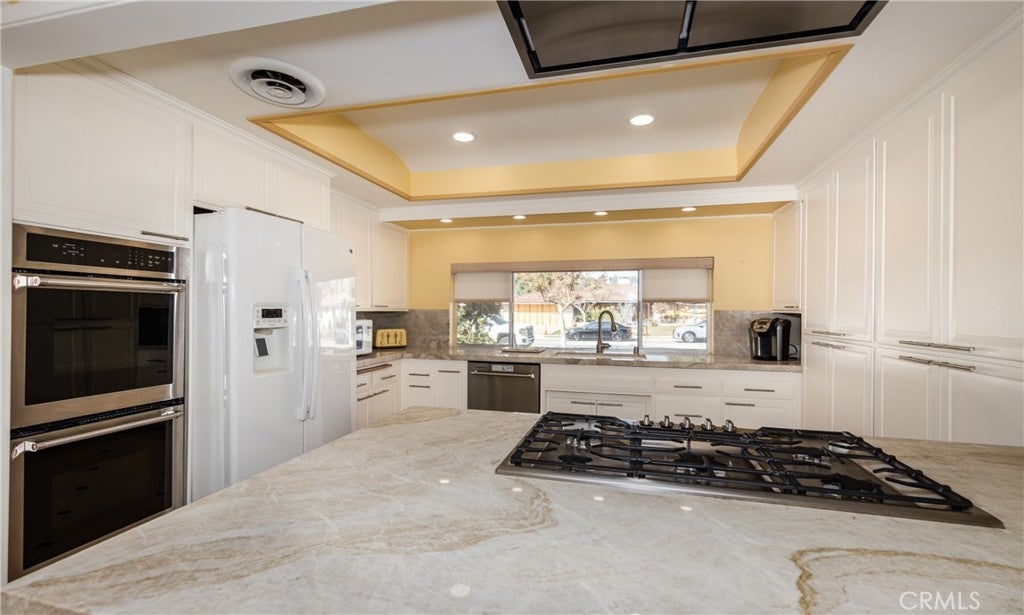 Nestled on a quiet cul-de-sac in a highly sought-after, established Covina neighborhood, this spacious 5-bedroom, 3-bath home with a formal living room blends timeless charm with thoughtful updates. Inside, you’ll find lovely updated wood flooring with wood trim, fresh interior and exterior paint, stylish new fixtures, and new window treatments in several rooms, two fireplaces for cozy evenings, making it truly move-in ready. The heart of the home is the bright, beautifully updated kitchen, with white cupboards, granite countertops with backsplash, featuring stainless steel appliances including two ovens, a modern stove, a built-in exhaust vent, and plenty of counter space for cooking and entertaining. The kitchen opens to a welcoming family dining area with access to the lovely patio and backyard. A cozy den off the dining area and wet bar with sink and mini-fridge is perfect for family time or casual gatherings. A convenient indoor laundry room and powder room off the kitchen add function and ease to daily living. The bedrooms are filled with natural light, including a primary suite for your private retreat. With five total bedrooms, you’ll have plenty of space for family, guests, or a home office. Additional highlights include a 2-car garage with epoxy floor along with private driveway, a smart thermostat for year-round efficiency, new roof in 2024 and a peaceful cul-de-sac setting in a mature neighborhood that truly feels like home. Close to schools, shopping, dining, and freeway access. A well-built home with great bones, just waiting for the right buyer to add their personal style!