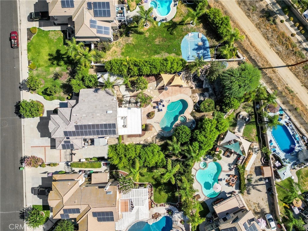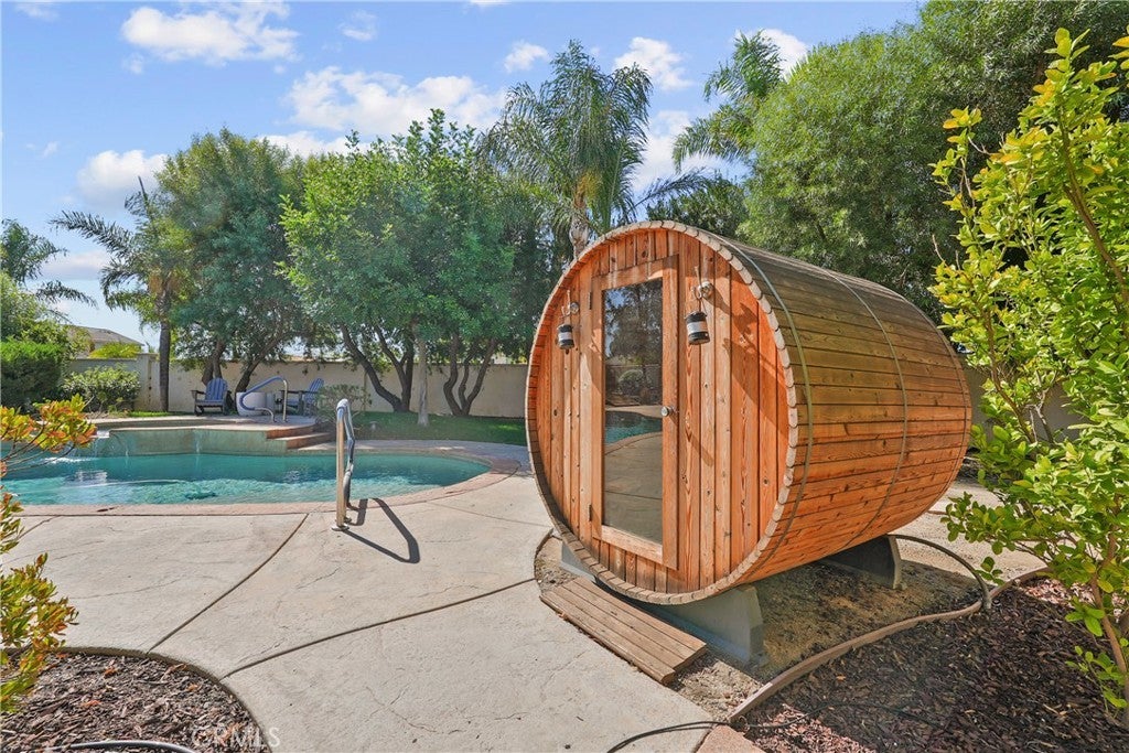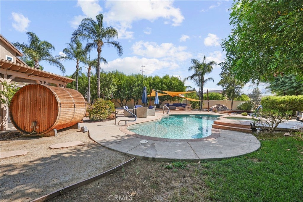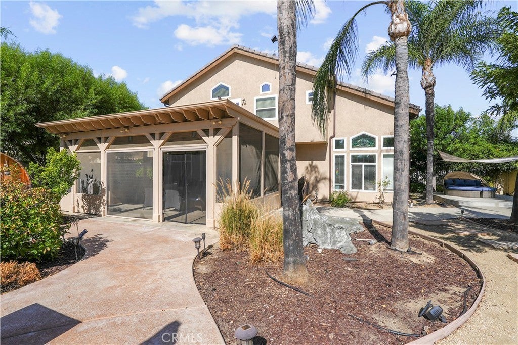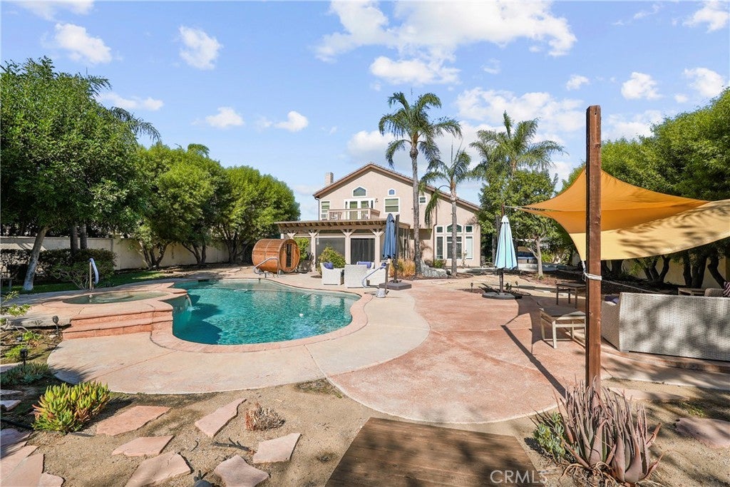 Welcome to 30536 Covecrest Cir! From the moment you walk through the front door, this Menifee home wraps you in warmth and elegance. High ceilings soar above a formal living and dining area, setting the stage for cozy evenings and joyful gatherings. With 5 bedrooms and 3 full bathrooms across 2,467 sq ft, the layout offers space and flexibility — including a downstairs bedroom and bath, perfect for guests or extended family. In the heart of the home is a beautifully renovated kitchen which features quartz counter tops, stunning Mahogany cabinets with endless amounts of storage. Thoughtfully designed with a built-in coffee bar, and abundant cabinet space, with pull out drawers for easy access to your daily needs. A space that inspires both quiet mornings and lively meals. Nestled in the living room you will find a beautiful fireplace with a cozy atmosphere, with a new 10 foot sliding door to access your oasis backyard. As you walk up to the second floor you are invited by lovely vinyl wood flooring covering upstairs. The primary suite is a true retreat, with beautiful high ceilings, a updated luxury wall to wall walk in shower, and stunning french doors opening to a private balcony overlooking a serene view of the sparkling pool, bubbling spa, and personal sauna. Whether you're sipping coffee at sunrise or watching the sunset, this space invites peace and reflection. This backyard is perfect for all family get-togethers, offering over 16,000 sqft in privacy. The backyard is surrounded by a crisp white block fence, and beautifully landscaped trees to provide even more privacy. This beautiful home screams curb appeal on a private cul-de-sac, and a welcoming driveway with a 3 car garage that is epoxied for an even more elevated experience. The garage gives additional storage space with over hanging storage shelves, as well as built in cabinets and work station for your mechanical needs. This home provides more than just your average needs but has also been thoughtfully upgraded and equipped with necessary needs for your family which includes, RV parking, ,and 27 paid-off solar panels, newer windows for energy efficiency, newer tile roof installed in 2022 with warranty, water softening system, recent updated pool heater, upstairs bedrooms are equipped with individual AC control systems. NO MELLO-ROOS, which means, you’ll enjoy lower costs in a neighborhood close to parks, schools, and shopping. INTERIOR OF THE HOME HAS BEEN PAINTED FRESH WHITE!