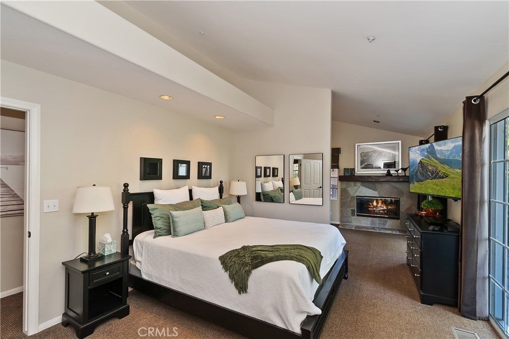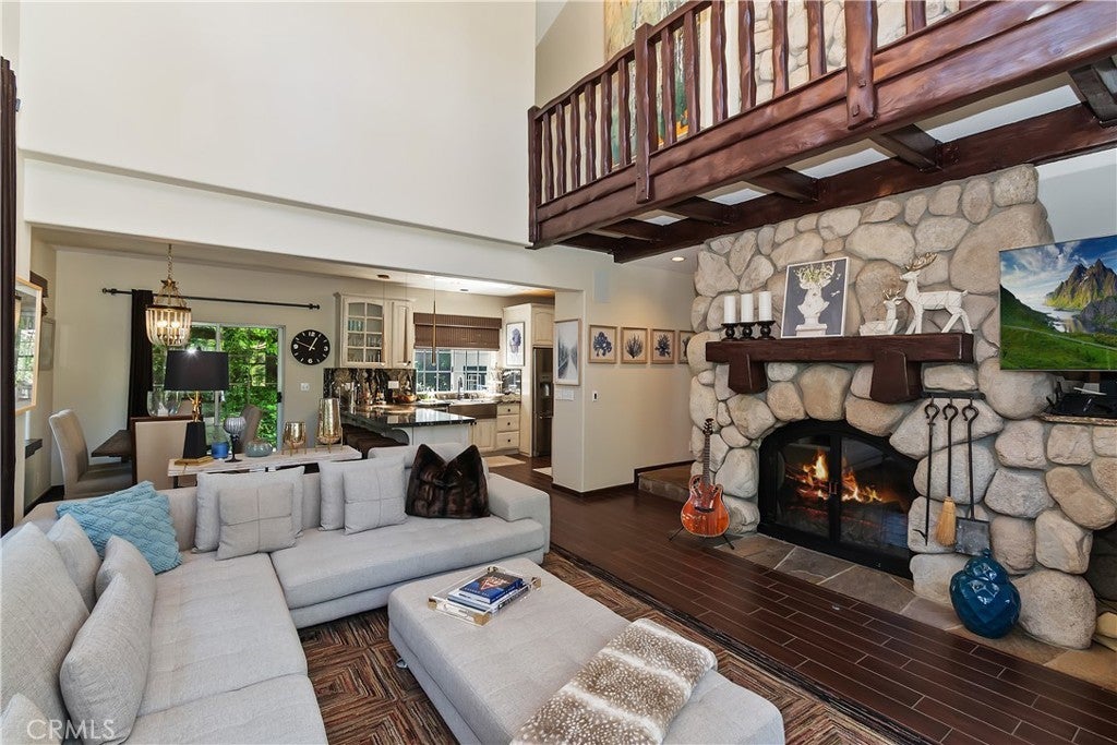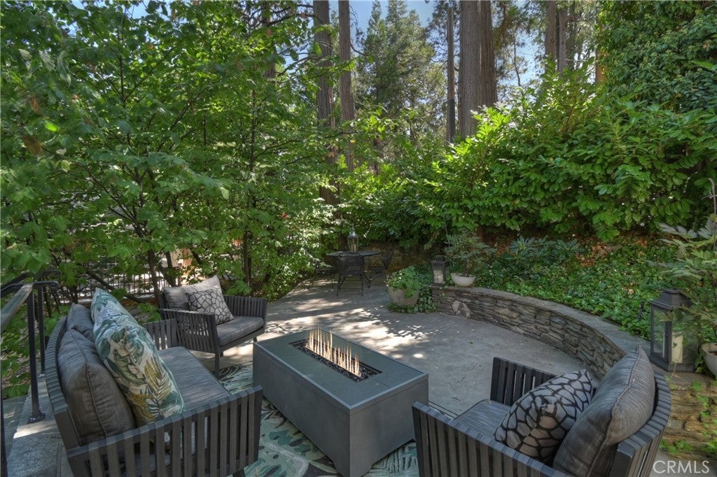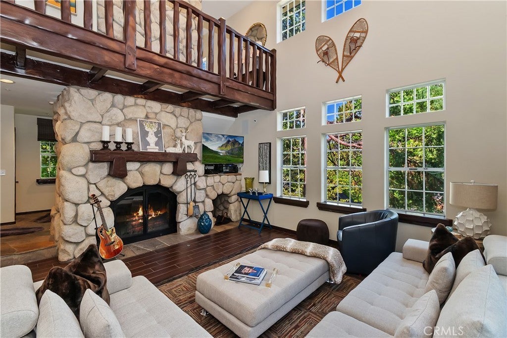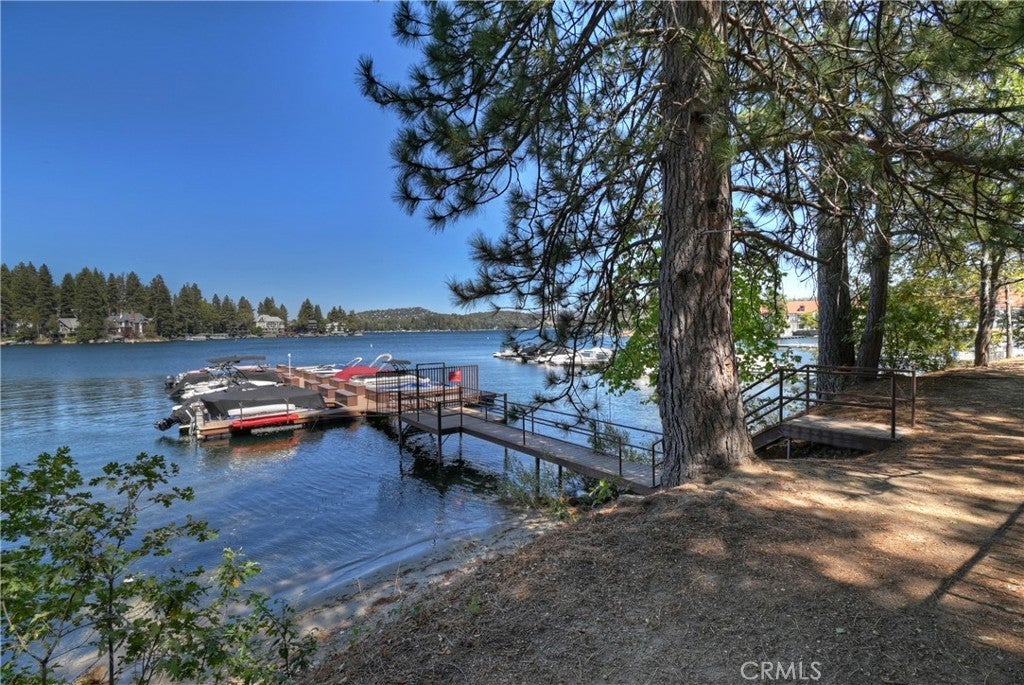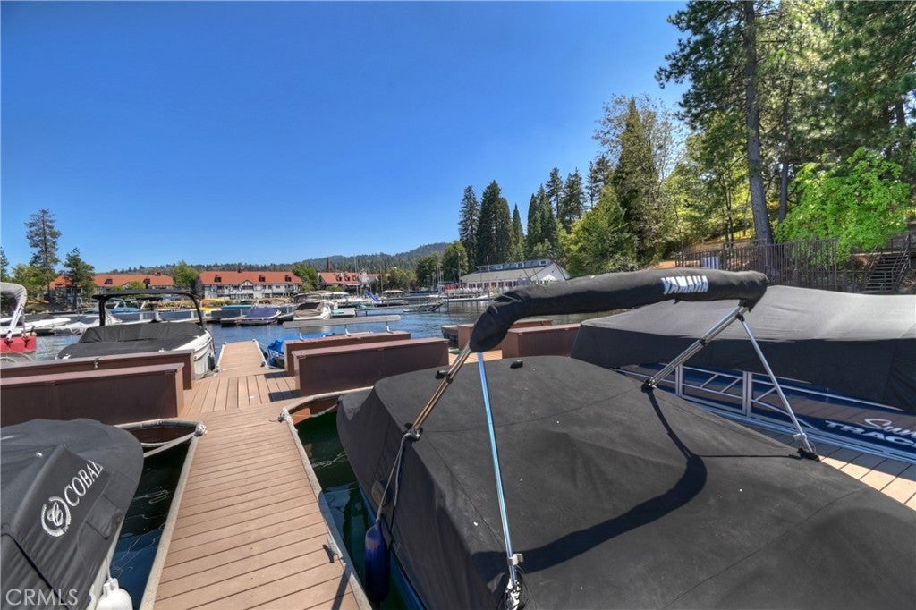 Nestled back among the dogwoods, this beautifully landscaped Lake Arrowhead home combines mountain charm with modern living. With level entry and a two-car garage, ease meets elegance from the start. Enter off of the front porch that invites you in to discover your next adventure. Inside, the great room impresses with floor-to-ceiling windows, dark wood beams, river rock fireplace, and rich flooring. The open-concept design flows into the gourmet kitchen featuring stainless steel appliances and sliding glass door to the back patio off of dining, perfect for entertaining and a fire pit to sit back and relax in your outdoor retreat area. A half bath completes the main level. Upstairs, discover three comfortable bedrooms and a laundry area, highlighted by the primary suite with its own fireplace and a private balcony draped in climbing wisteria serene mountain retreat. The lower-level bonus room offers flexibility as a movie theater, game room, or private hideaway. Adding to the lifestyle, a dock is available for purchase just steps away in one of Lake Arrowheads most desirable spots near the Resort, Yacht Club, and a short walk to the Village for dining and shopping. Boat available for purchase as well outside of escrow.. Offered turn-key furnished, this home is ready to enjoy from day one. A few of the amenities of this home are: fire sprinklers throughout, snow blower, central air and heating, back up generator, 5 flat screen TV's with Apple TV, central vacuum and full alarm system. Boat is also available for purchase! 2021 Yamaha 19.5' jet hours approx 200