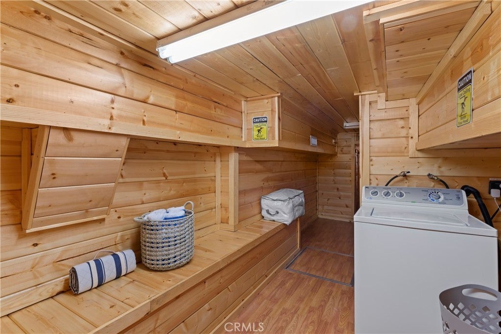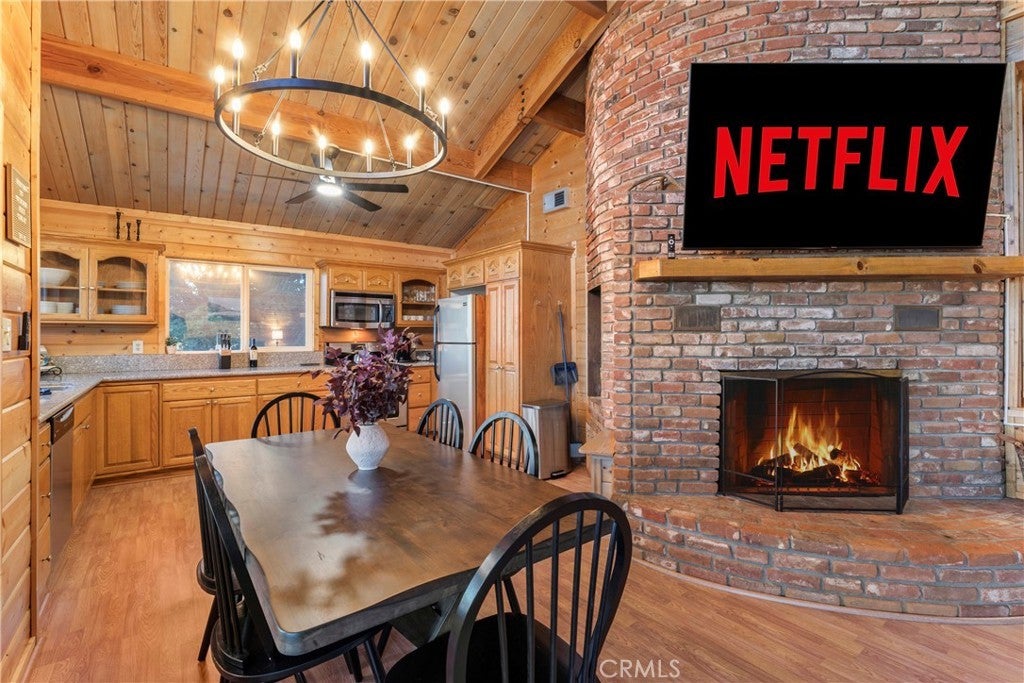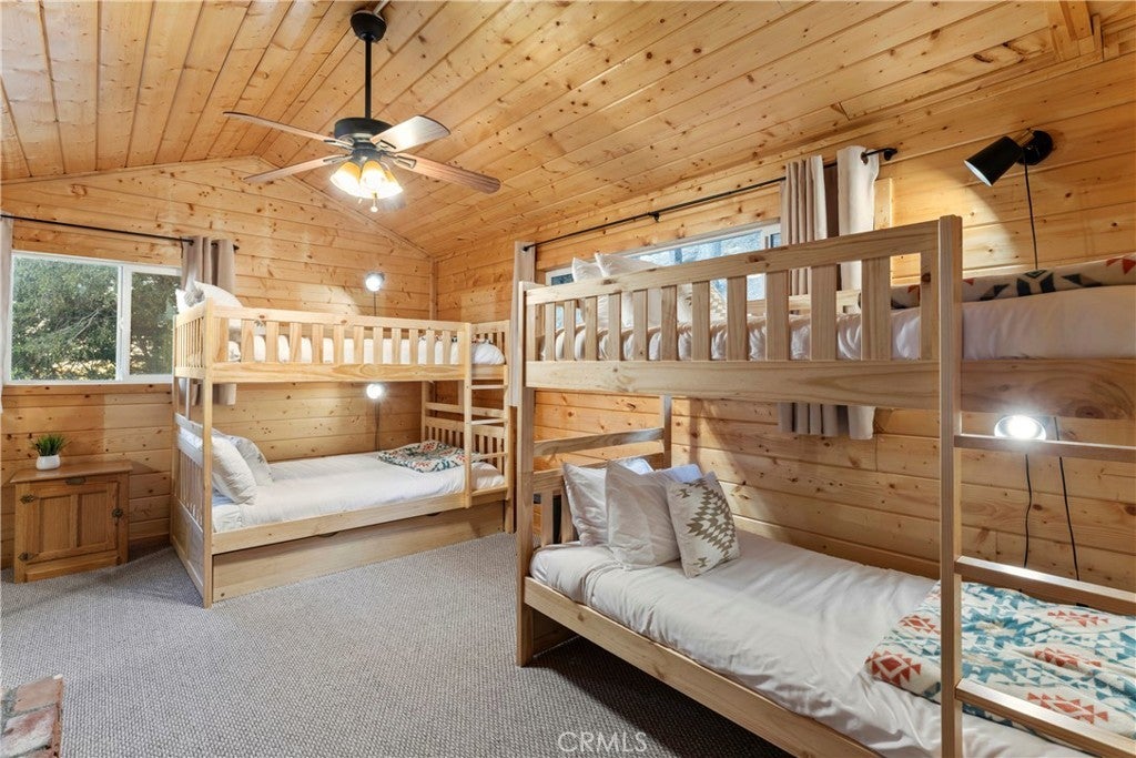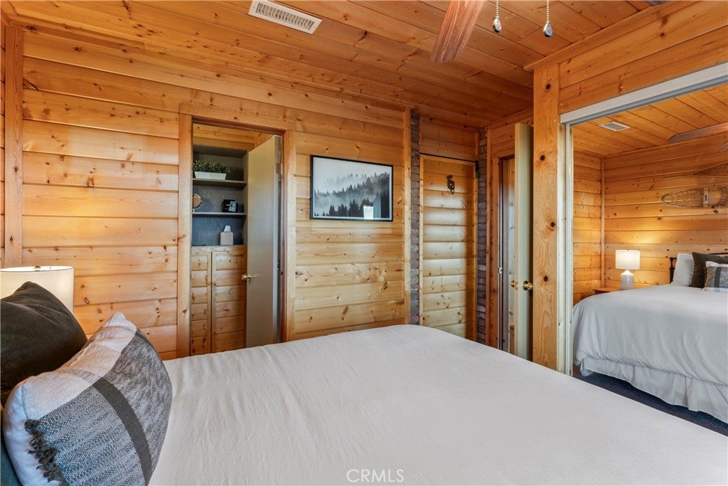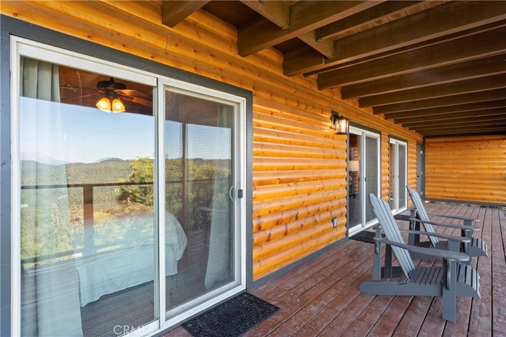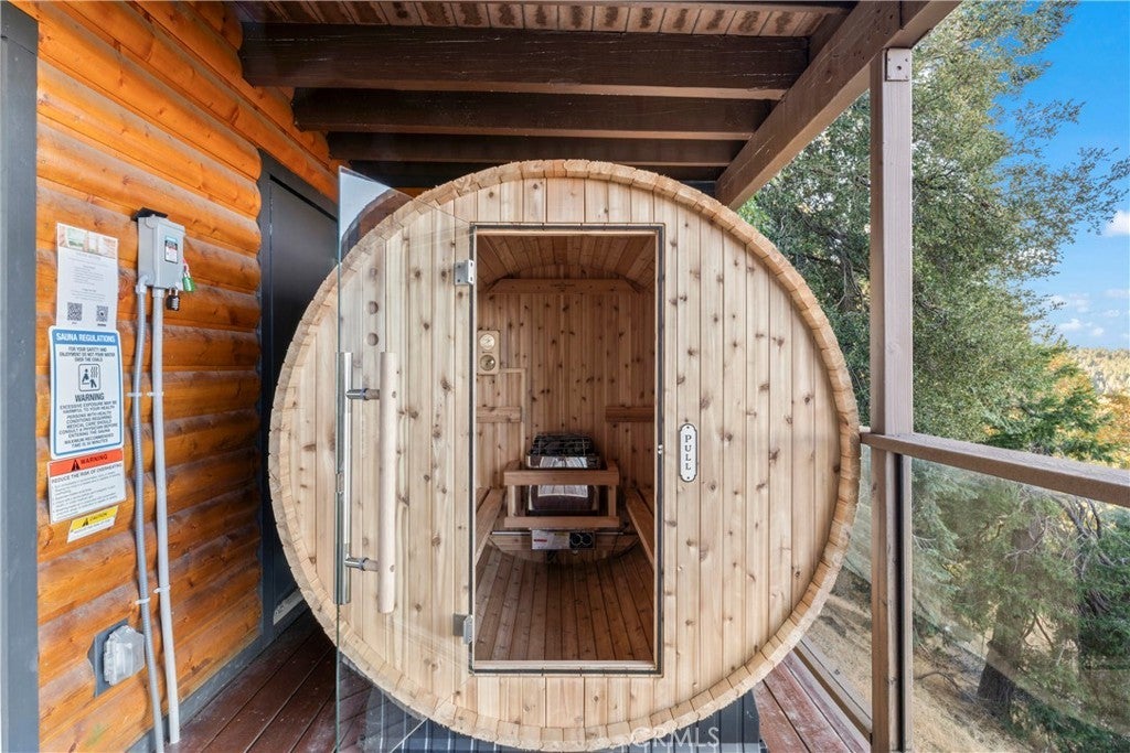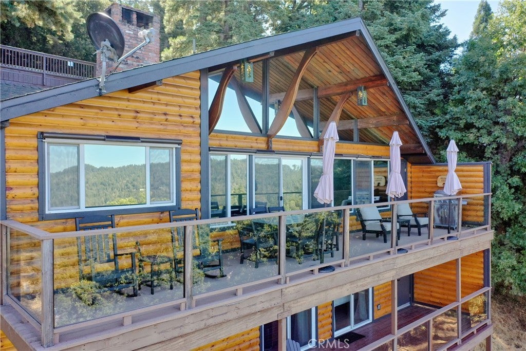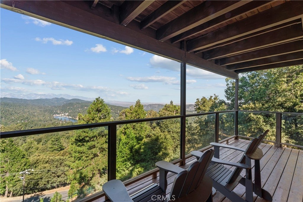 Experience the “Schoner Blick”(Beautiful View) of 816 Chamois. Arguably the best panoramic view of Lake Gregory, Mt. Baldy, Crestline basin and high desert the San Bernardino Mountain range has to offer! If you are dreaming of a quintessential upgraded mountain cabin, dream no further! This property exemplifies everything you’d imagine in a mountain getaway. This is a package deal offered turnkey furnished and INCLUDES the adjacent lake view vacant parcel(12,906 sq ft), for a total ½ acre of the nature’s utmost serenity. Upon entry of this 3 bedroom/2.5 bathroom retreat, you are greeted with an A frame North West facing wall of glass accentuating amazing unobstructed views. Entertain family & friends on a large upper Trex deck, the perfect party perch to enjoy July 4th fireworks over Lake Gregory. The entire interior is encased with knotty pine tongue and groove paneling. The exterior is wrapped in high quality log plank siding. Open concept main living area offers a soaring floor to ceiling brick fireplace, indoor BBQ chimney, and vinyl wood flooring throughout. The entry level master bedroom & lower level den also include their own fireplaces, for a total of 3 fireplaces. Every nook and cranny of this cabin is appropriately used for ample storage top to bottom. Since the sellers acquired the property in 2024, they put the icing on the cake through: new furnishings and decor, new tile flooring in bathrooms, created a level kiddo play area, cut a nature trail through vacant included parcel, new lighting & plumbing fixtures, 30 amp sub panel, added a pool table in garage/gaming area and installed a soothing sauna on the lower rear deck. Additional upgrades completed by prior owner included: a composition roof, tankless hot water heater, HVAC system with A/C, Generac natural gas whole house generator, stainless kitchen appliances, Trex decking w/ glass railing, remodeled bathrooms and kitchen, added the 2 car garage & parking deck, interior/exterior siding, vinyl dual pane sliders and windows, custom solar shades + tint for wall of glass. Ample parking in driveway plus a parking deck over the garage. No cross through traffic here, located at the end of a quite San Bernardino County paved and maintained road. This stunning property is a licensed short term rental with 38 recent 5 star reviews on Airbnb. Treat yourself to the tranquil setting and breathtaking view you deserve, tour Schoner Blick today!