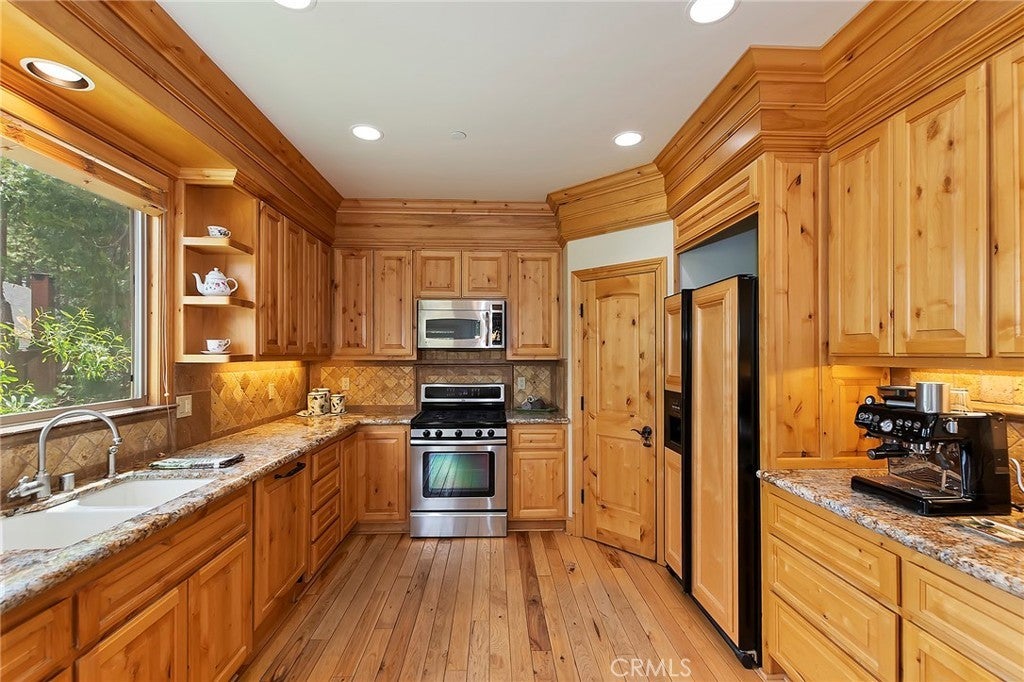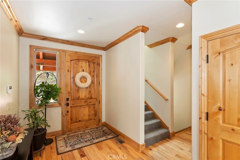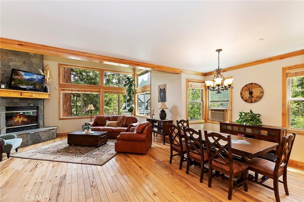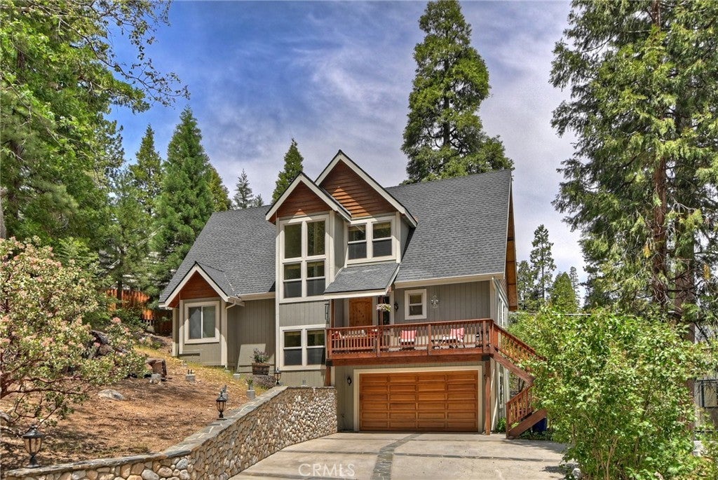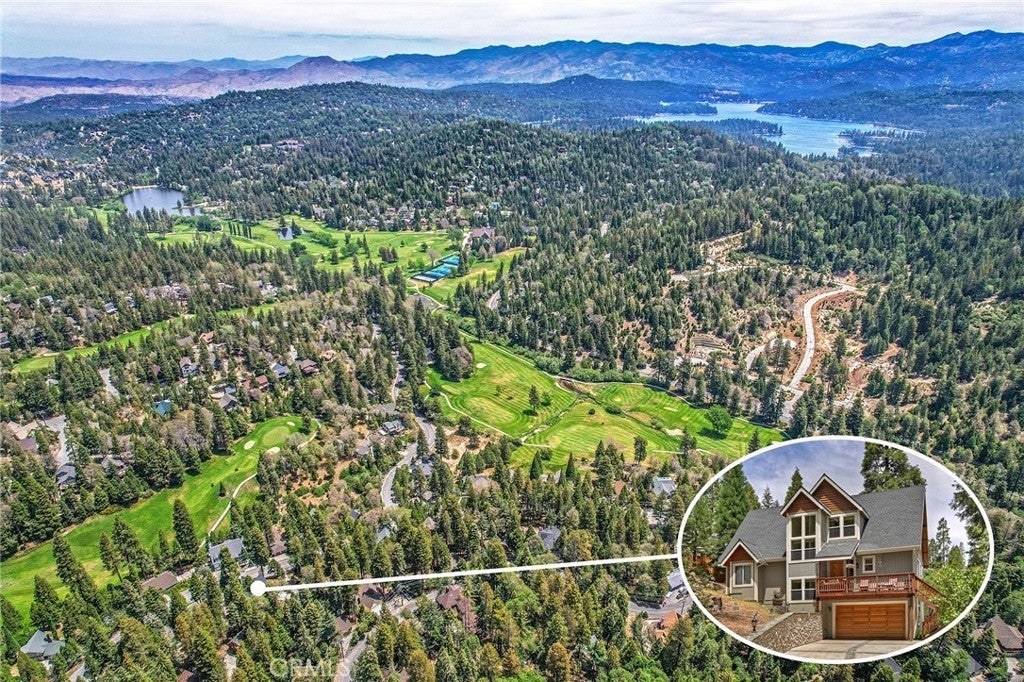 "Fore!" Watch out for this Golf Course Oriented Beauty! Located just across the street from the prestigious Lake Arrowhead Country Club Golf Course. A complete knock out this one is with Alder Cabinetry, Hickory Floors, Dual Level Windows, Attached and Direct Entry 2 Car Garage, Wine Cellar, and a Charming Patio for Summer Time in the Mountains. Enjoy single level living with an open floor plan an master suite on the main. The jaw dropping kitchen opens into the stunning dining & living spaces featuring a floor to ceiling fireplace as well as it is surrounded with natural light from towering windowscapes. The primary suite offers a walk-in closet, jetted tub, walk-in shower and direct access to the cool and quint patio. A balcony overlooks all of the livelihood and greets guests into one of three upstairs guestrooms with two additional baths, additional storage and built in office area. A bonus downstairs that could be anything you want, as well as landscaped grounds, adorable separate laundry room, and plenty of parking... even the driveway is fitted with stone accents and retaining wall surround. A total "Hole in One!", a special home for the full time or the anytime with a killer mountain setting.