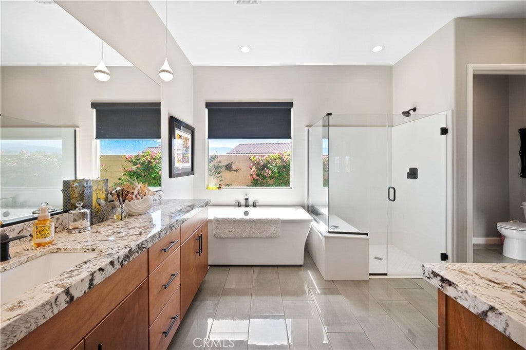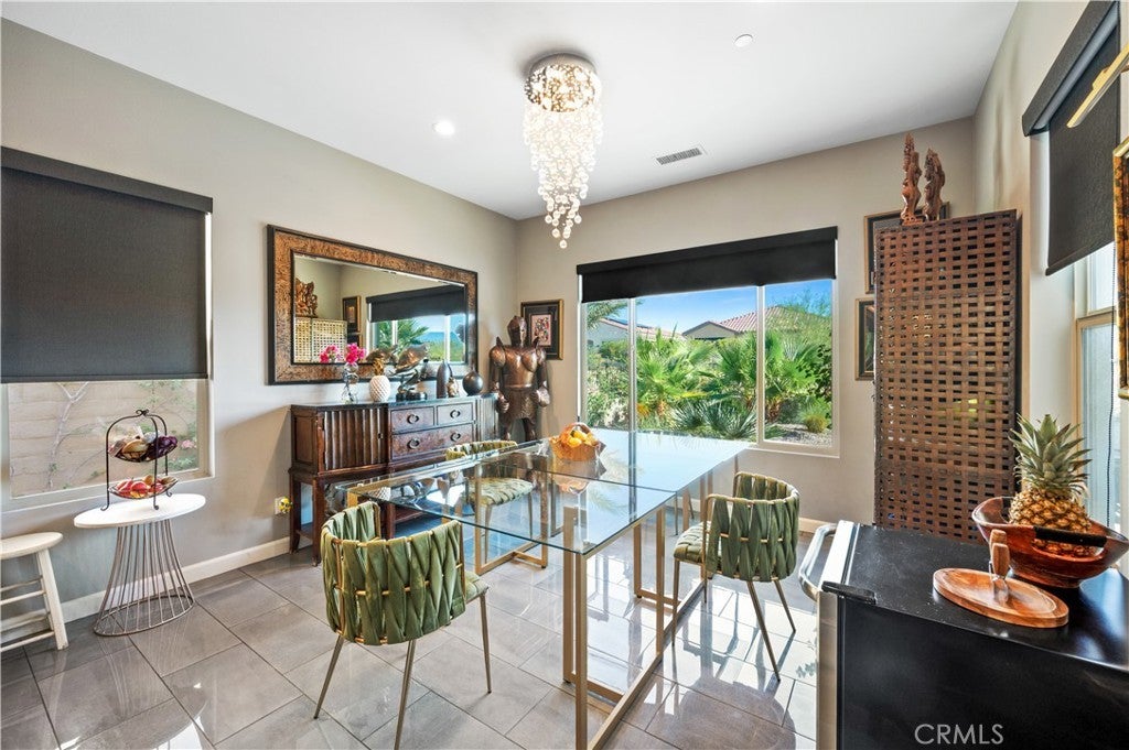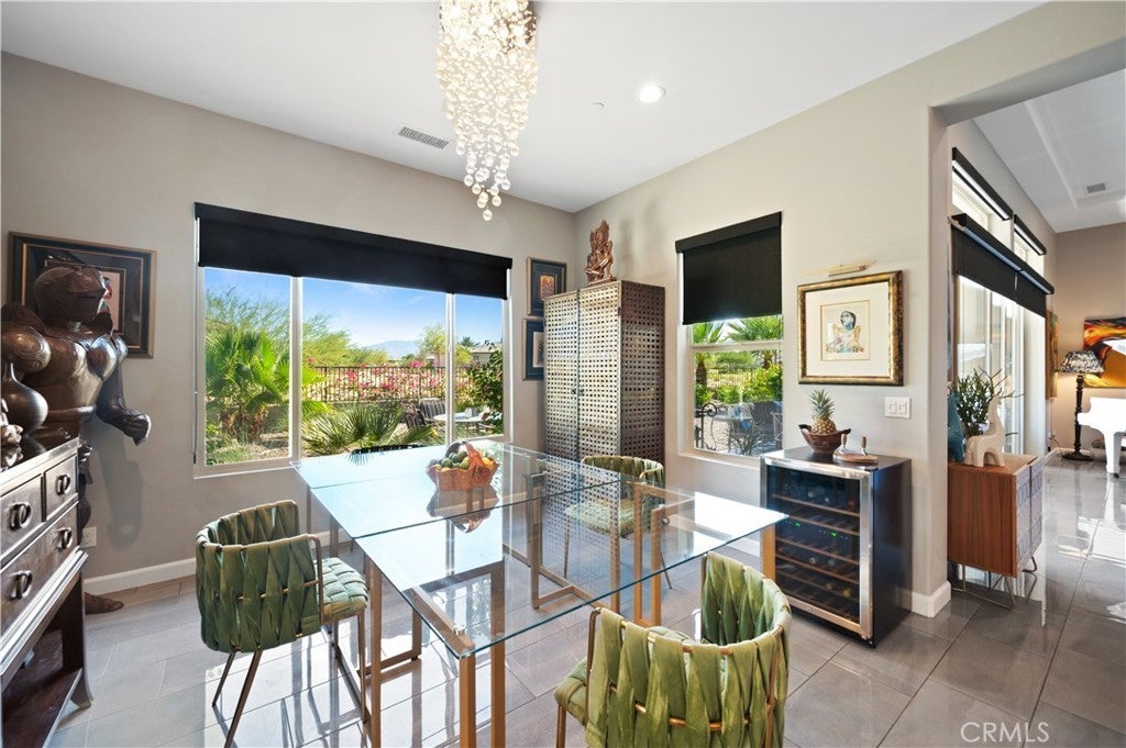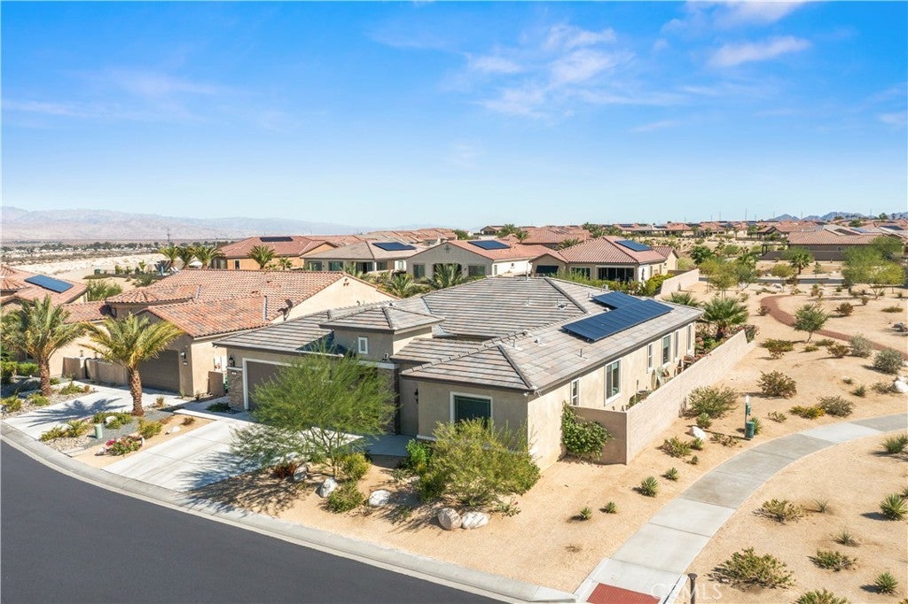 Stunning Contemporary Home in Rancho Mirage – Located in the Del Webb 55+ Community This beautifully designed single-story residence combines modern elegance with comfortable desert living, offering one of the largest floor plans and lots in the community. Soaring ceilings, sleek tile flooring, and abundant natural light create a bright and sophisticated atmosphere throughout. The solar panels are fully paid off, providing substantial saving on electricity bills. The gourmet kitchen is appointed with fully upgraded custom cabinetry, a waterfall-edge granite island, and premium stainless steel appliances—perfect for both everyday living and entertaining. An extended dining area provides additional space for gatherings, while the expansive great room features a designer fireplace, stylish expensive lighting, and seamless indoor-outdoor flow through sliding glass doors to the covered patio and landscaped backyard. The luxurious primary suite offers a serene retreat with a spa-like bath, dual vanities, a custom build walk-in closet, and a bay window that enhances both light and space. The second bedroom can function as a casita, and another additional rooms provide flexibility for guests or a home office. it is possible to bring the house to have 3 bedrooms. A rare three-car garage, compared to the standard two-car design in most homes here, adds valuable convenience and storage. Low-maintenance desert landscaping completes this exceptional property. Located within the sought-after Del Webb Rancho Mirage 55+ community, residents enjoy world-class amenities including a resort-style clubhouse, fitness center, multiple pools and spas, tennis and pickleball courts, walking and biking trails, and a full calendar of social activities and events. This gated community offers not just a home, but a vibrant desert lifestyle.