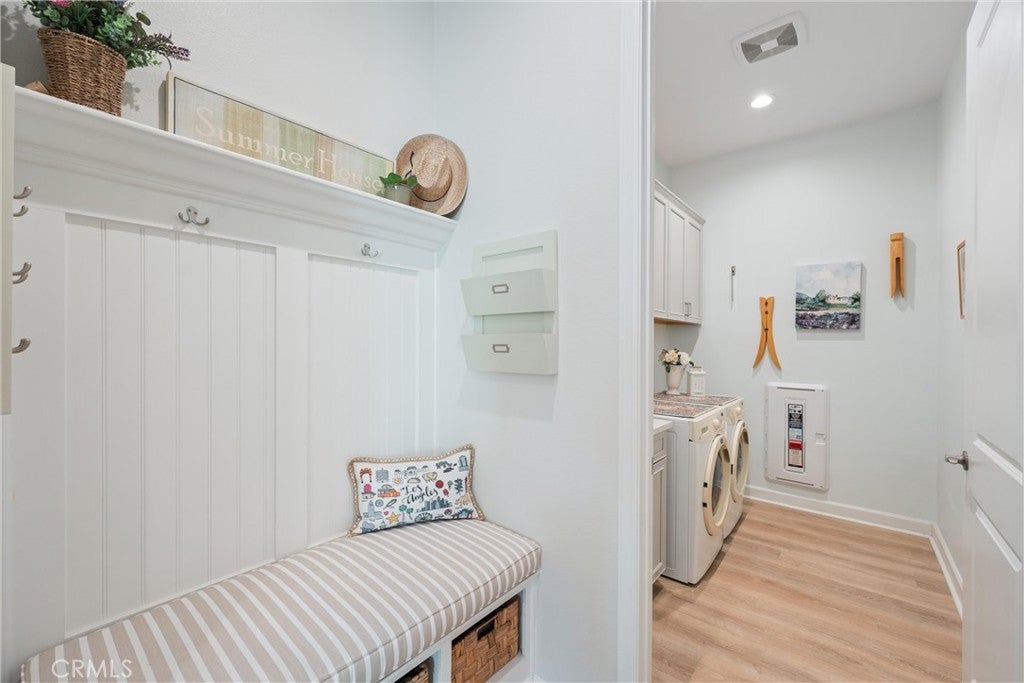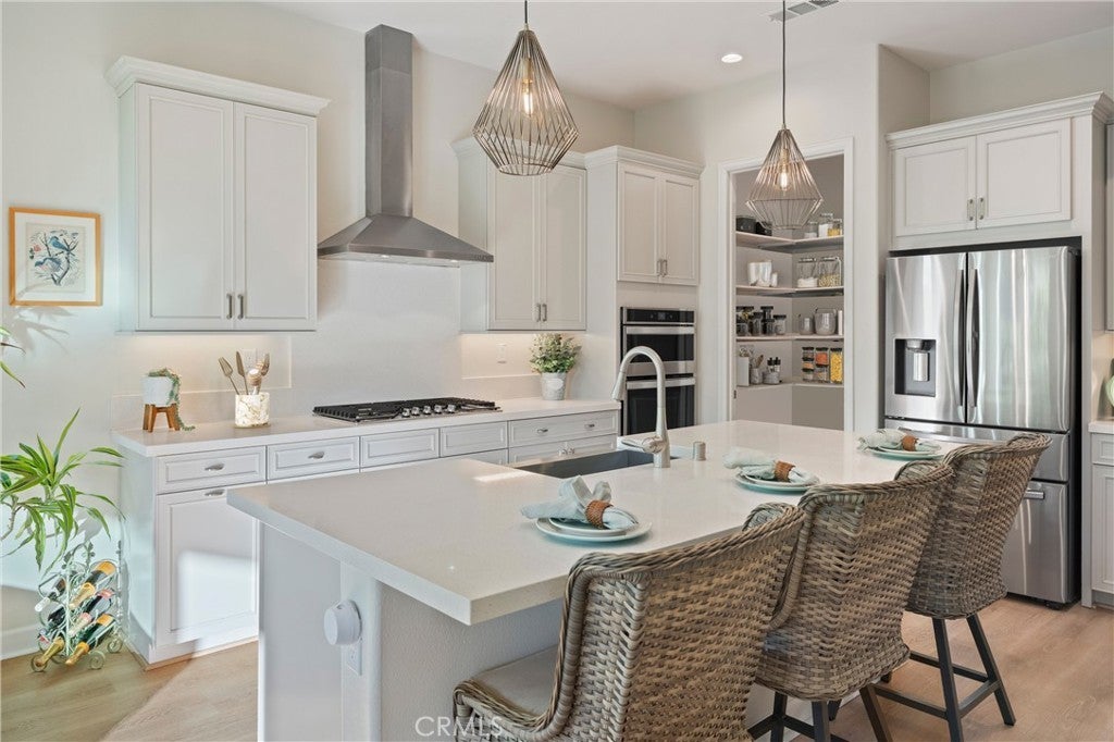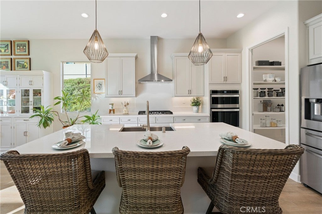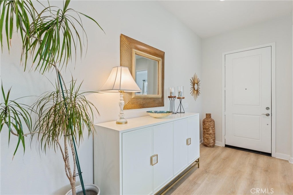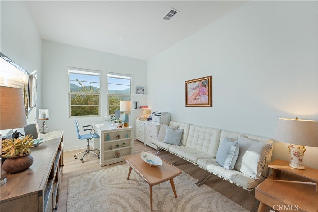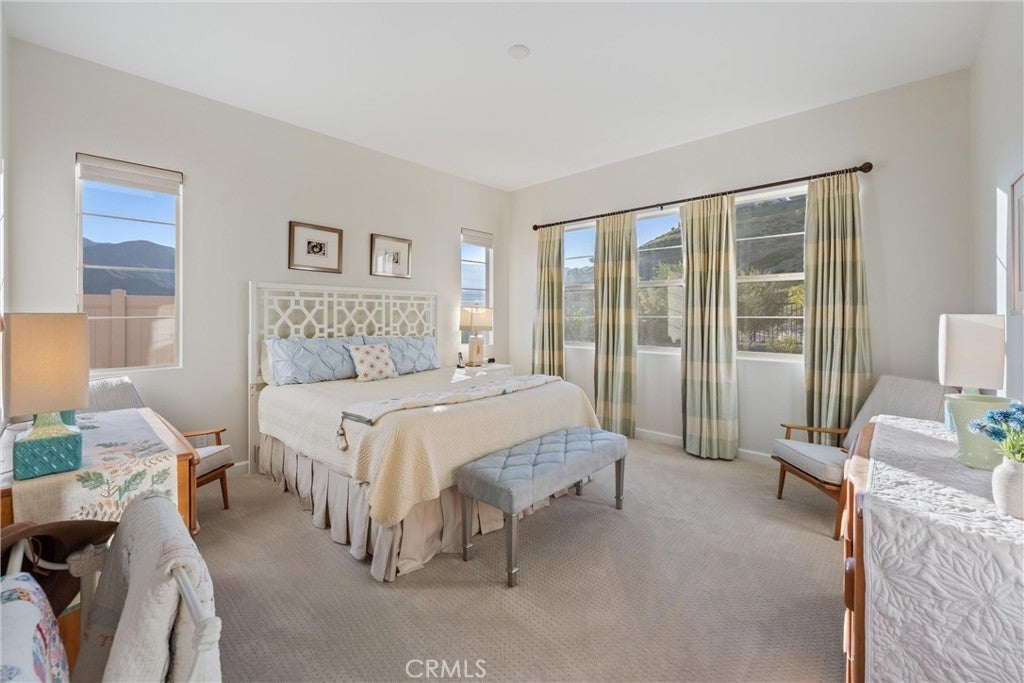 55+ RESORT-STYLE LUXURY LIVING | 1-STORY | PANORAMIC VIEWS | FULLY PAID SOLAR | GUARDED + GATED | Welcome to this beautifully upgraded home in the highly desired Terramor — where modern luxury and comfort meet in a vibrant community! A welcoming front patio with mountain views sets the stage for easy living in this elegant residence. Step inside to be greeted by abundant natural light, gorgeous luxury plank flooring, & an impressive array of upgrades. The open-concept Living Room has a warming fireplace & a 2-panel sliding glass door that extends your living space into the grand California Room & fully landscaped yard, creating the perfect blend of indoor-outdoor living. The chef-inspired Kitchen boasts stunning quartz countertops, breakfast bar seating, upgraded cabinetry, stainless steel appliances, pot & pan drawers, under-cabinet lighting, and oversized walk-in pantry. The Dining Room offers convenience for entertaining with a second slider to the backyard & a built-in china hutch with glass display doors—adding style & function. The Primary Ensuite Bedroom is spacious & filled with natural light, creating a serene retreat. The spa-like Ensuite Bathroom showcases quartz countertop, dual sinks, an oversized frameless shower with seating, upgraded cabinetry, & a walk-in closet with custom built-ins. Bedroom #2 enjoys stunning mountain views, while the Builder's spacious optional Bedroom #3 is currently a combined office/den. Bathroom #2 includes quartz counters and a shower-tub combination. Additional highlights include a separate Laundry Room with extended cabinetry and utility sink, and a Mudroom featuring a custom upholstered bench and extra entry storage for convenience. Step outside to your private backyard retreat, complete with a covered California Room, firepit with dedicated gas line, gazebo-covered dining area, a 2nd gas line for your BBQ, an oh-so-perfect lavender garden, and captivating sunset panoramic views. Energy efficiency is top-of-the-line with fully paid solar system, EV outlet, tankless water heater, whole house fan, drip irrigation & recessed lighting. Amenities include 2 clubhouses (55+ Only and All Ages), indoor & outdoor pools, fitness center, wellness studio, tennis, pickleball, miles of trails, dog parks & sports fields. Nearby find shopping, restaurants, cinemas & quick access to OC via 15/91 Expressways & 241 Toll. This remarkable residence offers the perfect blend of elegance, privacy, & modern comfort — welcome home!