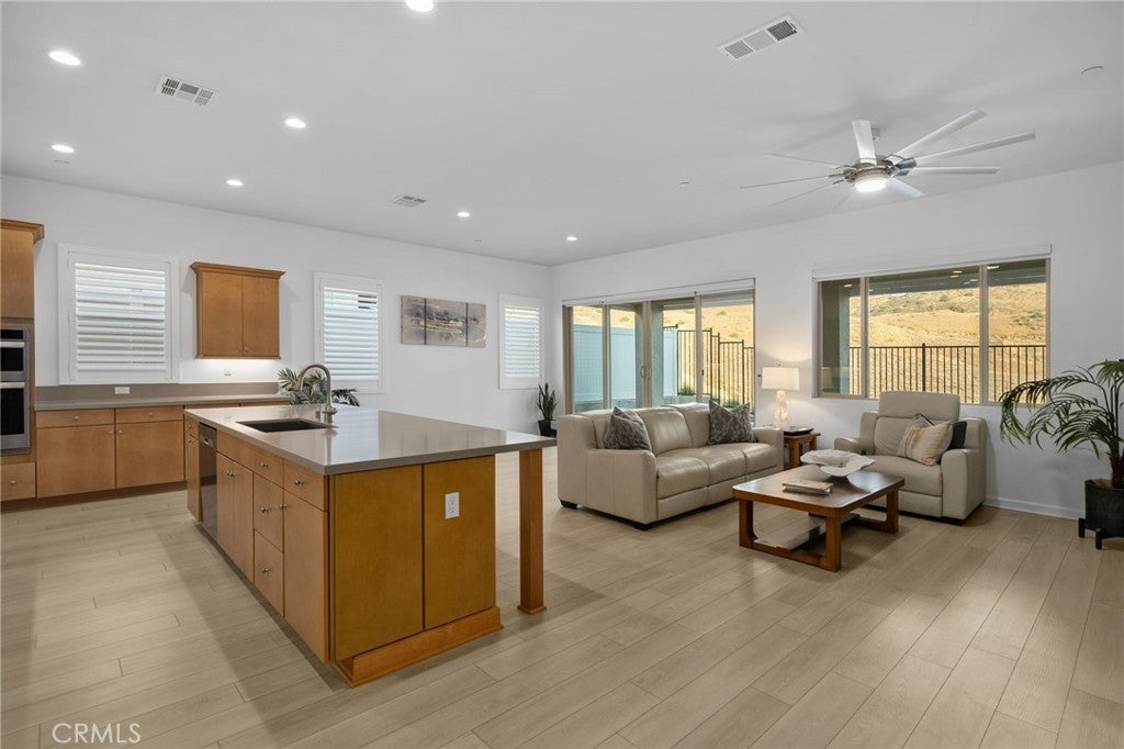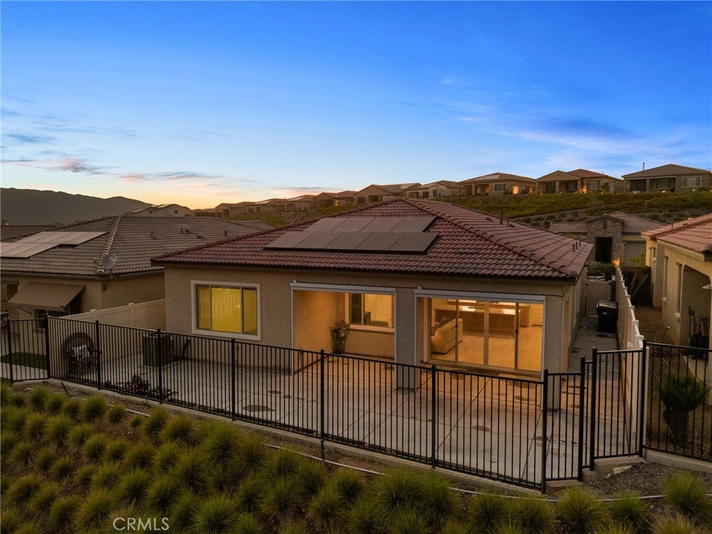 Welcome to this highly upgraded, move-in-ready home with PAID OFF SOLAR in the exclusive gated community of Terramor. From the moment you arrive, the beautiful curb appeal sets the tone for what awaits inside. Step into a bright, open layout featuring crisp white walls and stylish LVP flooring that create a modern, blank canvas ready for your personal touch. Just off the entry, you’ll find a convenient main-floor bedroom and full bathroom, as well as a dedicated office—perfect for working from home or accommodating guests. The heart of the home is the expansive kitchen, seamlessly connected to the spacious family room. Enjoy stainless steel appliances, an oversized kitchen island ideal for entertaining, under cabinet lighting, and a large walk-in pantry. Double sliding doors bathe the space in natural light and offer breathtaking views that extend from the kitchen and family room to the outdoor patio. The serene primary suite is a private retreat with sweeping views, a generous walk-in closet, dual sinks, and a luxurious walk-in shower in the en-suite bathroom. Additional highlights include a conveniently located laundry room, plantation shutters, ceiling fans throughout, and a motorized shade to keep the covered patio cool and comfortable all year round. Enjoy scenic views from multiple rooms and embrace the relaxed yet refined lifestyle this home and the Terramor Community have to offer, including indoor/outdoor pools, full gym, sauna, bar, pickleball courts, meeting rooms, billiard room, BBQ areas, and much more!