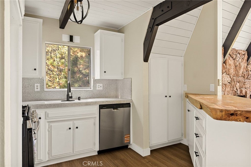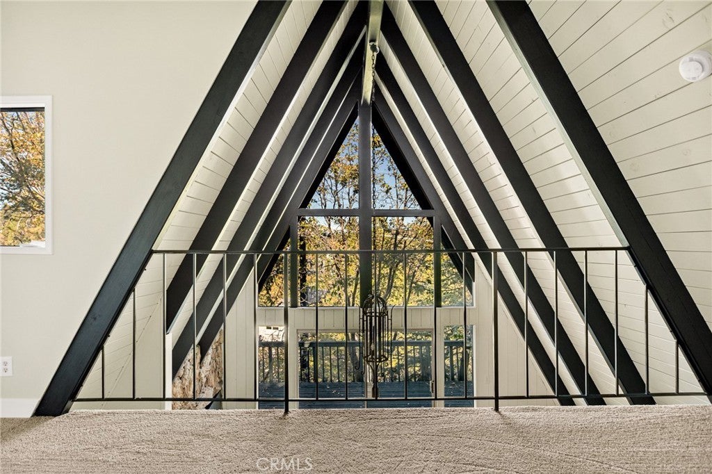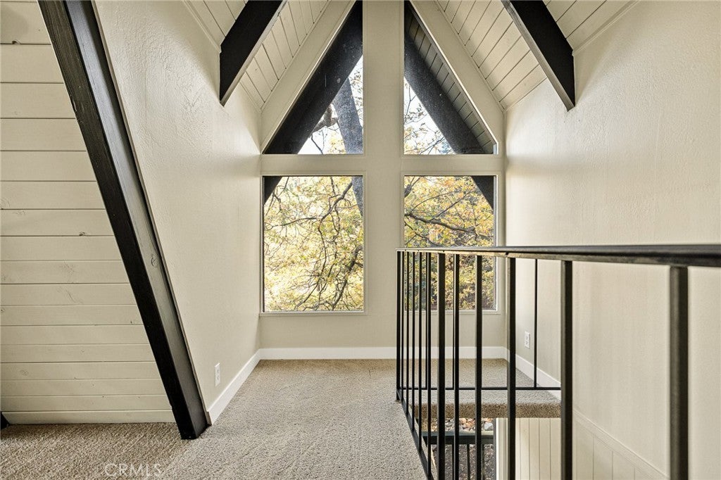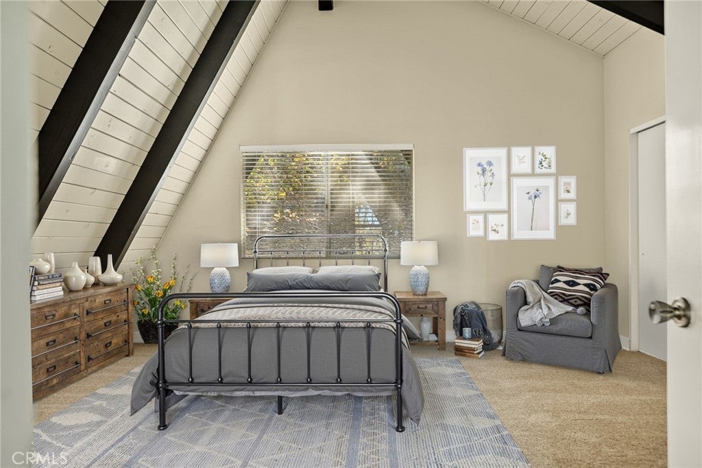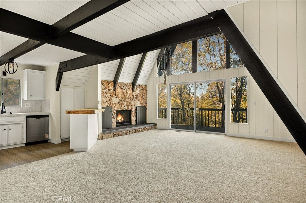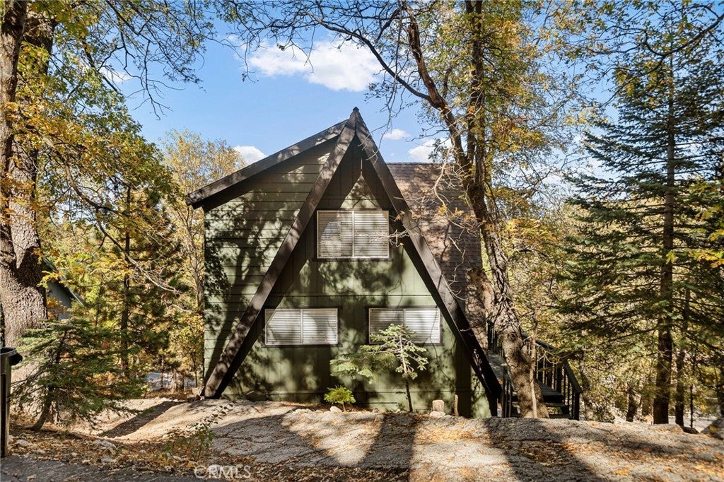 Lake rights ! Step into this beautiful remodeled A FRAME cabin—a timeless mountain favorite reimagined with a modern style and plenty of comfort. Just moments from the Lake Arrowhead Country Club, this home captures the perfect blend of mountain charm and contemporary updates. Soaring open beam ceilings and dramatic A frame lines frame the great living room with natural light. The open concept living space features a cozy fireplace and large windows that frame the surrounding pine trees. The kitchen has been redone and brand new carpet throughout. This home is ideal for relaxing weekends or full time mountain living. Enjoy lake rights to our private lake and the unbeatable location near golf, dining and hiking. 3 big bedrooms and 2 baths all ready for you! Some photos are virtually staged. Come take a look !