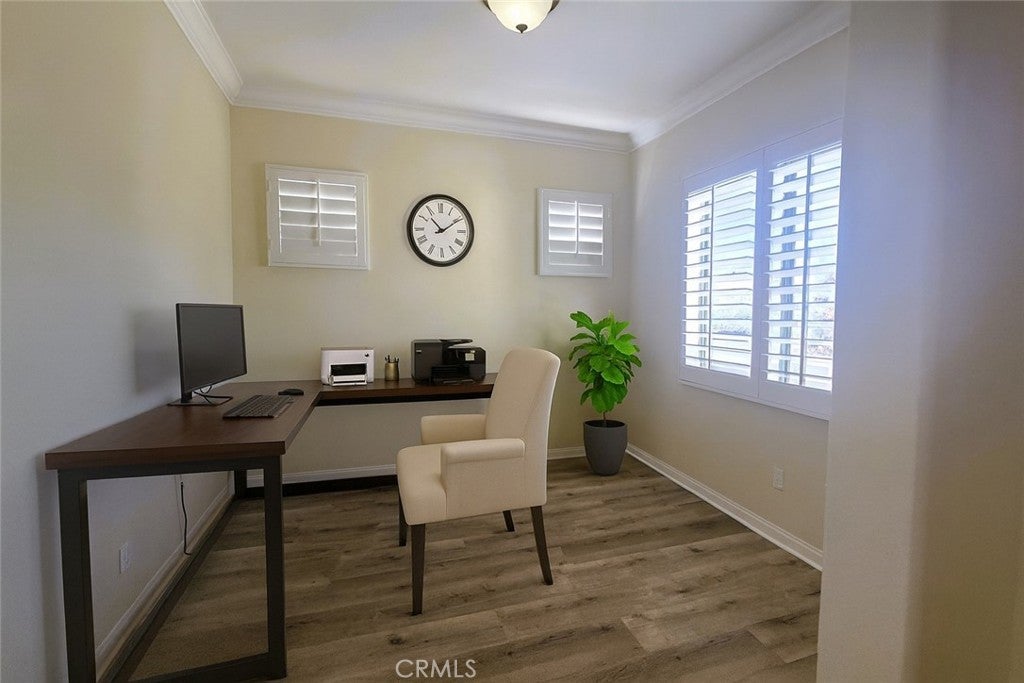 Welcome to the CASTELLANO MODEL—where charm meets grandeur. This is a great Corner-Lot with lovely curb appeal. A half-walled courtyard greets you as you approach. What a perfect spot to have dinner al fresco with palm trees rising like royalty against the distant mountain views. Entering the home you immediately find an office or den space. This room could easily be used as a 3rd guest bedroom. Traveling further into the home you will find the forgotten treasure of a formal dining room. Perfect for those large gatherings or hosting a mahjong game night. The stylish, open-concept kitchen was designed for everyday ease but clothed in rich granite and maple hued cabinets. This kitchen features sleek stainless-steel appliances—including a double wall oven, dishwasher, microwave, double sink & a sleek black 5 burner cook top. A central island offers additional prep space and storage. A cozy breakfast nook completes the kitchen area. The open layout flows effortlessly with bar seating off the kitchen counter into the adjacent living room, creating a seamless space for entertaining or relaxing. Large windows & a massive sliding glass door with plantation shutters bathe the room in natural light. A guest half bath & laundry room with tons of cabinets & a utility sink, round out this area. The Bedrooms are on opposite sides of the home, evoking separate wing living. The master is large & bright with a master bathroom retreat. A glass-enclosed shower with a built-in bench offers both comfort & accessibility, while the adjacent soaking tub—set beneath welcoming windows—creates the perfect spot to unwind in natural light. The dual-sink vanity stretches across the opposite wall and features sleek solid-surface countertops. There is an expansive walk-in closet with plenty of room for all your shoes or clothes obsessions. The 2nd bedroom is down its own hallway with a full bathroom located right before entering. Venturing out to the back yard you will find your own serene retreat—this beautifully landscaped backyard offers relaxation by the fire-pit, mountain views, & a lemon tree that is ready to lend its zest to your next cocktail. The covered patio is ideal for morning coffee, evening cocktails, or weekend gatherings. This spotless, oversized 2.5 car garage is a dream for homeowners who value organization & functionality. Ceiling-mounted metal grid racks provide overhead storage, while custom wall-mounted cabinets keep tools & supplies neatly tucked away.