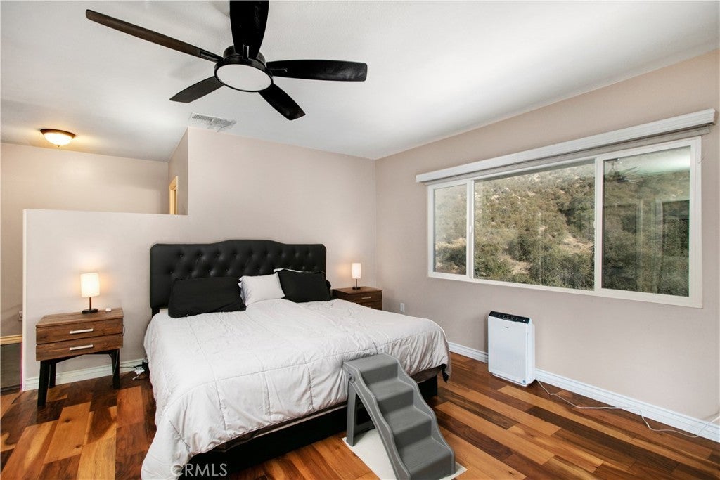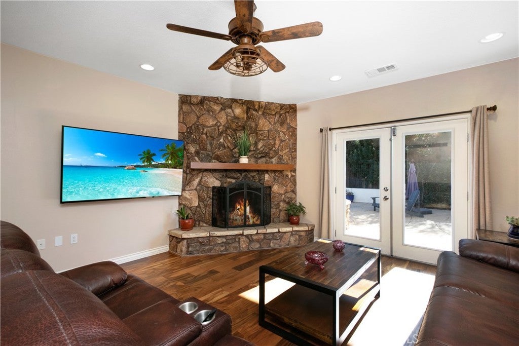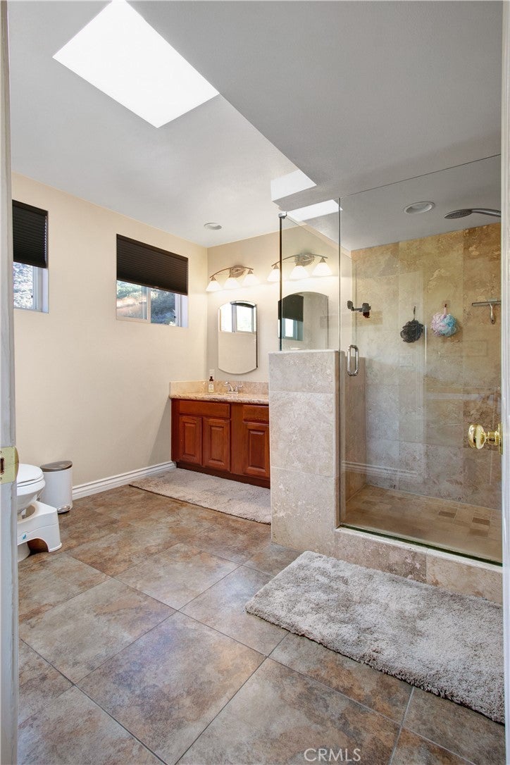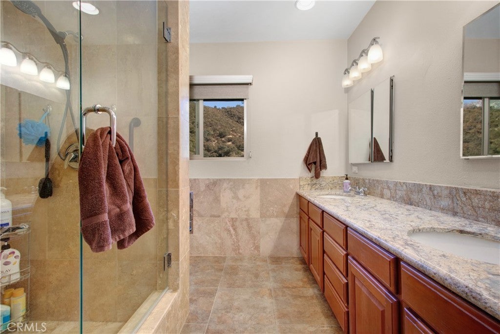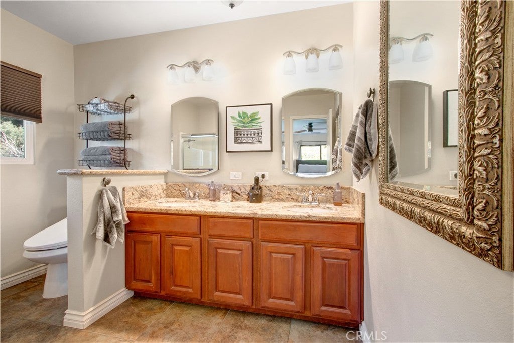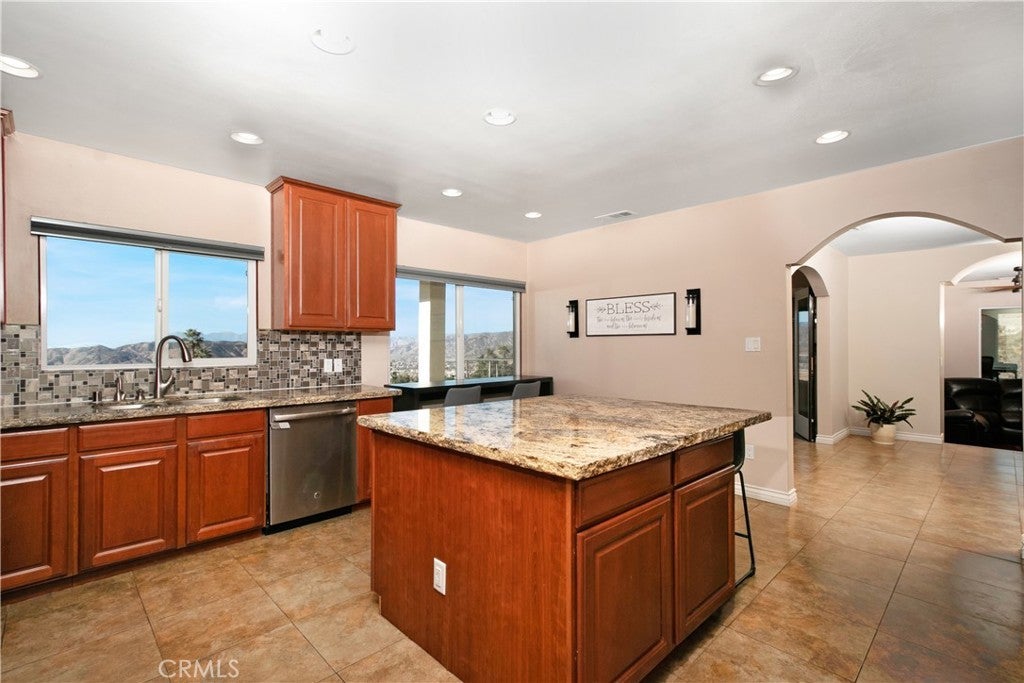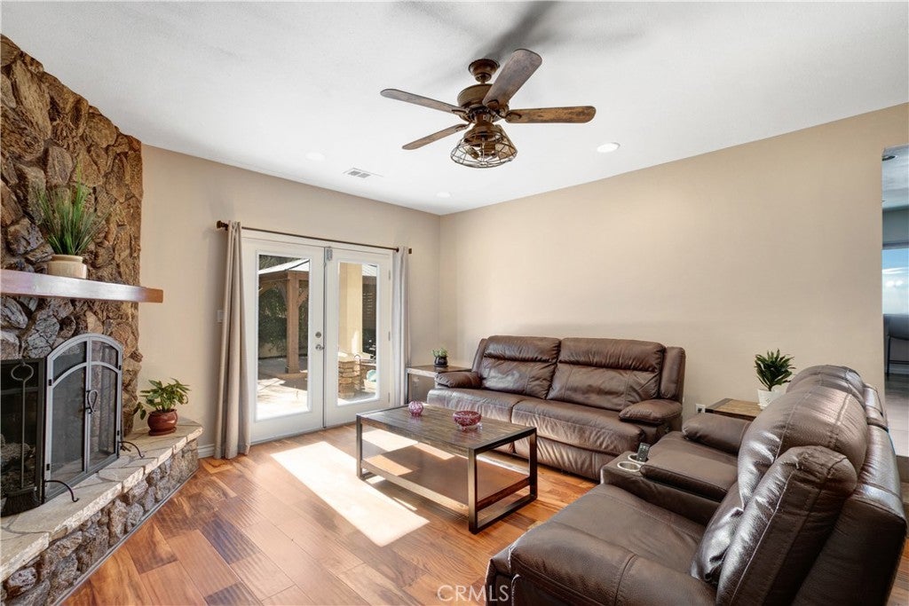 ENJOY MOUNTAIN VIBES WITHOUT THE MOUNTAIN DRIVE! Completely renovated in 2015, this Yucaipa hilltop property is designed for modern living, with one primary feature being a self-contained 400 sq ft studio apartment on the ground floor. Offering a private entrance, a kitchenette, and a full bathroom, this versatile space is the perfect solution for extended family, a home business, or a valuable source of rental income. The kitchenette is equipped with a dishwasher, garbage disposal, a large stainless steel sink, and space for a refrigerator. Ample countertop space allows for convenient use of an air fryer/oven and a stovetop burner. The remainder of the ground level includes the two-car garage with 180 sq ft of additional storage space, and a versatile bonus room perfect for a home theatre, wine room, or workout space. Level two, the main floor, features the front entry. There's a spacious kitchen with a large island, a cozy family room, a convenient half bath, a living room with a fireplace, a bonus space ideal for a home office with amazing views, and two primary bedrooms, each with an ensuite bathroom. The main level also has a deck, perfect for enjoying the panoramic views. The third level includes a landing, two generously sized storage closets, and a primary bedroom with an ensuite bathroom and walk-in closet. The fully landscaped property has a fenced area for relaxing by the pool and spa. For added convenience, 30-amp power and a sewer cleanout are available near the garage, providing the option of accommodating guests in an RV. Additionally, there are 46 solar panels installed, and a graded pad in the lower portion of the property offers numerous possibilities, including parking for boats or RVs. The property's RL 5 zoning offers flexible usage, with the lower area being suitable for horses, pigs, goats, and other animals. Recent improvements include a new electrical panel, landscape border walls, and graded gravel at the property entrance. You'll also find a trash bin enclosure, a concrete driveway extension with a ramp, and landscape walls in the front. The back of the home now features concrete paving. Inside, enjoy custom window coverings, power blinds in the primary suite near the pool, ceiling fans, and closet organizers throughout.