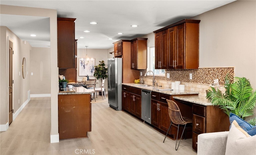 This Single story 4-bedroom, 2-bath home offers the perfect blend of comfort and opportunity, ideal for a growing family or as a rental for Loma Linda University students. Excellent location - less than two miles from the VA Ambulatory Center, VA Hospital, and Drayson Athletic Center; freeway close as well. Enjoy brand-new flooring throughout and a spacious backyard with room for an ADU. An updated kitchen separates a family room with a fireplace and a dining room with slider access to the backyard with a covered patio. There is a primary bedroom with it's own bathroom, and three additional bedrooms - all with brand new carpets. indoor laundry is next to the bedrooms. The yard is lined with fruit trees, making this the perfect spot for any green thumb. There is even RV parking, and an attached two car garage with direct access into the home. Excellent Redlands schools.