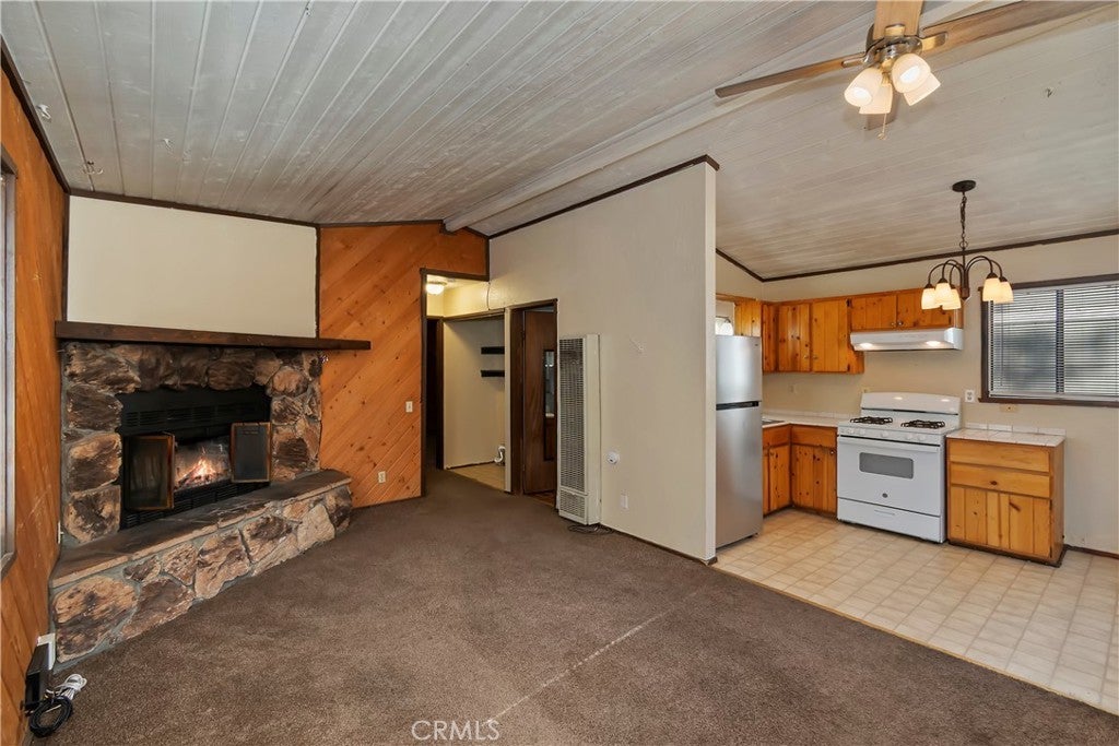 Welcome home to this charming single-story retreat featuring an open floor plan, beamed ceilings, and a stunning mountain rock fireplace that creates the perfect cozy atmosphere. This 2-bedroom, 1.5-bath home includes convenient inside laundry and plenty of natural light throughout. Enjoy peaceful mornings on the inviting front porch and make the most of the fenced yard for pets, gardening, or outdoor relaxation. Full of character and potential, this property is ready for your personal touches. Whether you’re looking for an affordable full-time residence or a weekend escape, this mountain retreat offers comfort, charm, and room to make it your own.