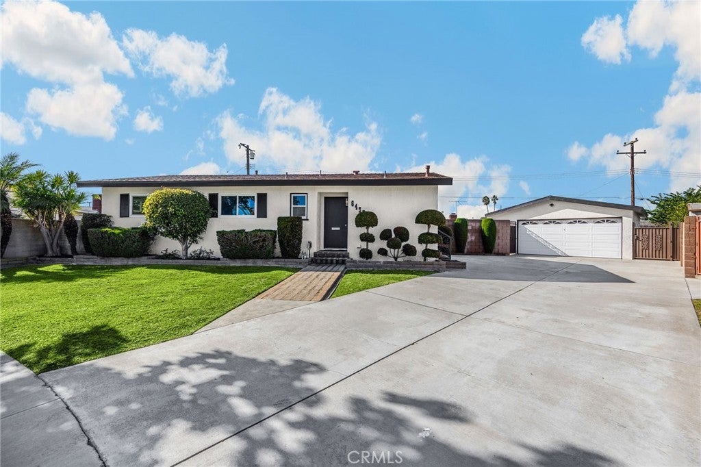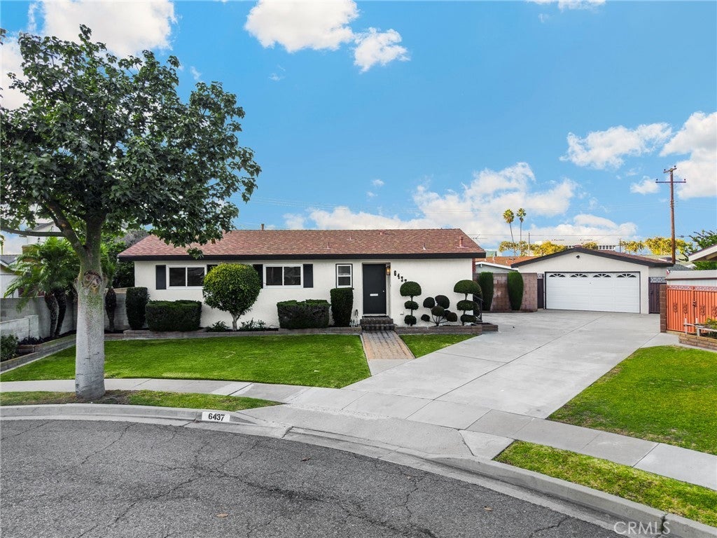 Welcome to 6437 Pheasant Circle, a well-kept 3-bedroom, 1.5-bath single level home set on a spacious 7,743 sq ft lot in a quiet Buena Park cul-de-sac. This 1,243 sq ft residence has been updated with fresh interior and exterior paint, new carpet, new ceiling fans and remodeled full bathroom featuring a new bathtub, tile flooring, vanity, and fixtures. The kitchen has refreshed cabinetry with a clean, modern coat of paint. An extra-long driveway provides RV parking and leads to a 2-car garage with a convenient drive-through design, offering added flexibility for parking, storage or backyard access. The garage is equipped with 220-volt wiring, making it EV-charging ready. The backyard includes a covered patio, storage shed and attractive landscaping, creating a comfortable space for everyday outdoor living. With its generous lot size, the property offers excellent potential for expansion, including adding an ADU, creating a fantastic opportunity for additional income. Excellent neighborhood with a home that’s move-in ready and conveniently located close to Knotts Berry Farm, Buena Park Mall and the 91 Freeway.