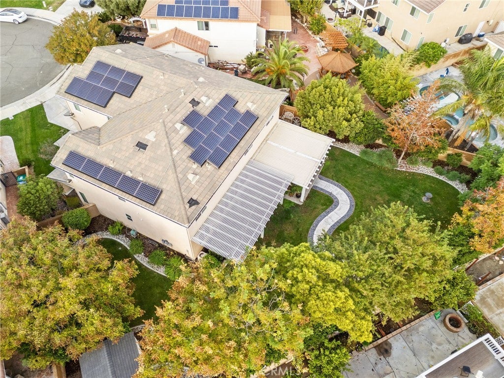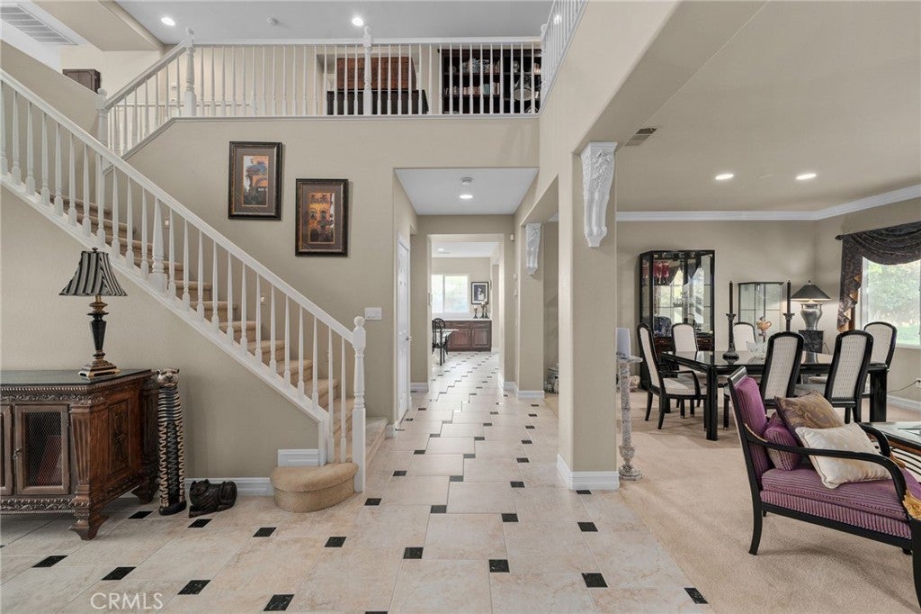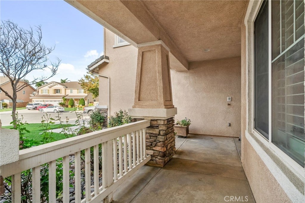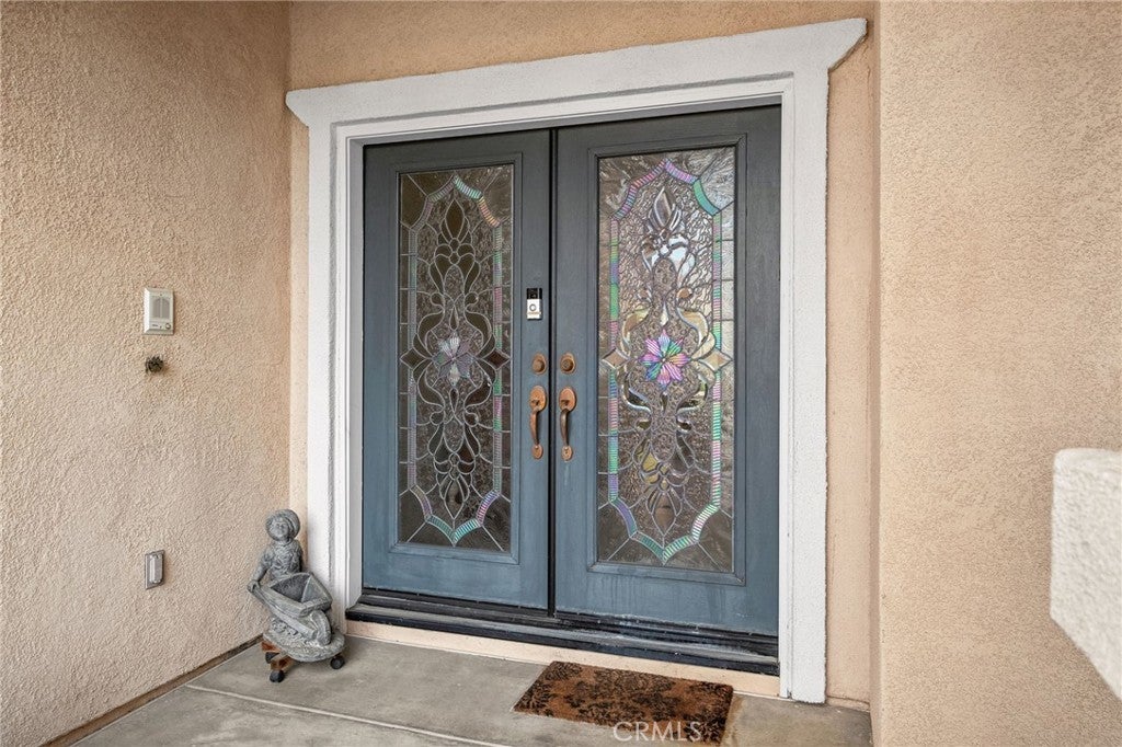 Welcome to this gorgeous Eastvale home, perfectly positioned at the end of a peaceful cul-de-sac and showcasing stunning curb appeal. Beautiful, well-maintained landscaping frames the inviting front porch and custom-designed glass double front doors, created by an artist and featuring a blend of clear, textured, etched, and beveled glass. Additional decorative privacy windows in the family room and primary bathroom echo this elegant style. Inside, you’re welcomed by soaring ceilings, plantation shutters throughout, and beautiful tile flooring. Just off the entry is a double-doored office, highlighted by open railing views from above, adding to the home’s bright and open feel. The layout offers both a formal living room and a formal dining room, perfect for hosting gatherings. The main floor also includes a guest bedroom with its own full bathroom, as well as a convenient powder room. The expansive family room serves as the heart of the home, featuring crown molding, a built-in media niche, a cozy fireplace, built-in surround sound, and direct access to the backyard. Seamlessly connected is the open kitchen, which includes a large center island, abundant cabinetry, a built-in cooktop, and an extra-large walk-in pantry—an impressive highlight rarely found. Custom upgrades and thoughtful storage solutions make this space both functional and inviting. The home also includes PAID OFF solar panels, providing excellent energy efficiency and long-term savings. Upstairs, a charming reading nook leads to an extra-extra large loft—truly a super bonus room. This versatile space is ideal for a game room, media retreat, or additional living area, and features wood-style laminate flooring, also found in the upstairs bathroom. The oversized primary suite includes a spacious retreat area, plantation shutters, and crown molding. The primary bathroom is equally generous, offering dual sinks, a soaking tub, and a separate shower. Three additional bedrooms and another full bathroom complete the upper level. The backyard is beautifully designed with lush grass, thoughtful landscaping, and three patio coverings, providing multiple shaded areas ideal for entertaining, relaxing, or outdoor dining. Additional side yard space adds even more functionality. Located near shopping and top-rated schools, this home is bright, clean, upgraded, and exceptionally spacious—offering comfort, elegance, and luxurious living in one of Eastvale’s most desirable neighborhoods.