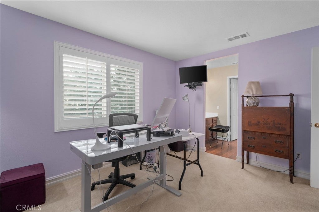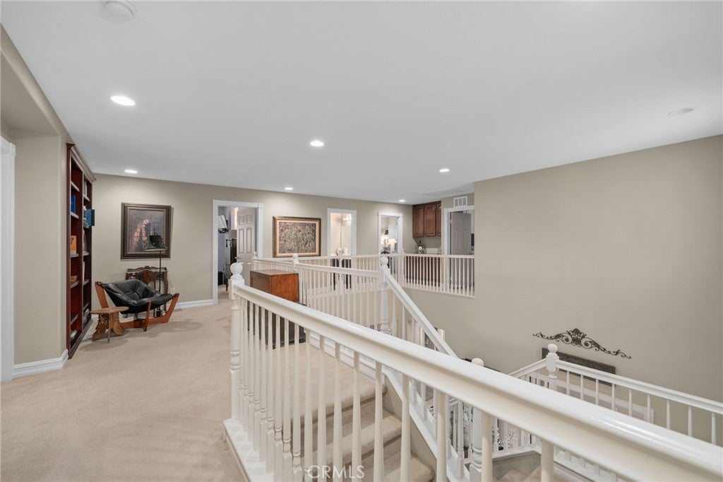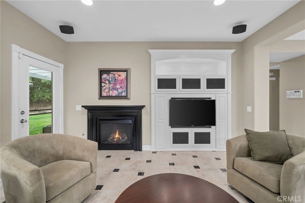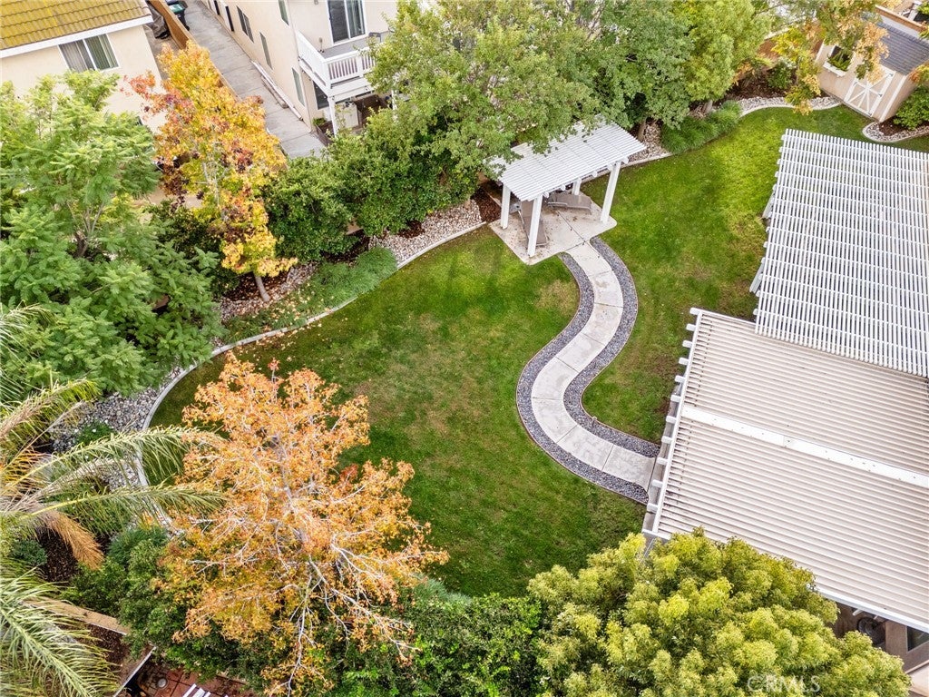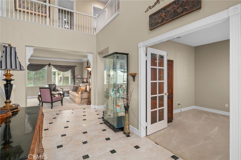 Welcome to this gorgeous Eastvale home, perfectly positioned at the end of a peaceful cul-de-sac and showcasing stunning curb appeal. Beautiful, well-maintained landscaping frames the inviting front porch and custom-designed glass double front doors, created by an artist and featuring a blend of clear, textured, etched, and beveled glass. Additional decorative privacy windows in the family room and primary bathroom echo this elegant style. Inside, you’re welcomed by soaring ceilings, plantation shutters throughout, and beautiful tile flooring. Just off the entry is a double-doored office, highlighted by open railing views from above, adding to the home’s bright and open feel. The layout offers both a formal living room and a formal dining room, perfect for hosting gatherings. The main floor also includes a guest bedroom with its own full bathroom, as well as a convenient powder room. The expansive family room serves as the heart of the home, featuring crown molding, a built-in media niche, a cozy fireplace, built-in surround sound, and direct access to the backyard. Seamlessly connected is the open kitchen, which includes a large center island, abundant cabinetry, a built-in cooktop, and an extra-large walk-in pantry—an impressive highlight rarely found. Custom upgrades and thoughtful storage solutions make this space both functional and inviting. The home also includes PAID OFF solar panels, providing excellent energy efficiency and long-term savings. Upstairs, a charming reading nook leads to an extra-extra large loft—truly a super bonus room. This versatile space is ideal for a game room, media retreat, or additional living area, and features wood-style laminate flooring, also found in the upstairs bathroom. The oversized primary suite includes a spacious retreat area, plantation shutters, and crown molding. The primary bathroom is equally generous, offering dual sinks, a soaking tub, and a separate shower. Three additional bedrooms and another full bathroom complete the upper level. The backyard is beautifully designed with lush grass, thoughtful landscaping, and three patio coverings, providing multiple shaded areas ideal for entertaining, relaxing, or outdoor dining. Additional side yard space adds even more functionality. Located near shopping and top-rated schools, this home is bright, clean, upgraded, and exceptionally spacious—offering comfort, elegance, and luxurious living in one of Eastvale’s most desirable neighborhoods.