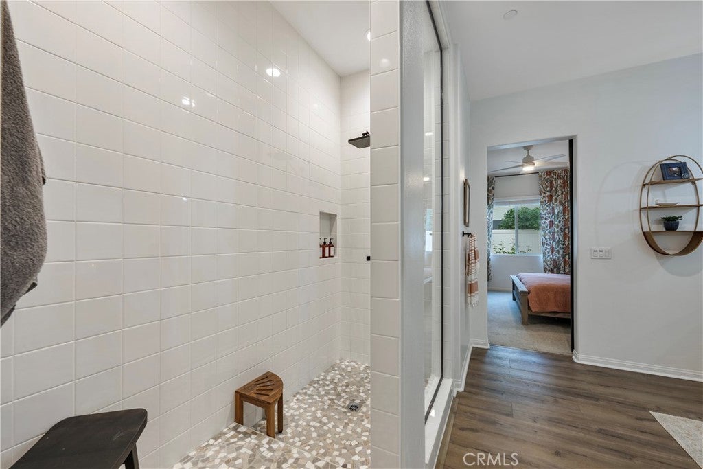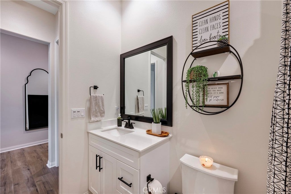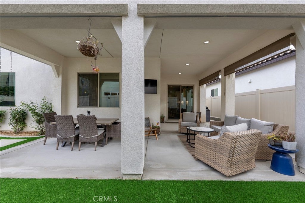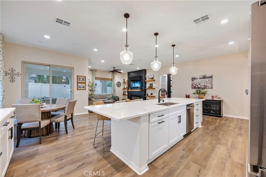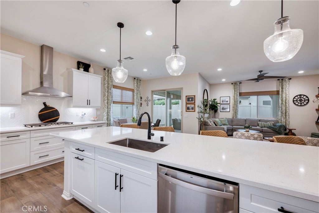 Welcome to 4124 Cameron Way, a captivating single-story home located in the gated community of Bedford, adjacent to the sought-after Eagle Glen neighborhood. This beautifully crafted residence offers 1,946 square feet of sophisticated living space, featuring 3 bedrooms and 1.75 bathrooms. Upon entering, you'll be greeted by high ceilings and luxurious LVP flooring that lead you into a spacious great room, perfect for entertaining and relaxation. The great room seamlessly connects to a chef's kitchen, equipped with a 5-burner cooktop with a hood, stainless steel appliances, a built-in oven, and a microwave. Quartz countertops grace the kitchen, bathrooms, and butler's pantry, complemented by a large island and custom fireplace. The primary suite offers a serene retreat with a large walk-in shower. A separate laundry room, located off the hall, enhances the home's convenience. Eco-friendly features include a solar power system and a Tesla charger. Step outside to a private backyard oasis, featuring a solid covered patio that wraps around, perfect for outdoor enjoyment. The professionally landscaped yard features artificial turf and custom hardscape for low-maintenance beauty. This vibrant community boasts several pools, a well-equipped gym, playgrounds, community rooms, and is conveniently close to the Hudson House, a popular community center. Enjoy nearby dining, shopping, parks, and the convenience of easy access to I-15, Masters Drive, and Foothill Parkway Express.