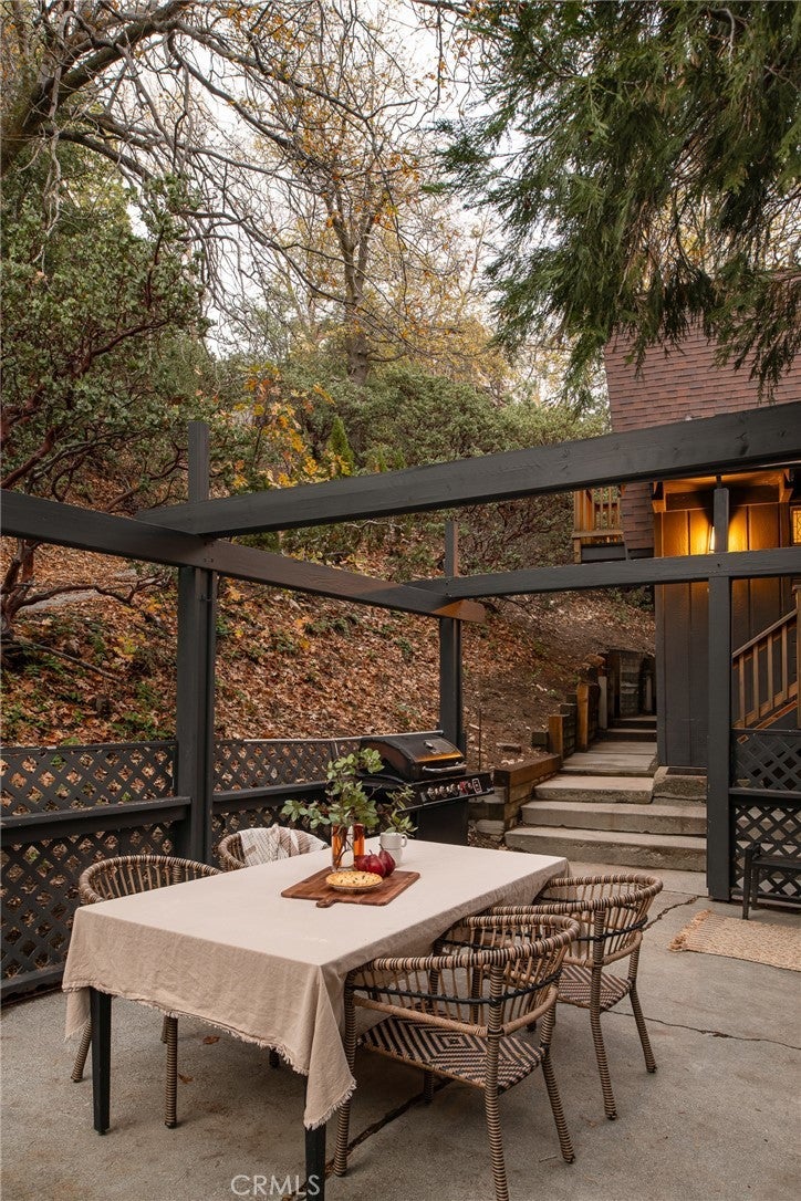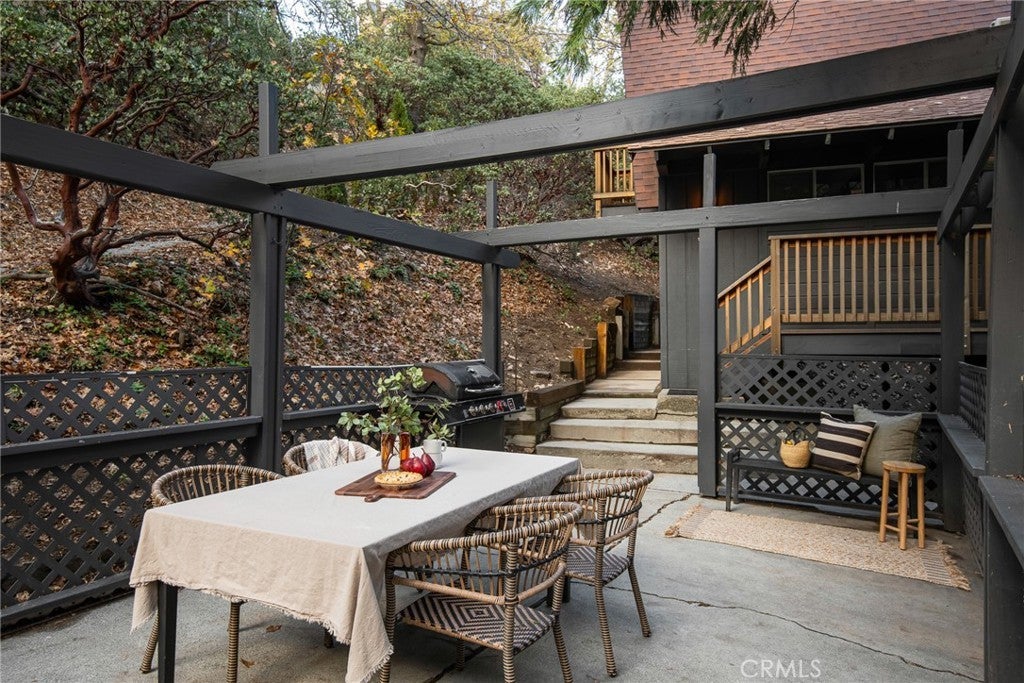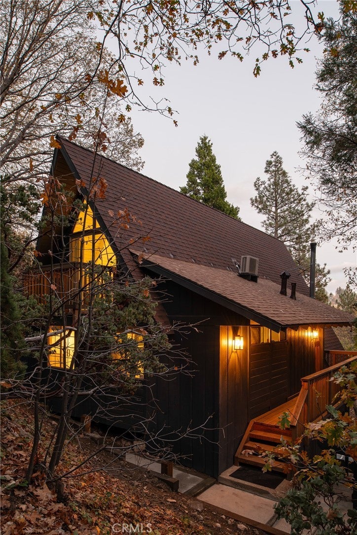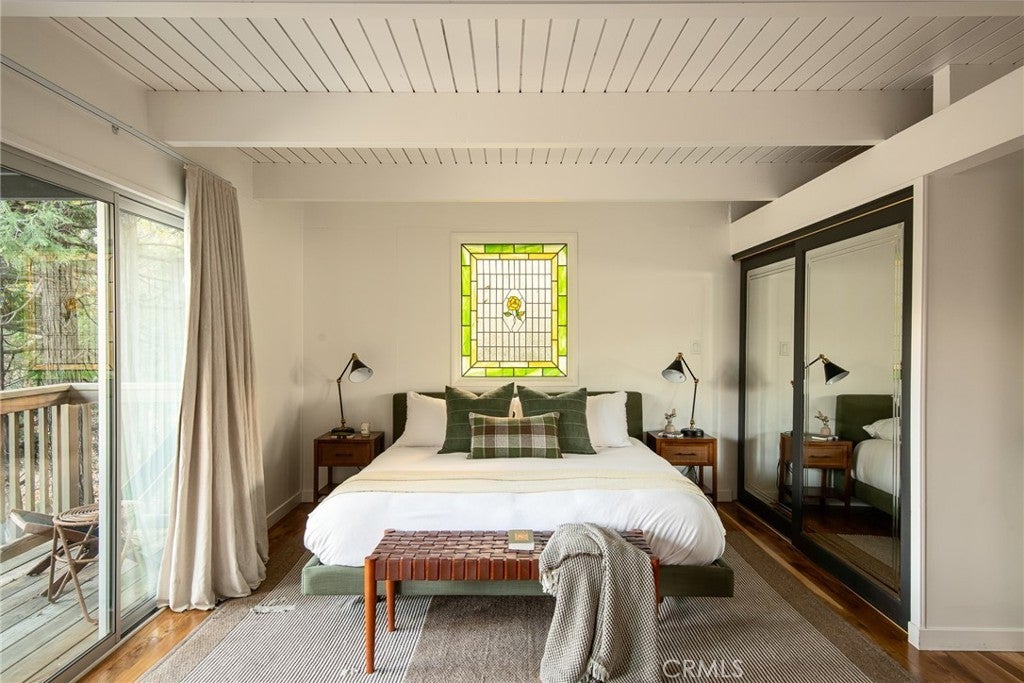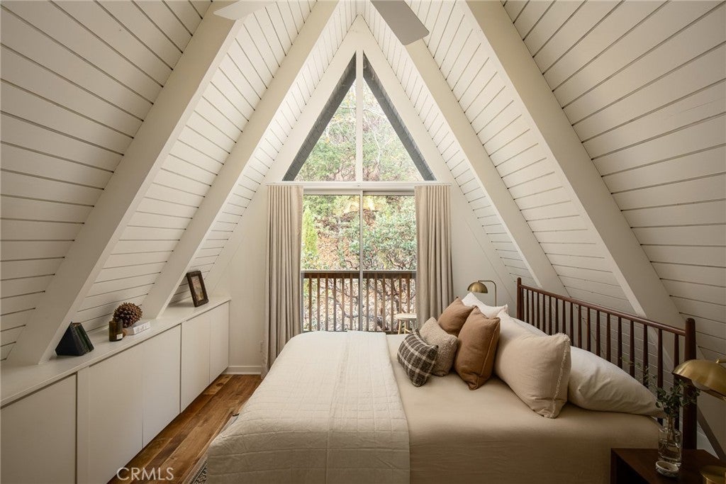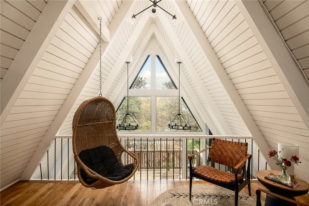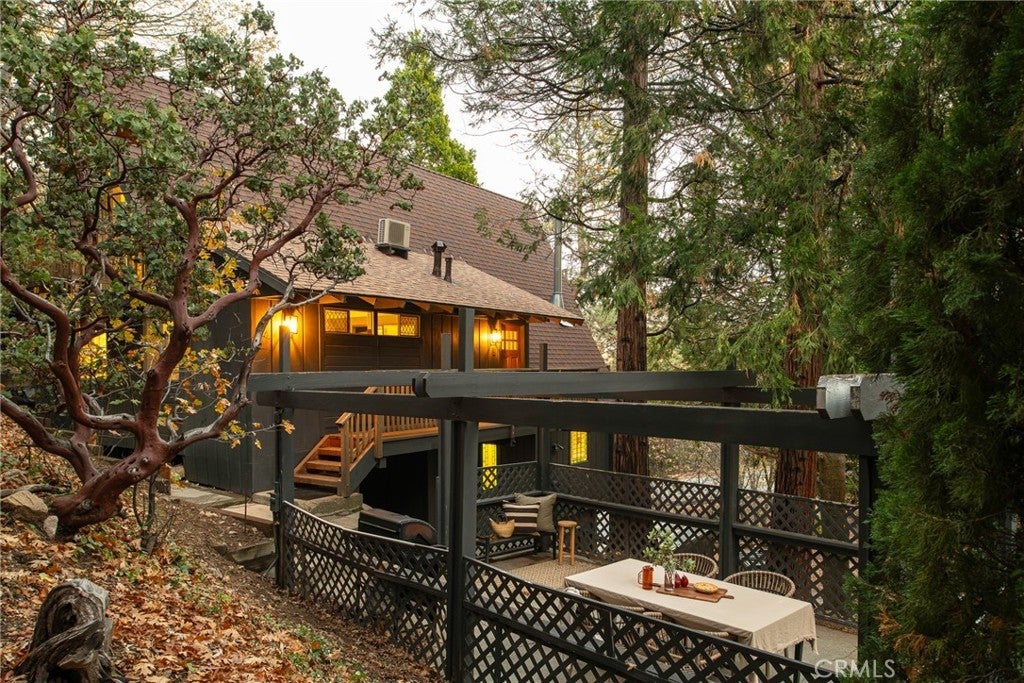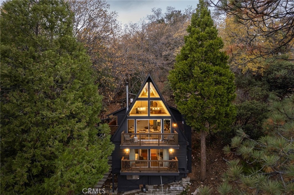 Indulge in elevated mountain living at this exquisitely remodeled A-frame lodge, perched on an expansive 13,000+ sq ft lot and designed to evoke the ambiance of a refined treehouse retreat. Dramatic vaulted, beamed ceilings and floor-to-ceiling windows accentuate the architectural beauty of the A-frame silhouette while bathing the interiors in natural light. A wood-burning fireplace anchors the main living space, surrounded effortlessly by an open-concept main space featuring an updated kitchen, where sage-green cabinetry, warm wood tones, and modern finishes create the perfect blend of style and functionality, a proper dining space and expansive main living space. The main level is also home to an adorable bunk room and stunning bathroom with elevated natural finishes. The private lower-level primary suite offers a serene haven, featuring a generous walk-in closet, a spa-inspired bathroom, and direct access to its own secluded deck. Throughout the home, custom built-in cabinetry provides thoughtful, elevated storage that complements the overall design. Stained-glass accents add artistic character and a touch of timeless luxury. The upper level hosts an additional bedroom along with an open loft lounge—an inviting retreat with unbeatable views framed by the home’s dramatic windows. Exceptional outdoor living is at the heart of this property, with multiple private decks on every floor and an expansive concrete patio ideal for elegant alfresco entertaining. A detached two-car garage provides convenience and ample storage. Situated in a premier location with coveted lake rights, this remarkable A-frame lodge offers upscale design, rare privacy, and the luxury of a sprawling lot—delivering a truly unparalleled mountain living experience.