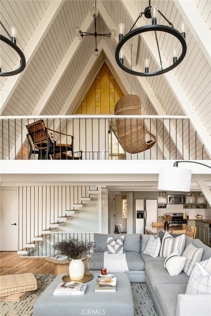 - Interior FeaturesBeamed Ceilings, Built-in Features, Eat-in Kitchen, High Ceilings, Living Room Deck Attached, Multiple Staircases, Open Floorplan, Two Story Ceilings, Bedroom on Main Level, Loft, Primary Suite, Walk-In Closet(s), Wood Product Walls