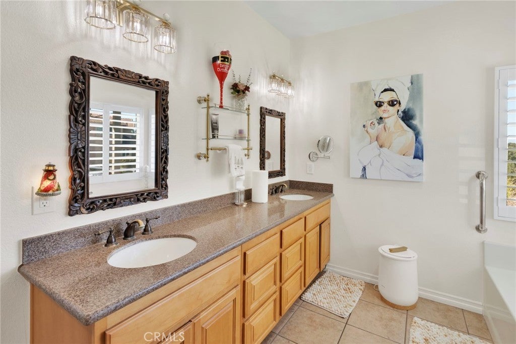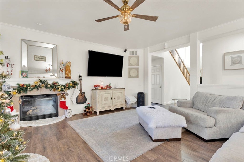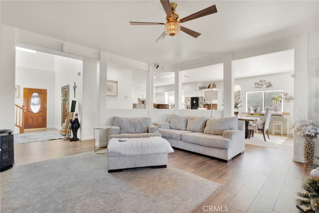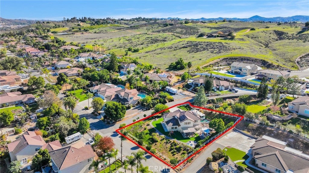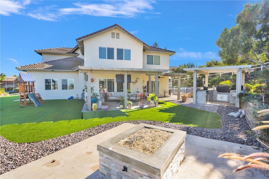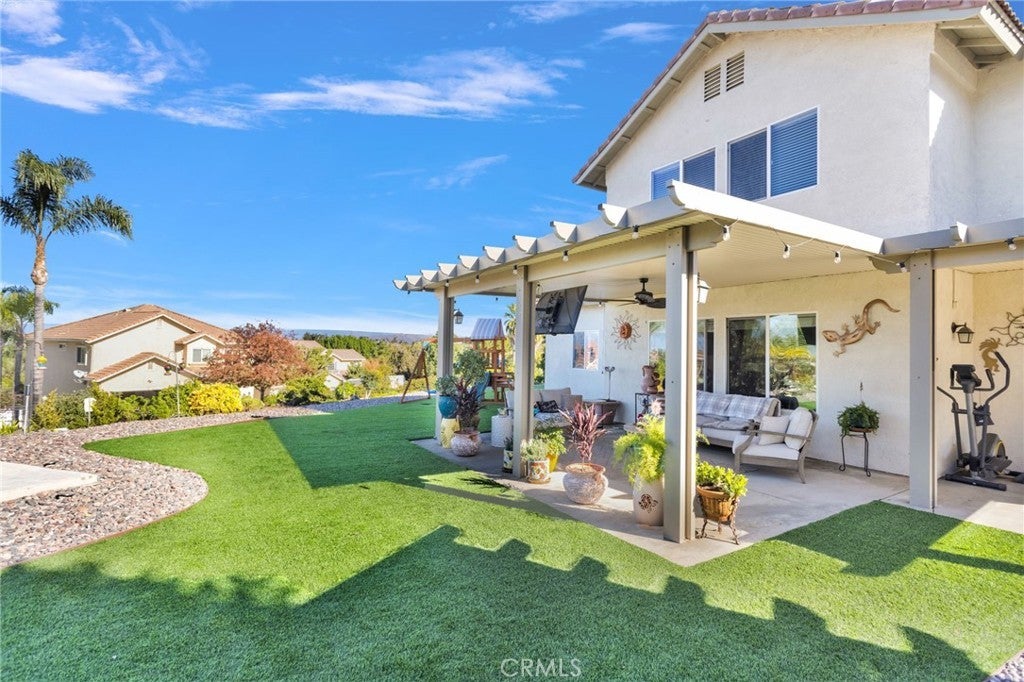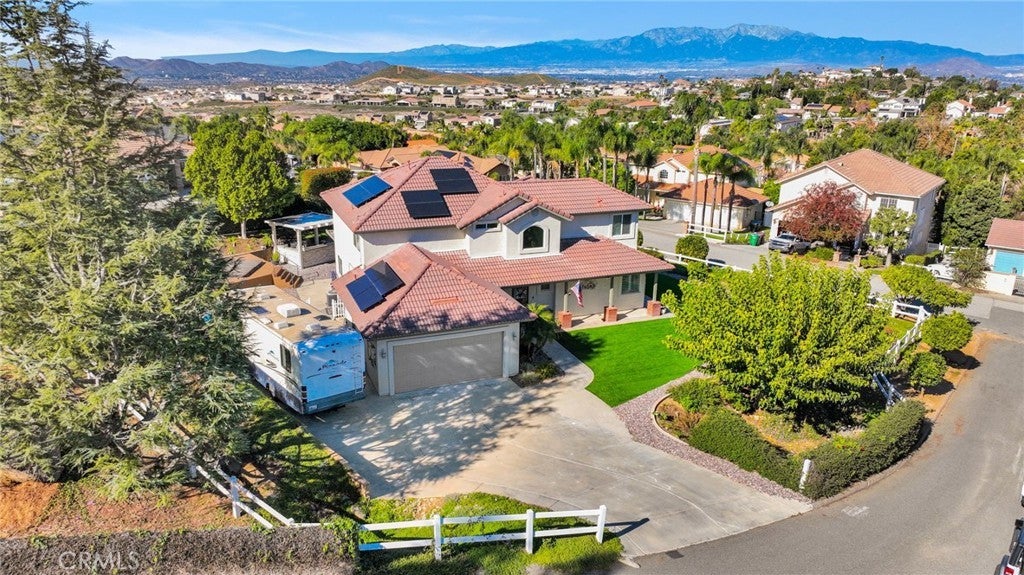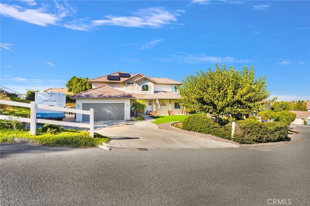 Where Panoramic Beauty Meets Everyday Living! This entertainer’s dream is situated on over a half-acre in one of Canyon Ridge Estates’ most secluded and sought-after cul-de-sac locations. Enjoy breathtaking rolling-hill and city-light views from this serene South Riverside retreat—complete with PAID SOLAR for exceptional energy savings and efficiency. The backyard has been newly transformed with top-of-the-line artificial turf, an above-ground spa with a custom deck, and a beautiful outdoor living area featuring a stone-built fireplace. The impressive stone outdoor kitchen includes a built-in BBQ, refrigerator, sink, ample storage, and a covered patio—perfect for year-round gatherings. Lush landscaping and mature fruit trees (multiple varieties of orange, apple, lemon, key lime, guava, grapefruit, and mandarin) line the property, creating a peaceful setting that feels worlds away yet close to everything. Inside, natural light fills the inviting foyer and flows into the living room with a beautifully updated fireplace façade. The open floorplan continues into the spacious dining area and kitchen, which features a grand island, stainless steel appliances including a double oven, full granite backsplash, and well-appointed cabinetry. A custom walk-in pantry and dedicated laundry room with sink and storage enhance function and convenience. The lower level also offers a generous powder room and a downstairs primary suite with double-door entry, abundant sunlight, walk-in closet, and a large ensuite bathroom with dual sinks, granite counters, separate shower, and soaking tub. Upstairs, you'll find a bright secondary bedroom, a massive bonus room with custom built-ins (ideal as an office, fitness room, or media space), an additional bathroom with dual sinks and privacy tub/shower, and two more spacious bedrooms. Wood-like tile flooring spans the entire lower level, while carpeting keeps the upper level comfortable and warm. Energy efficiency is further enhanced by TWO whole-house fans and split-level air conditioning. The exterior has been recently painted. RV or toy parking is available, providing even more flexibility. The original owners have cared meticulously for this home, and it shows in every detail. A rare combination of seclusion and convenience—just minutes from shopping, freeway access, dining, and entertainment. LOW TAXES, NO HOA, and PAID SOLAR. Welcome to your next home.