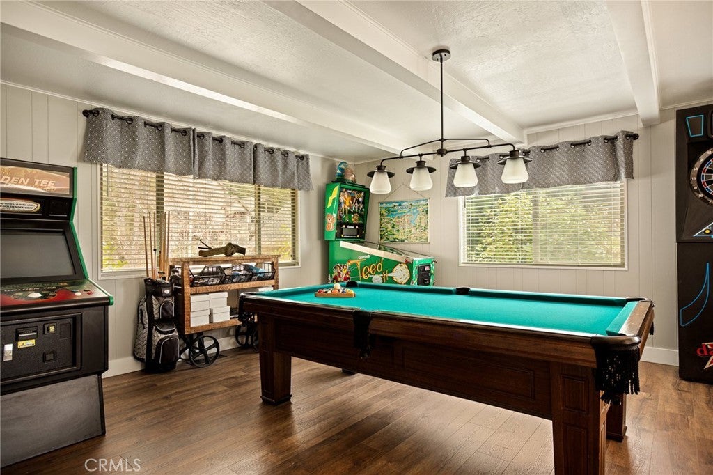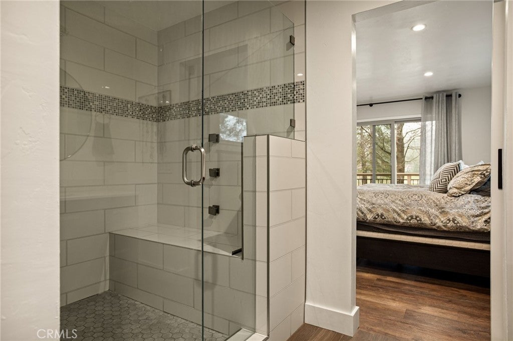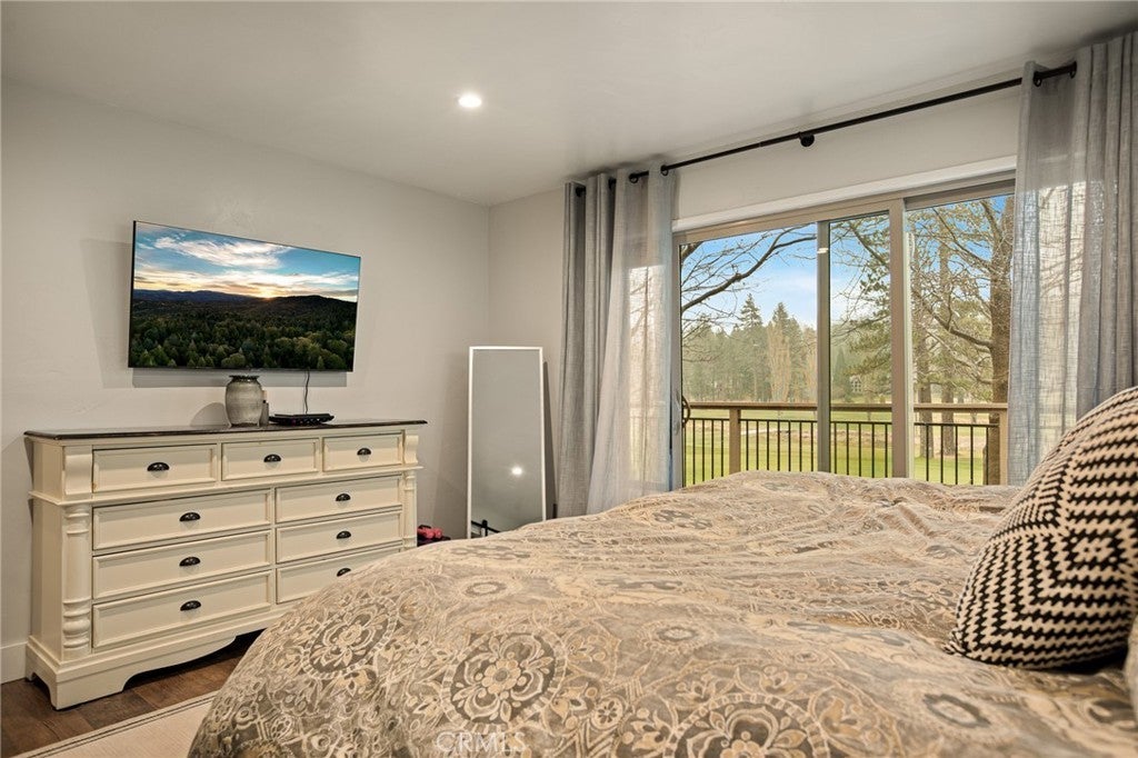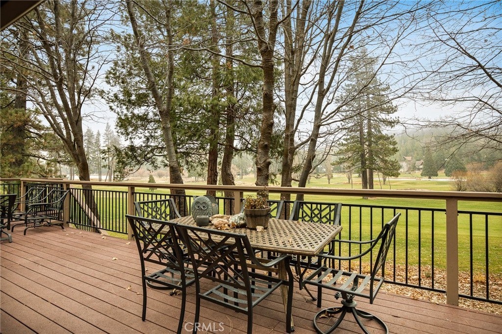 Located on one of Lake Arrowhead’s most desirable streets, this exceptional home sits on a quiet and private cul-de-sac along the front nine of the golf course. A circular driveway, level-entry access, and an expansive flat front yard create a rare and welcoming arrival. Nearly the entire home has been thoughtfully remodeled with elevated finishes throughout, including the addition of a tankless water heater and whole-house generator for comfort and peace of mind. Formal entry featuring a newly remodeled powder room, opening into a stunning two-story main living space with white-painted tongue-and-groove ceilings and exposed beams. Walls of oversized sliders flood the home with natural light and showcase sweeping golf course and lake views. The living room is anchored by a striking half-stack stone fireplace with a one-of-a-kind natural wood log mantel and shiplap detail above. The open-concept dining area easily accommodates eight or more guests and flows seamlessly into the newly remodeled kitchen, complete with custom knotty alder hood and island cabinetry, custom-painted cabinets, Fantasy Grey countertops, and a designer backsplash. Just beyond the kitchen, a newly added approximately 200-square-foot mudroom provides an ideal transition from the garage and includes laundry, pantry storage, and a functional workspace. On the opposite side of the main living area, a spacious game room offers a cozy seating area with its own fireplace, bar, and an expansive space perfect for billiards, arcade games, and entertaining. The primary suite is conveniently located on the main level and opens directly onto the deck, offering tranquil golf course views from bed. Spa-like ensuite features dual vanities, a large custom walk-in shower with rain shower head, wall and handheld fixtures, body sprayers, and a built-in bench, along with a generous walk-in closet. Outdoor living is exceptional, with expansive composite decking spanning the entire length of the home and stairs leading down to a flat yard and direct golf course setting. Positioned on the 8th fairway, the property enjoys views of multiple holes and three lakes. Upstairs, guests enjoy private accommodations on each side of the home, featuring oversized bedrooms with large closets, a centrally located bathroom, and a comfortable loft sitting area. A rare combination of privacy, level entry, extensive remodeling, modern systems, and premier golf course and lake views—this is Lake Arrowhead living at its finest.