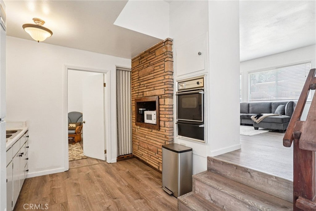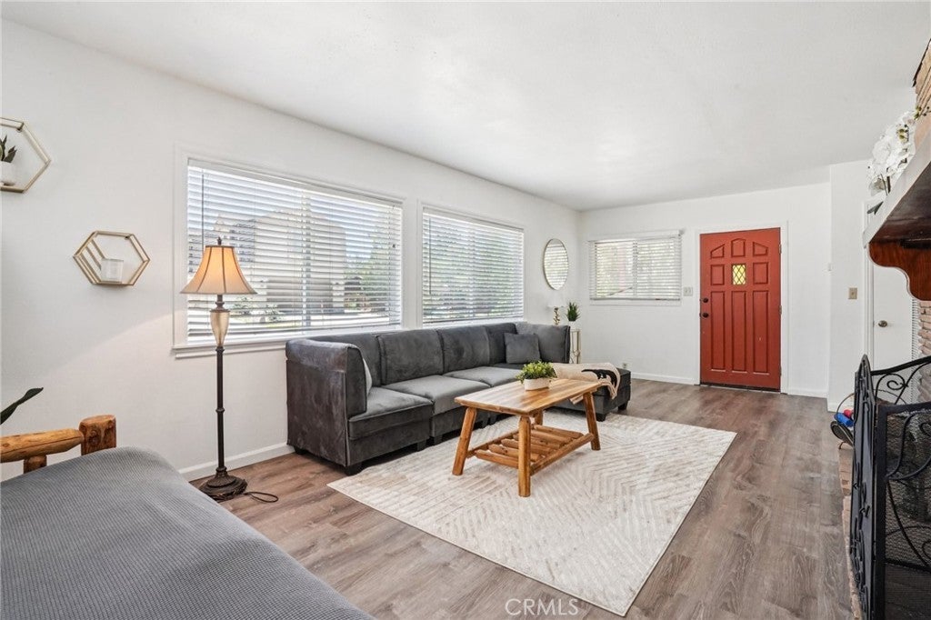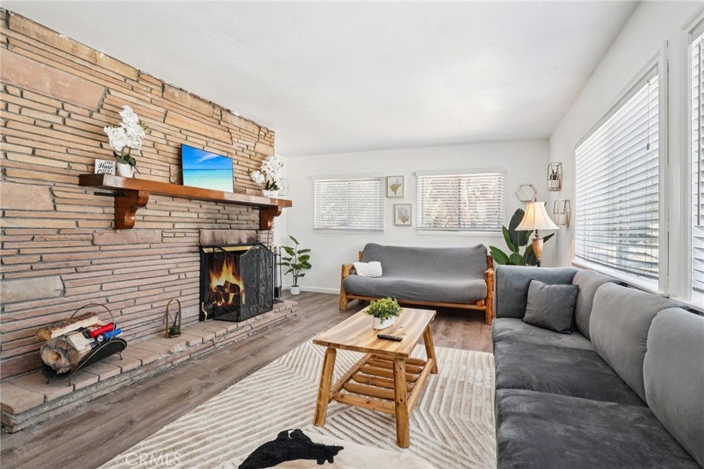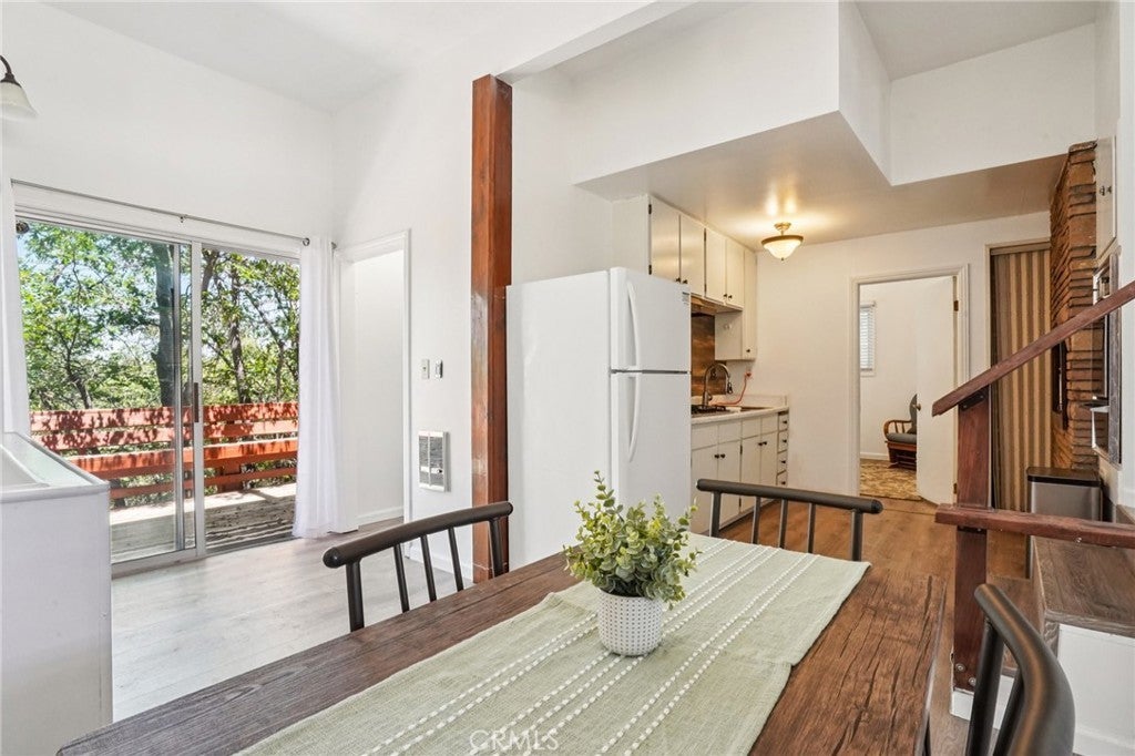 Set in Moonridge with quick access to Bear Mountain, the zoo, golf course, and the revitalized Moonridge commercial corridor, Bearfoot Retreat is a turn-key, move-in-ready 2 bed, 1 bath mountain cabin offering level entry and easy parking for three cars—an advantage in snow season. Inside, the main level features vaulted ceilings, large front picture windows, and an open-concept kitchen/dining area adjacent to the living room with fireplace; a short decorative step-down transitions from the entry/living zone to the kitchen/dining, full bath, and Bedroom 1. Durable LVP flooring runs through the common areas for low-maintenance living and smooth mobility, with carpet in both bedrooms for comfort. The downstairs level functions as Bedroom 2 or a flexible bonus space and opens to a second deck, complementing the primary front deck for outdoor lounging and gear staging. Updates are cosmetic throughout for a fresh, modernized feel while retaining cabin character. Practical details include wall heaters, level approach from street to front door, and straightforward snow-season access. The location places you close to lifts, trails, lake activities, dining, coffee, and groceries, making it a smart base for year-round recreation or an easy lock-and-go second home. Buyers will appreciate the straightforward layout, natural light from the picture windows, and dual-deck setup that extends the living space. Listing includes a 3D tour, video, and floor plan for clear orientation prior to showing; explore the media, then see how the home lives in person. Nearby Amenity List (approx. road distances): • Bear Mountain Ski Resort — ~1.2 mi • Big Bear Alpine Zoo — ~1.2 mi • Big Bear Golf Course/Clubhouse — ~1.1 mi • Snow Summit — ~2.6–3.0 mi • Moonridge Coffee Company — ~0.8 mi • Big Bear Lake (nearest marina) — ~2.0–2.5 mi • Vons Grocery (Big Bear Blvd) — ~2.1–2.3 mi