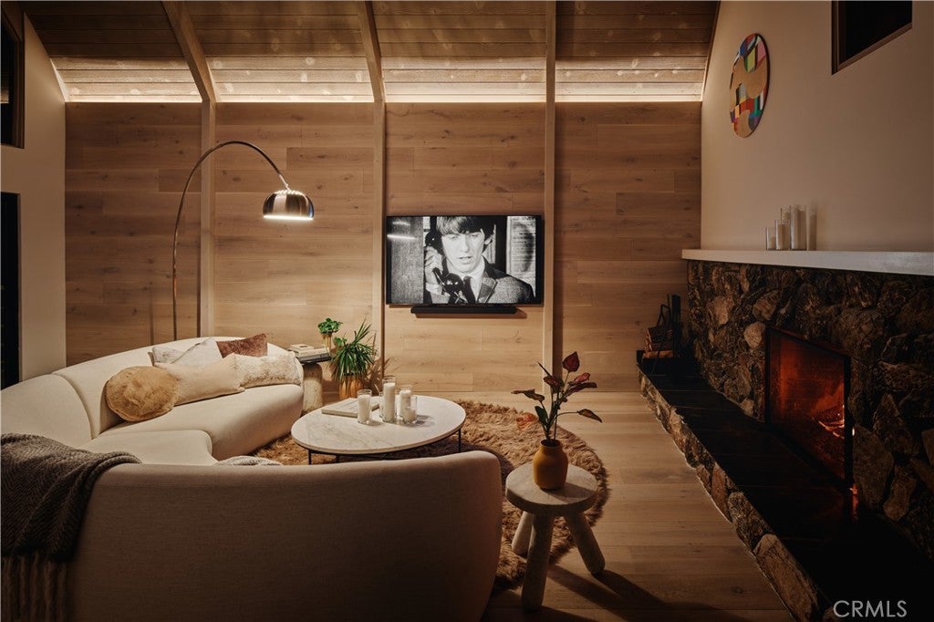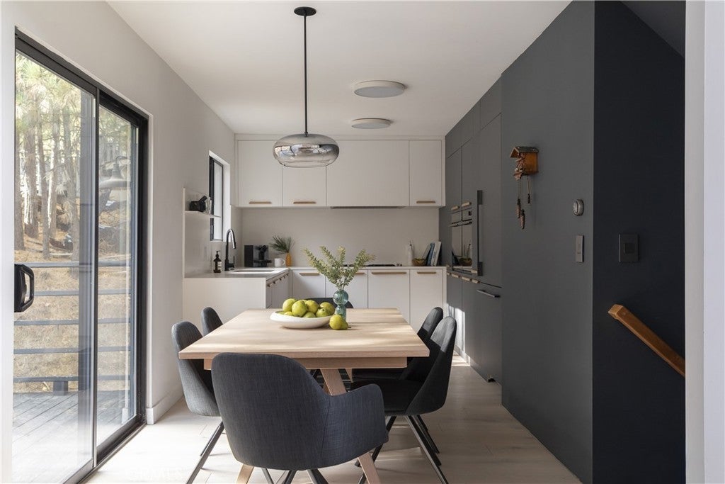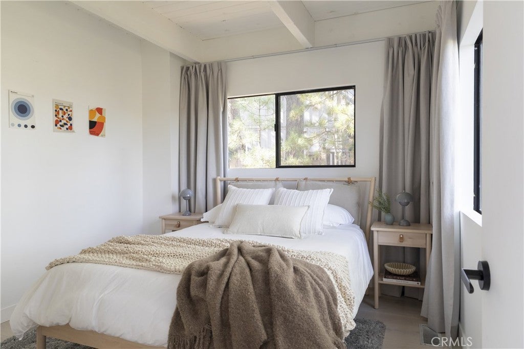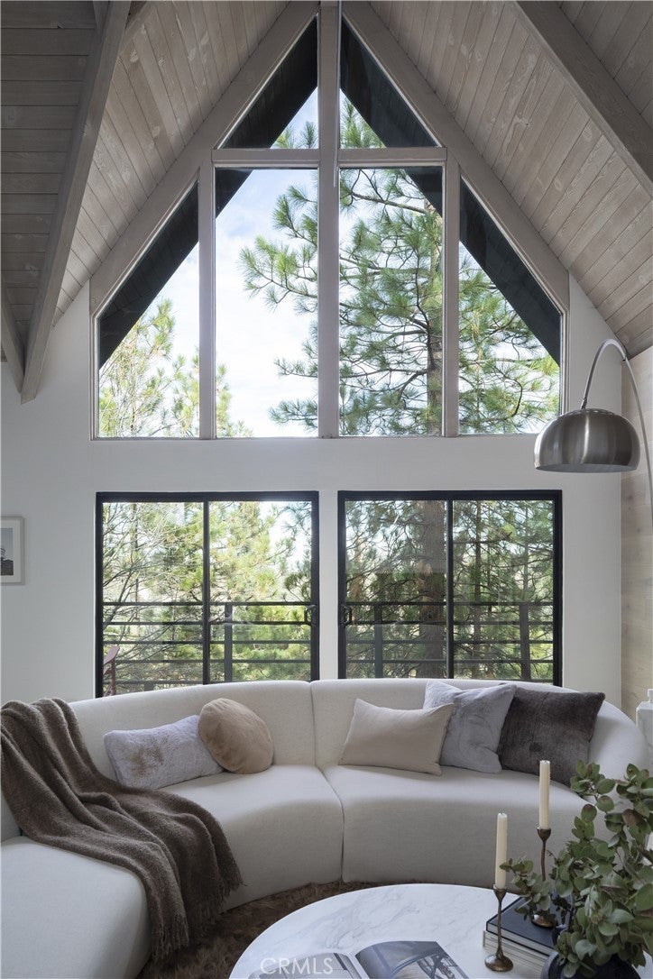 Perched in the pines of Lake Arrowhead, this striking architectural retreat reimagines a classic 1960s cabin into a sophisticated, modern mountain escape. Designed by Dan Brunn Architecture, a renowned firm known for thoughtful residential work, the home is defined by its rare double A-frame form, blending iconic character with a refined, minimalist palette inspired by Scandinavian and Japanese influences. Original wood elements were preserved and revived through walnut blasting, bringing warmth and authenticity to the contemporary upgrades throughout. Spanning three levels, the layout offers restful privacy on the lower floor with the primary suite, vibrant gathering spaces and a guest suite on the main level, and a dramatic loft retreat above. The central living room is anchored by a tumbled-boulder fireplace and framed by tall glass that captures sweeping forest views. A custom terrazzo countertop, navy Fenix cabinetry, and curated lighting elevate the kitchen and dining space into a true showpiece, while mid-century influences and soft textures add depth and comfort. Outdoor living takes full advantage of the setting, relax on the deck overlooking the trees or soak in the jacuzzi and breathe in the crisp mountain air. Just beyond the backyard, a forest trail leads directly to the UCLA Conference Center and Tavern Bay Beach Club, only a short walk or easy golf-cart ride away, placing you in one of Lake Arrowhead’s most desirable locations. Sustainability guided the transformation, preserving the original structure while enhancing comfort and style. Perfect as a high-end investment or true mountain vacation home, Arrowhead Double A-Frame is a rare opportunity where architecture and nature meet in perfect harmony, just moments from the lake.