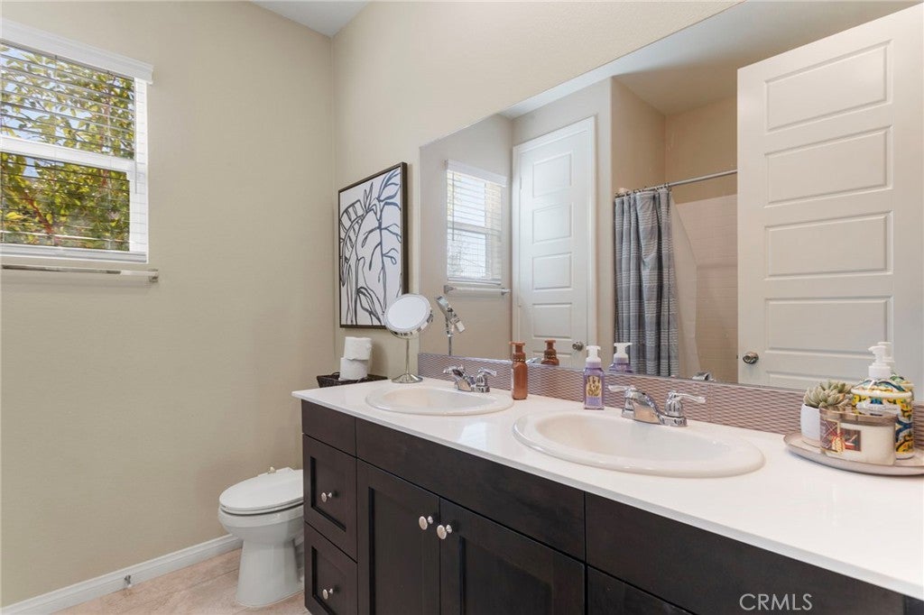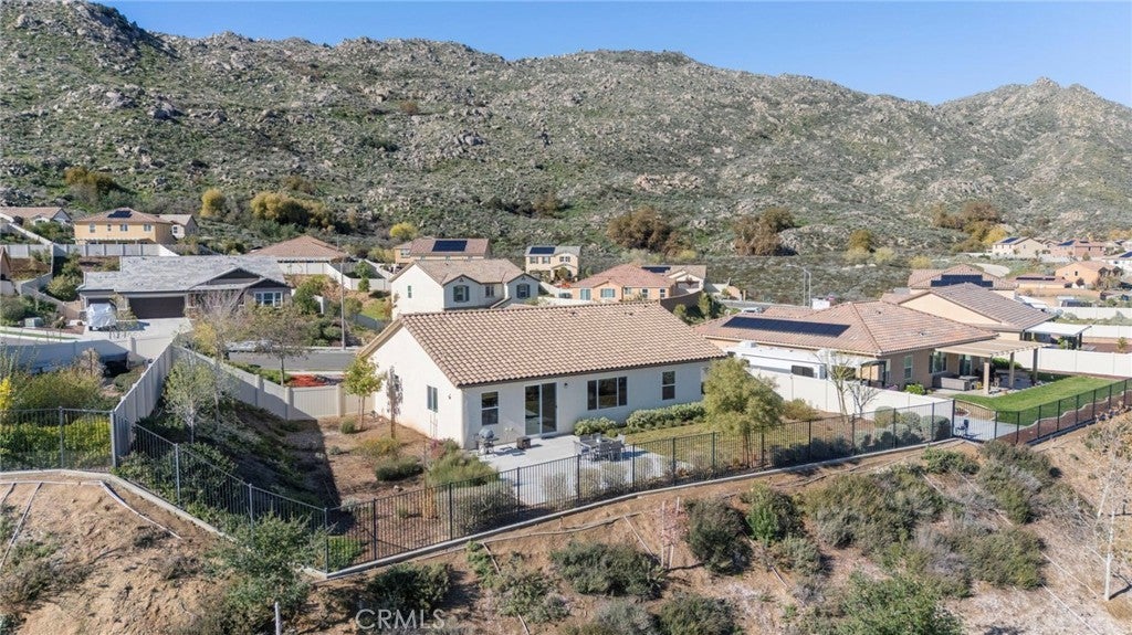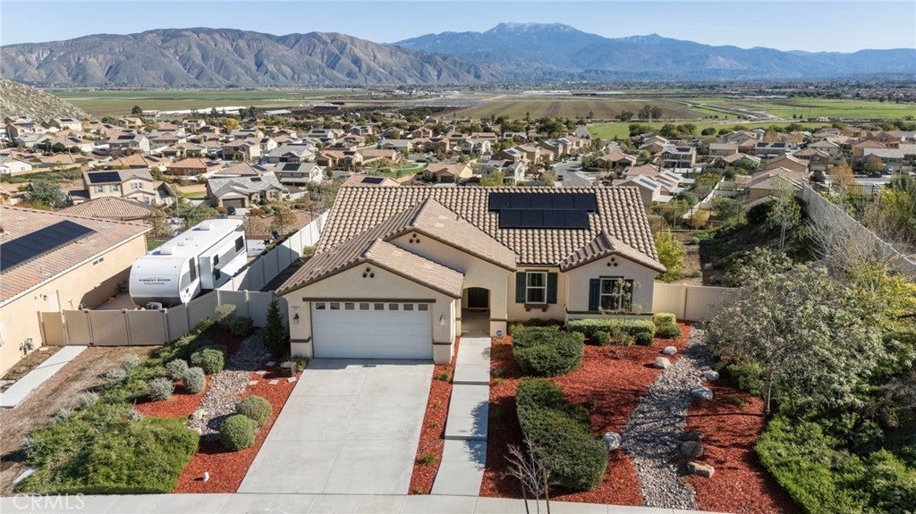 Step inside this former model home and immediately feel the open, airy layout designed to showcase some of the best panoramic views in all of San Jacinto. The entry opens into a bright open concept living room, dining area, and kitchen filled with natural light and incredible sunrise views. The kitchen features builder selected upgrades from its time as the model, including upgraded countertops, designer backsplash, and premium finishes that add both style and value. This space flows effortlessly for everyday living and entertaining. The primary suite offers beautiful views, a spacious walk in closet, dual vanities, and a separate water closet. Secondary bedrooms are thoughtfully located on the opposite side of the home, providing privacy and flexibility. Step outside to a finished backyard that extends the living space and takes full advantage of the large lot. One of the most valuable features of this home is the paid off solar system, resulting in a significantly reduced electricity bill, along with an EV charger, nine foot ceilings, surround sound, tankless water heater, and epoxy garage flooring. As a former model home with premium upgrades, breathtaking views, a finished backyard, and zero electric bill, this property stands out as a rare opportunity in San Jacinto.