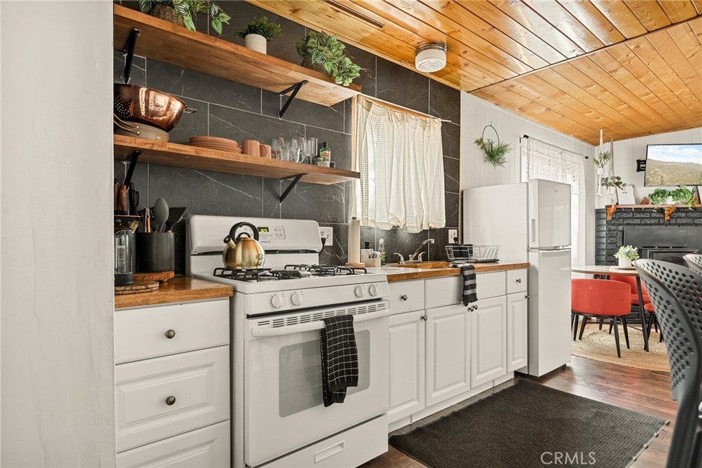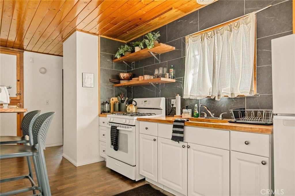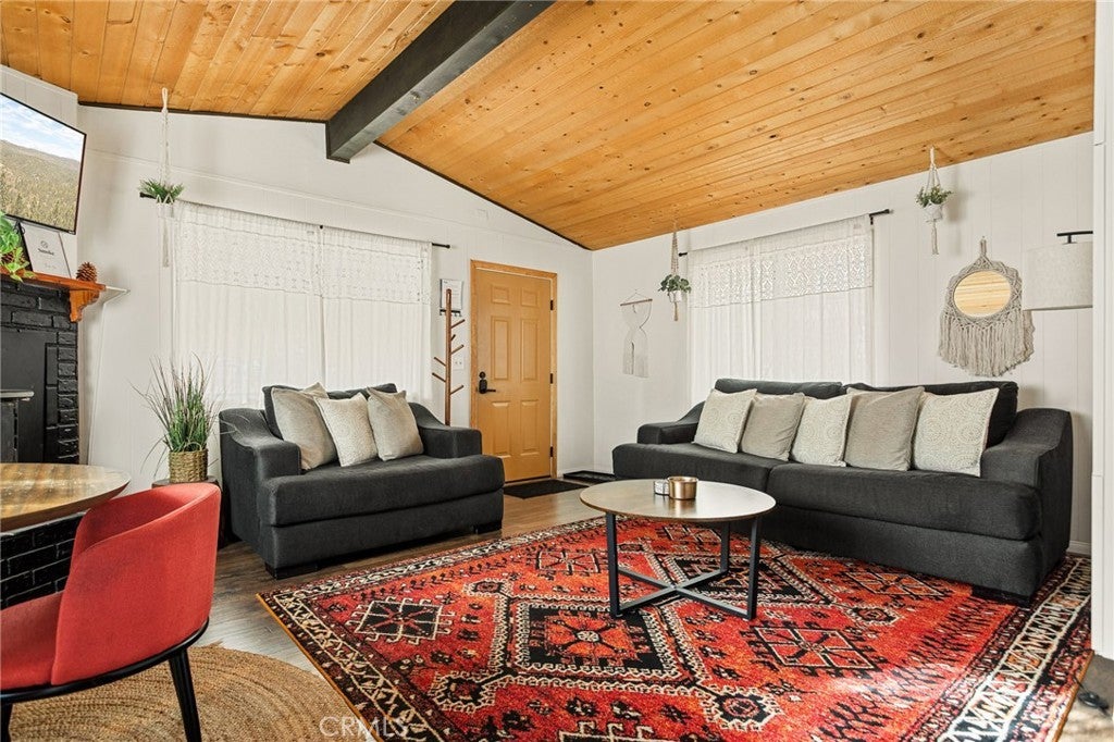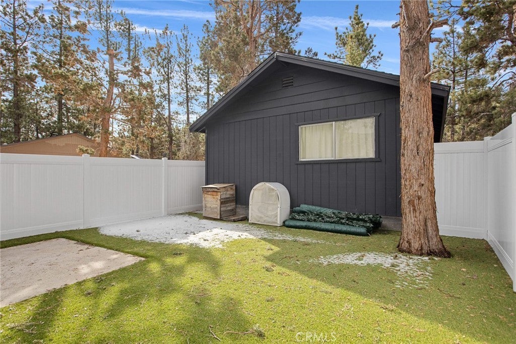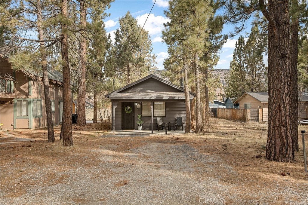 This stylish mid-century modern cabin blends retro charm with modern upgrades, making it the perfect short-term rental or private getaway in Big Bear. Nestled on a quiet street with serene mountain views, this home offers the ideal mix of relaxation and adventure. The open-concept living space features vaulted ceilings, a cozy brick fireplace, and large windows that flood the home with natural light and frame picturesque mountain scenery. The fully renovated kitchen and bathroom include brand-new plumbing, modern appliances, and a charming breakfast bar—perfect for entertaining. Both spacious bedrooms are thoughtfully designed with stylish mid-century furnishings, while the shared retro-inspired bathroom is conveniently located nearby. Outside, the newly enclosed yard offers a brand-new fence, freshly laid turf, and a concrete pad ready for a hot tub or fire pit, making it an ideal space for relaxation under the stars. Recent upgrades include new heater, new flooring, fresh interior and exterior paint, new locks, new exterior doors, and a roof in good condition. Whether you're looking for a profitable investment or a peaceful mountain retreat, this turnkey Big Bear cabin is ready for you! Lease considered...ask agent for details!