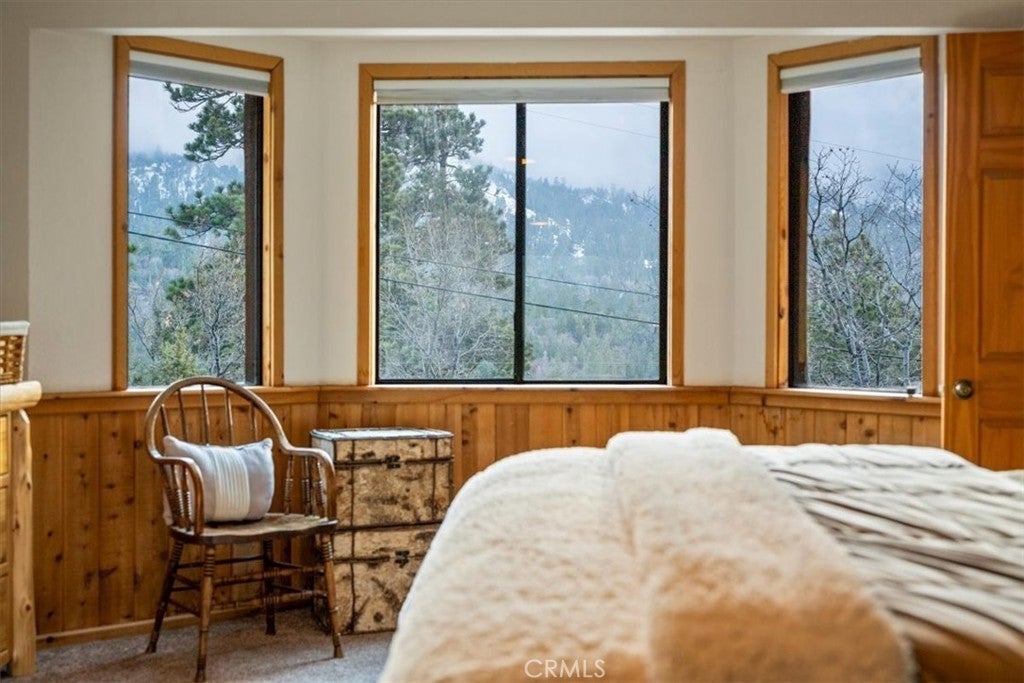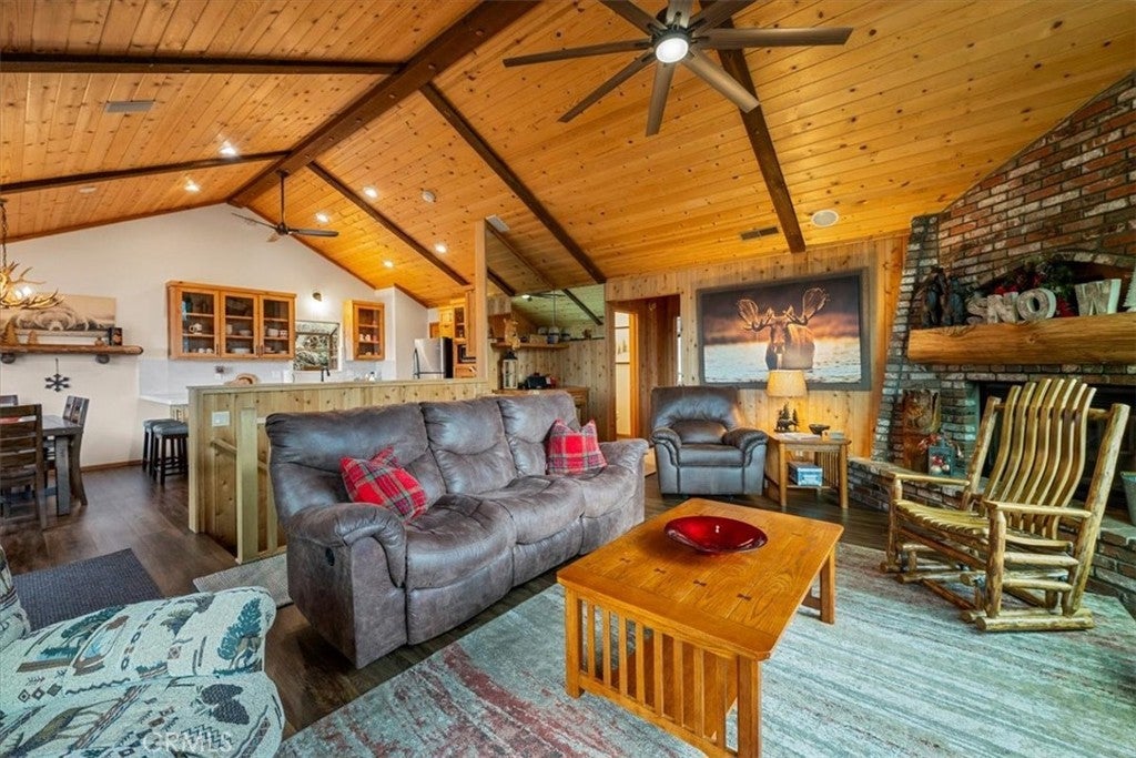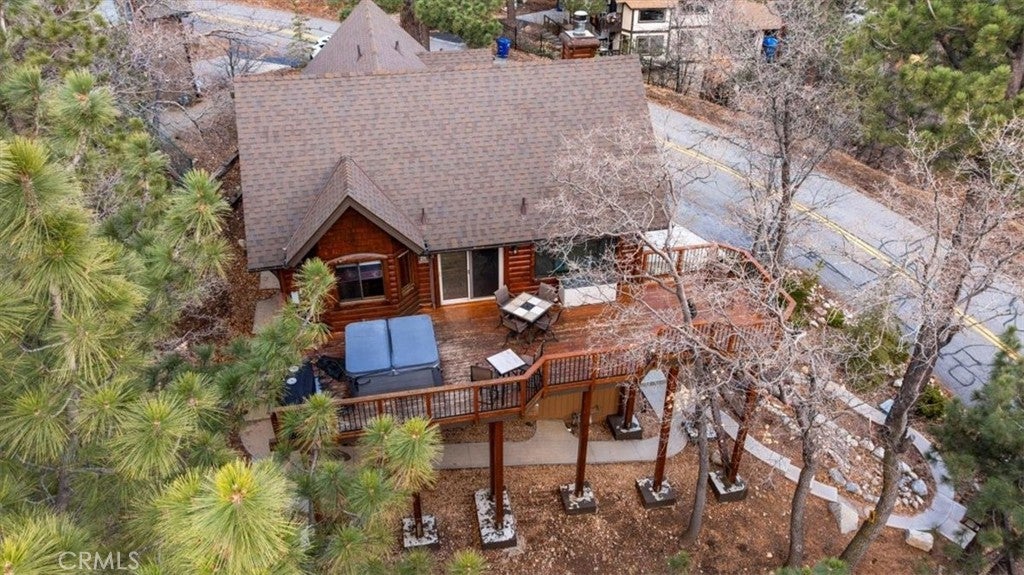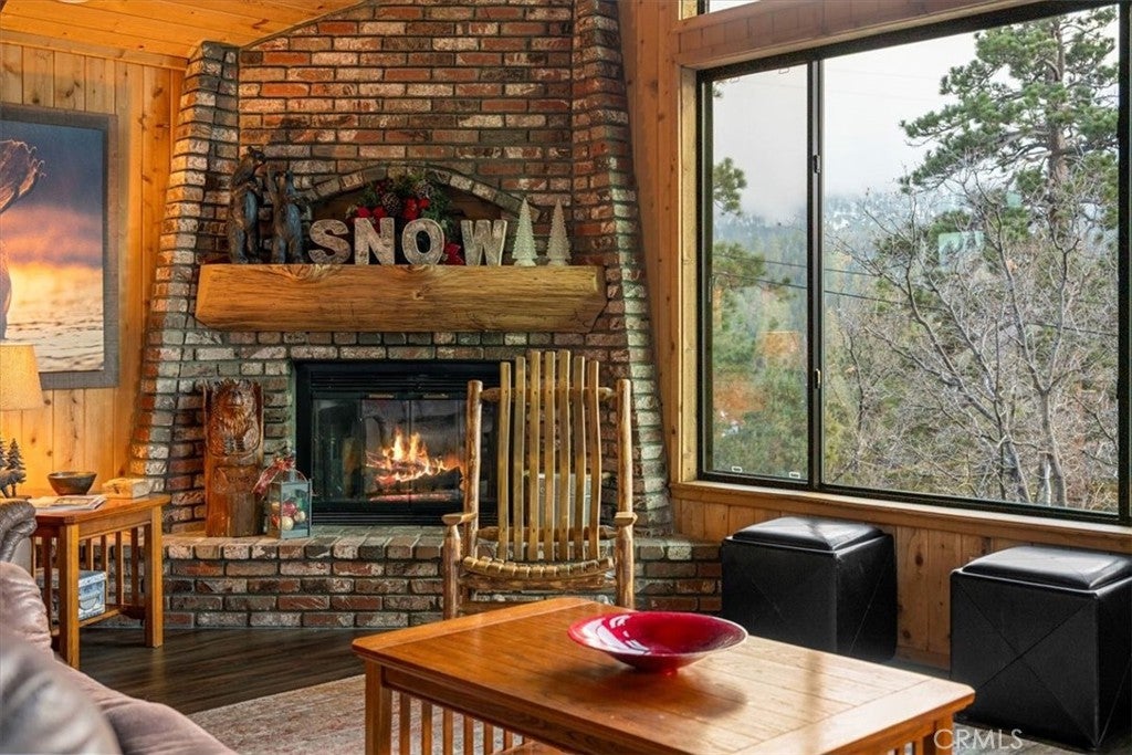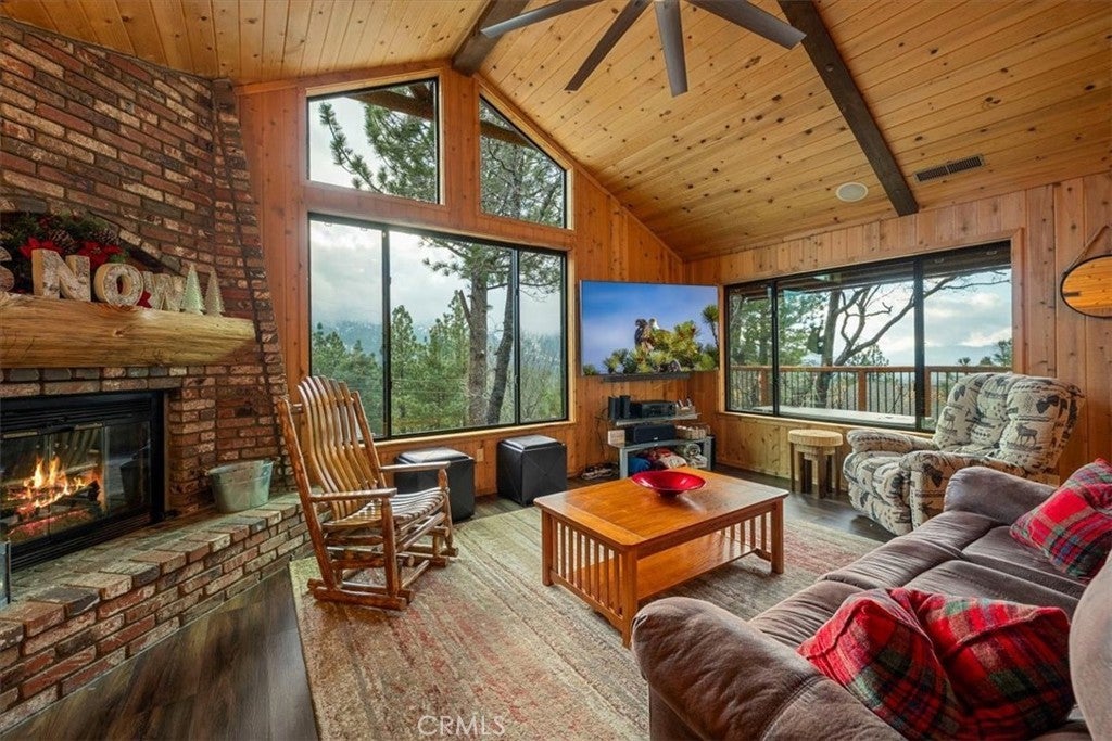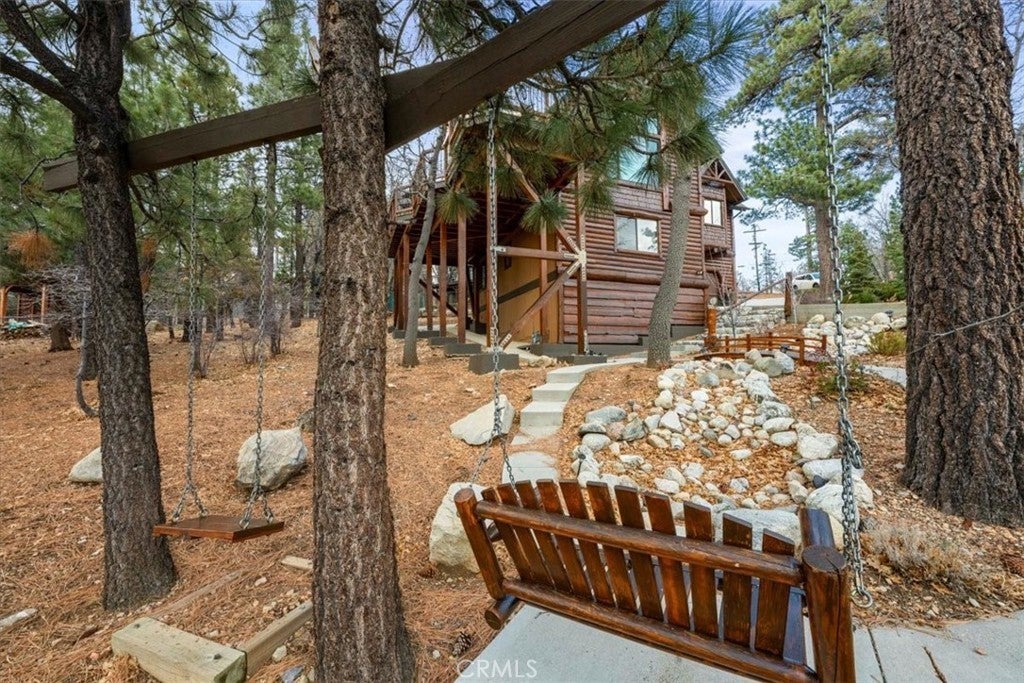 Gorgeous Upper Moonridge Luxury Cabin on a Quiet Street Welcome to this exceptional Upper Moonridge retreat—a beautifully crafted log-siding cabin nestled on a quiet street and offering breathtaking panoramic views of Big Bear Lake, Bear Mountain Ski Resort, surrounding mountains, and neighboring luxury homes. This impressive 3-bedroom, 3-bathroom residence reflects quality construction and timeless mountain charm, lovingly maintained and admired throughout. The brand-new kitchen features modern upgrades including granite countertops, new cabinetry, wood flooring, and a charming greenhouse window, with amenities thoughtfully designed for both style and efficiency. The spacious open-concept living area showcases high ceilings, abundant natural light, and an inviting layout ideal for gatherings, all framed by wide-open, inspiring views. A dedicated coffee and wine station adds a perfect touch for everyday enjoyment and entertaining. Cozy up by the classic brick fireplace or simply take in the sweeping scenery from nearly every angle. The primary suite is a true sanctuary, offering an ensuite bath, stunning views, and a private balcony—perfect for sipping morning coffee or enjoying peaceful birdwatching. Expansive upper-level wood decking provides an ideal setting for stargazing, sunny family gatherings, and entertaining friends. Unwind in the large 8-person hot tub while watching the snowfall or enjoying cozy mountain evenings. This outdoor haven is also perfect for viewing July 4th fireworks, with breathtaking sunsets that are especially magical from this elevated vantage point. Additional highlights include a tankless water heater, generously sized bedrooms, and seamless indoor-outdoor living. The property is beautifully landscaped with whimsical touches, including a charming bridge and swing. Priced to sell and ready to be cherished by its next owners, this remarkable home offers the perfect setting to create lasting mountain memories.