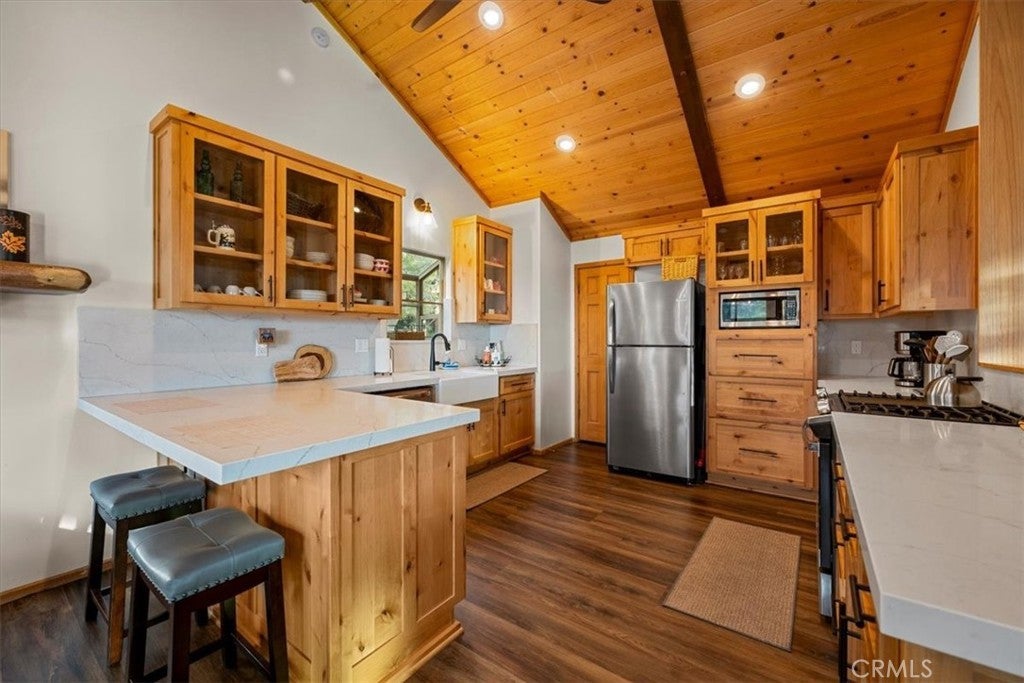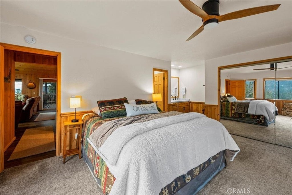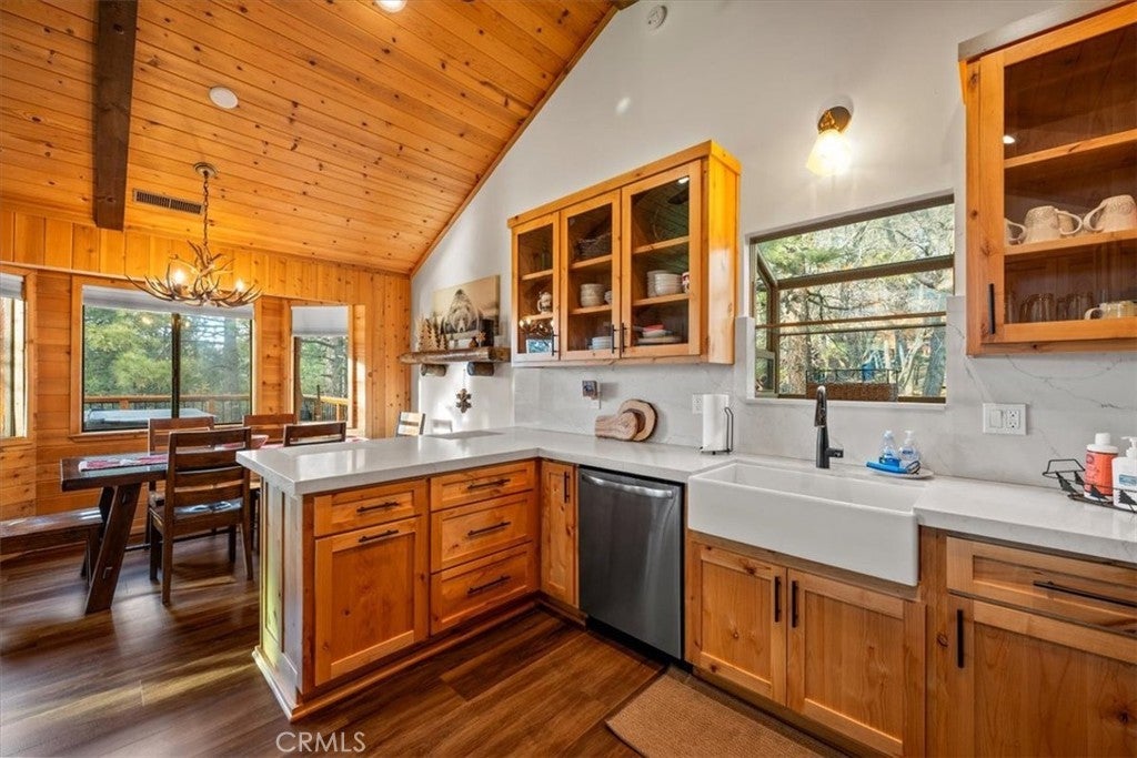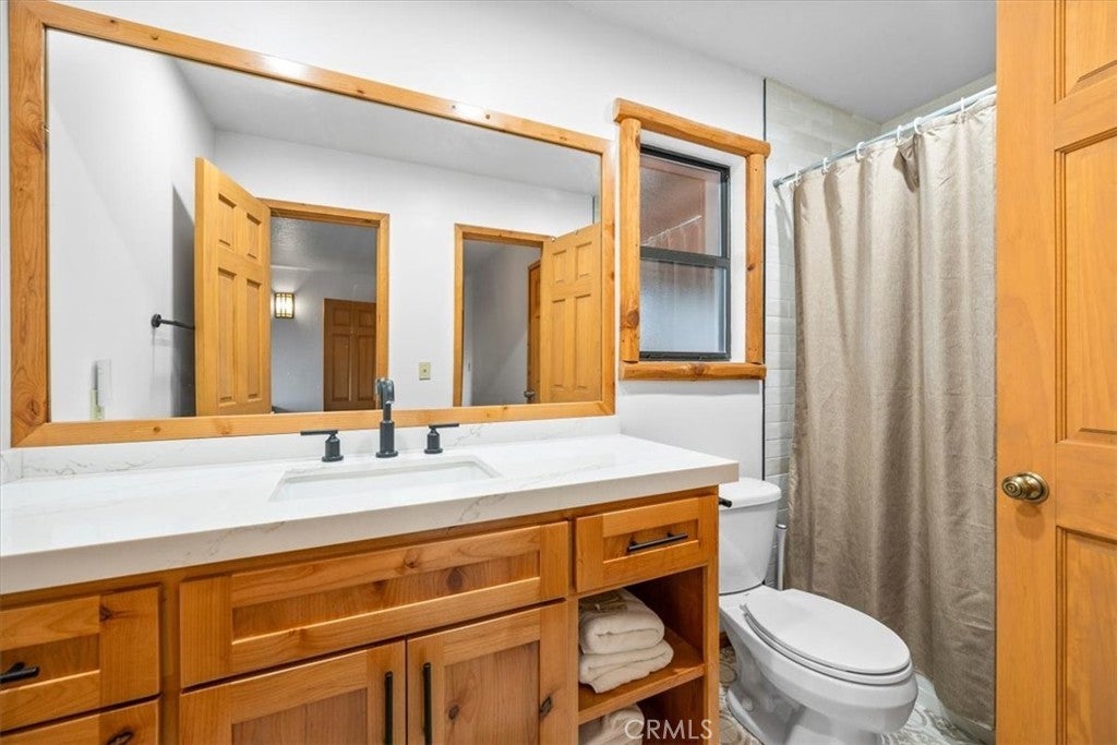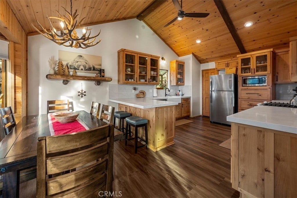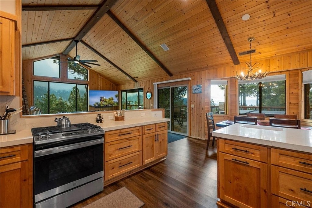 Gorgeous Upper Moonridge Luxury Cabin on a Quiet Street Welcome to this exceptional Upper Moonridge retreat—a beautifully crafted log-siding cabin nestled on a quiet street and offering breathtaking panoramic views of Big Bear Lake, Bear Mountain Ski Resort, surrounding mountains, and neighboring luxury homes. This impressive 3-bedroom, 3-bathroom residence reflects quality construction and timeless mountain charm, lovingly maintained and admired throughout. The brand-new kitchen features modern upgrades including granite countertops, new cabinetry, wood flooring, and a charming greenhouse window, with amenities thoughtfully designed for both style and efficiency. The spacious open-concept living area showcases high ceilings, abundant natural light, and an inviting layout ideal for gatherings, all framed by wide-open, inspiring views. A dedicated coffee and wine station adds a perfect touch for everyday enjoyment and entertaining. Cozy up by the classic brick fireplace or simply take in the sweeping scenery from nearly every angle. The primary suite is a true sanctuary, offering an ensuite bath, stunning views, and a private balcony—perfect for sipping morning coffee or enjoying peaceful birdwatching. Expansive upper-level wood decking provides an ideal setting for stargazing, sunny family gatherings, and entertaining friends. Unwind in the large 8-person hot tub while watching the snowfall or enjoying cozy mountain evenings. This outdoor haven is also perfect for viewing July 4th fireworks, with breathtaking sunsets that are especially magical from this elevated vantage point. Additional highlights include a tankless water heater, generously sized bedrooms, and seamless indoor-outdoor living. The property is beautifully landscaped with whimsical touches, including a charming bridge and swing. Priced to sell and ready to be cherished by its next owners, this remarkable home offers the perfect setting to create lasting mountain memories.