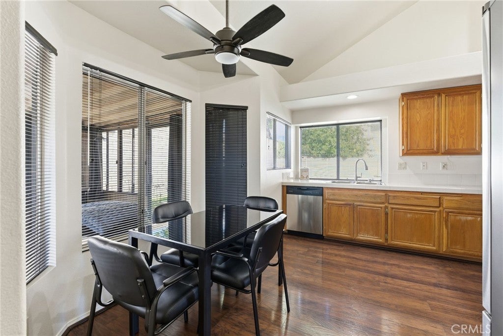 Beautifully maintained two-story home located on a quiet cul-de-sac in Fontana. This property offers a spacious and functional floor plan with multiple living areas, abundant natural light, and vaulted ceilings that create an open, airy feel. The kitchen features ample cabinetry, generous counter space, and flows seamlessly into the dining and living areas, making it ideal for everyday living and entertaining. The home includes well-sized bedrooms, including a spacious primary suite with an en-suite bathroom. Additional bathrooms are thoughtfully designed with modern finishes. Interior highlights include wood flooring, carpeted bedrooms, and neutral tones throughout. The backyard offers a private outdoor space with a covered patio and ample room for relaxation or gatherings. Additional features include an attached garage, laundry area, and mature landscaping. Conveniently located near Victoria Gardens Mall, Sierra Lakes Shopping Center, and with easy access to major freeways, this home combines comfort, functionality, and accessibility.