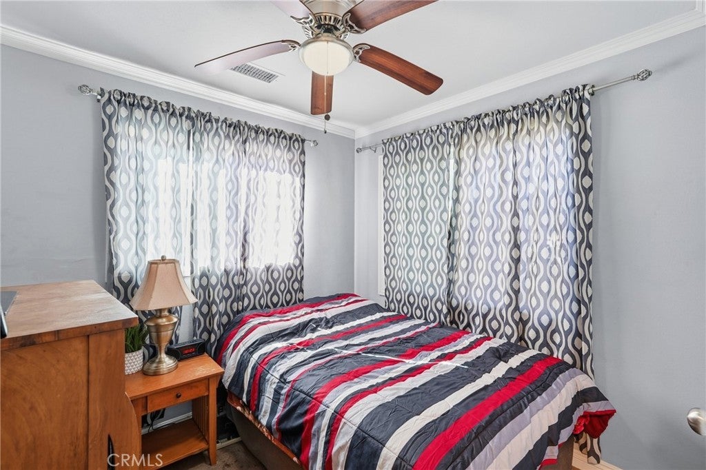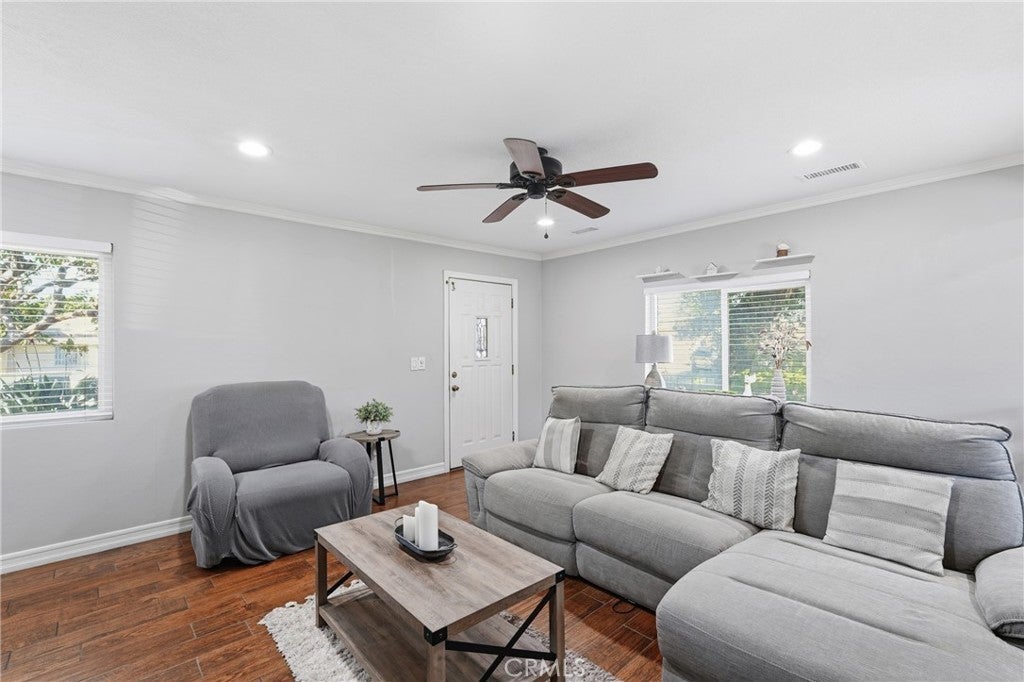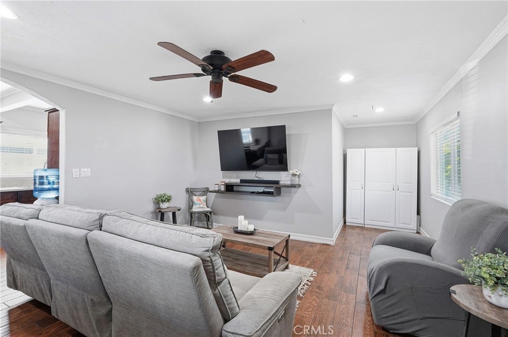 Single-story 3-bedroom, 2-bath home located on a corner lot in Santa Ana. The home features updated flooring, crown molding, fresh interior paint, dual-pane windows, and a newer HVAC system updated approximately four years ago. Includes a detached single-car garage and a functional layout with plenty of natural light. Conveniently located near shopping, dining, and freeway access.
