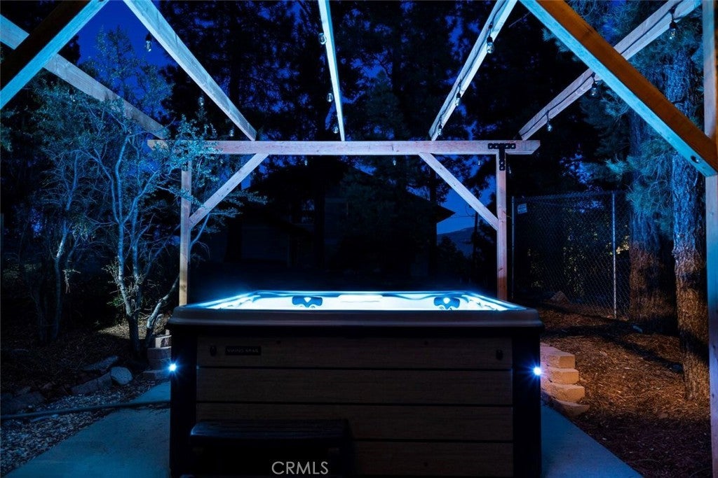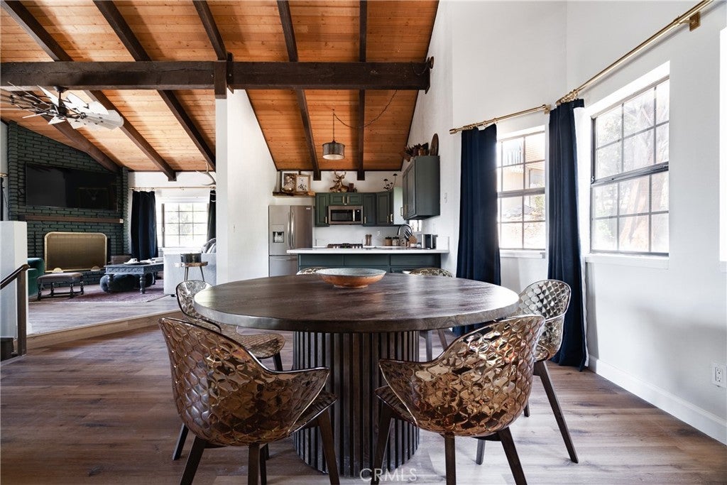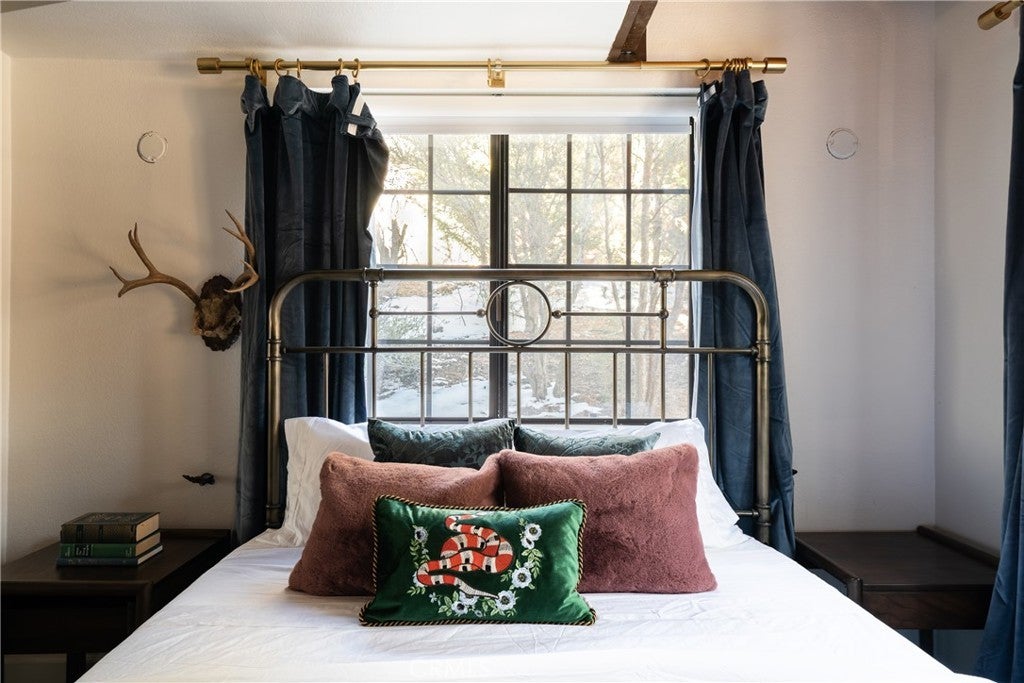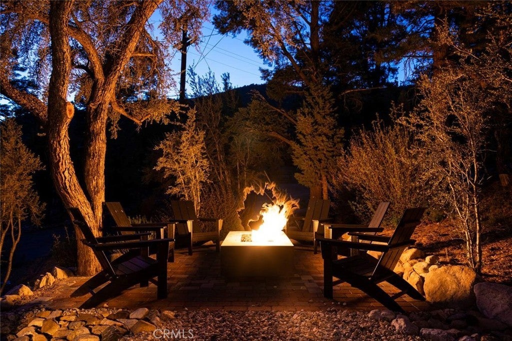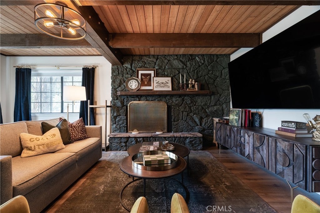 On a quiet Big Bear City street, this thoughtfully remodeled and professionally designed mountain home blends architectural character with modern comfort in a way that feels elevated and inviting. Vaulted, wood-beamed ceilings, rich textures, and curated design moments create a space that feels warm, expressive, and welcoming, ideal for those who value creativity, connection, and a slower mountain rhythm. The main level is designed for gathering and everyday living, anchored by a striking stone fireplace and filled with natural light. An open kitchen with generous prep space, breakfast bar seating, and modern appliances flows easily into a spacious dining area, perfect for long dinners, creative work sessions, or hosting friends and family. Multiple living areas offer flexibility for conversation, quiet moments, or settling in after a day outdoors. With four bedrooms and two bathrooms, the layout comfortably accommodates families and guests while still allowing separation between living and sleeping spaces. The lower level offers additional living space and a large recreation area, creating room for games, hobbies, or a flexible studio-style setup depending on your needs. Throughout the home, finishes and details strike a balance between warmth and refinement, with a palette that feels grounded, calm, and timeless. Outdoor spaces include a dedicated fire pit area and a spa tucked into a private setting, ideal for evenings under the stars or slow mornings surrounded by trees. Practical upgrades include air conditioning, an EV charger, and a two-car attached garage that has functioned as a versatile game and recreation space, supporting both full-time living and extended mountain stays. Conveniently located near trails, the lake, ski resorts, and local amenities, this home offers a rare combination of privacy, proximity, and personality. A place to create, recharge, and make memories without sacrificing comfort or style.