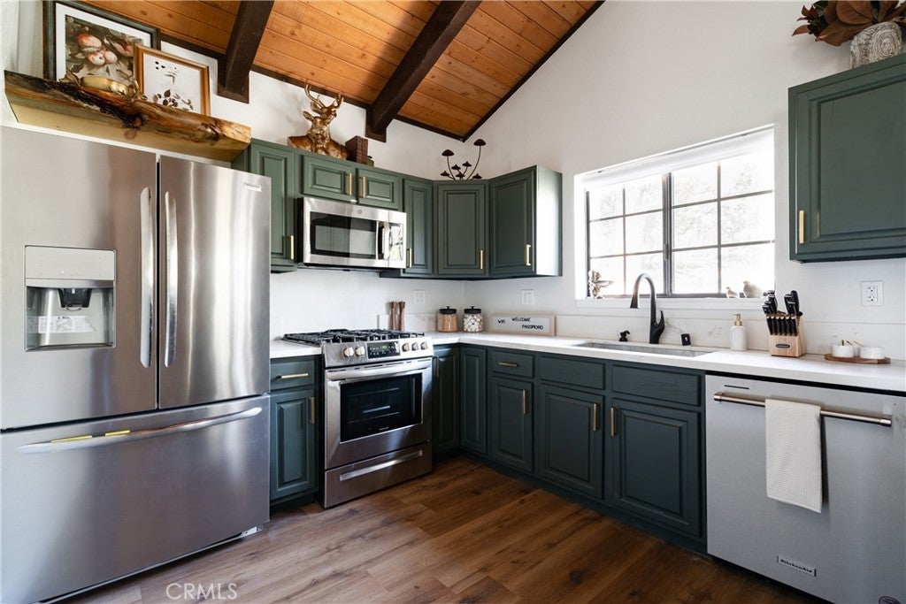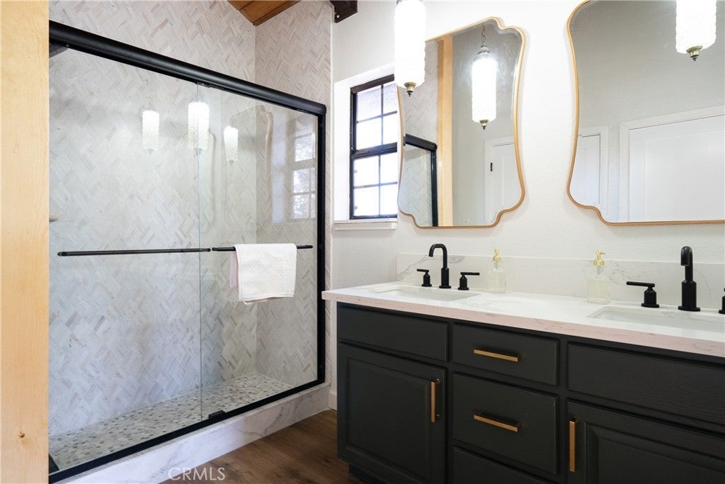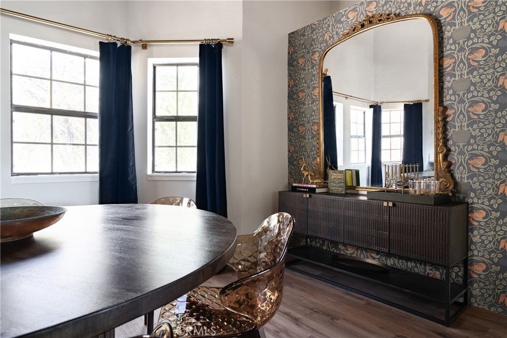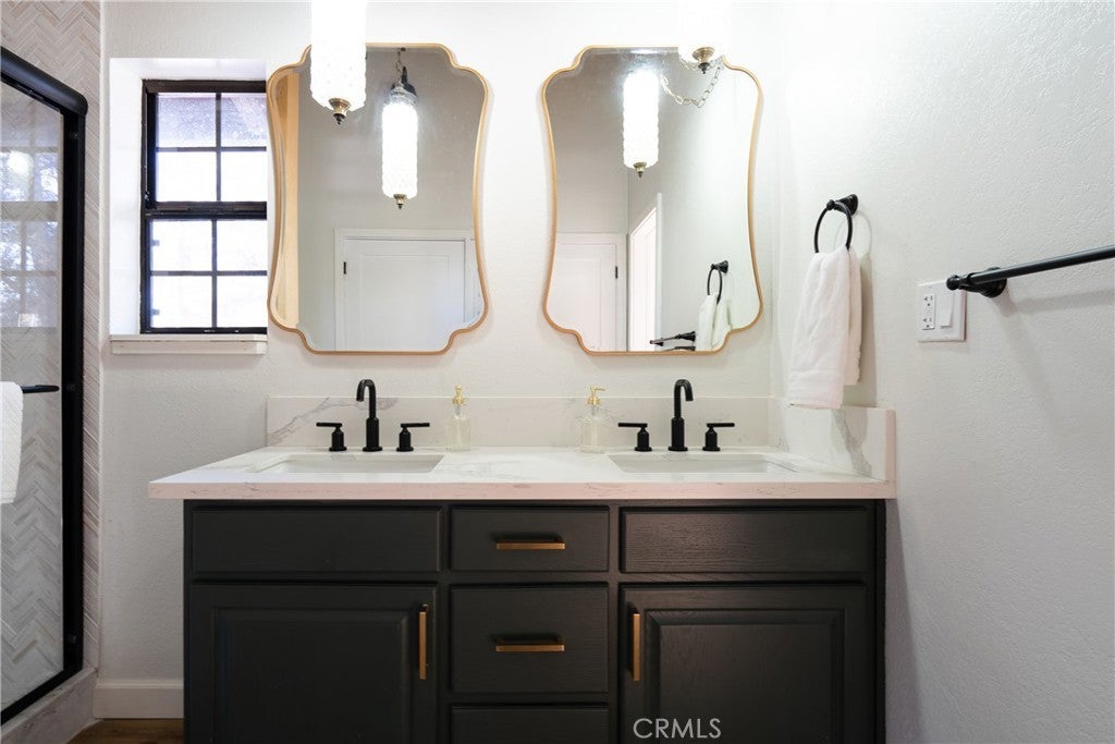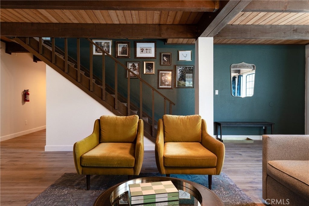 On a quiet Big Bear City street, this thoughtfully remodeled and professionally designed mountain home blends architectural character with modern comfort in a way that feels elevated and inviting. Vaulted, wood-beamed ceilings, rich textures, and curated design moments create a space that feels warm, expressive, and welcoming, ideal for those who value creativity, connection, and a slower mountain rhythm. The main level is designed for gathering and everyday living, anchored by a striking stone fireplace and filled with natural light. An open kitchen with generous prep space, breakfast bar seating, and modern appliances flows easily into a spacious dining area, perfect for long dinners, creative work sessions, or hosting friends and family. Multiple living areas offer flexibility for conversation, quiet moments, or settling in after a day outdoors. With four bedrooms and two bathrooms, the layout comfortably accommodates families and guests while still allowing separation between living and sleeping spaces. The lower level offers additional living space and a large recreation area, creating room for games, hobbies, or a flexible studio-style setup depending on your needs. Throughout the home, finishes and details strike a balance between warmth and refinement, with a palette that feels grounded, calm, and timeless. Outdoor spaces include a dedicated fire pit area and a spa tucked into a private setting, ideal for evenings under the stars or slow mornings surrounded by trees. Practical upgrades include air conditioning, an EV charger, and a two-car attached garage that has functioned as a versatile game and recreation space, supporting both full-time living and extended mountain stays. Conveniently located near trails, the lake, ski resorts, and local amenities, this home offers a rare combination of privacy, proximity, and personality. A place to create, recharge, and make memories without sacrificing comfort or style.