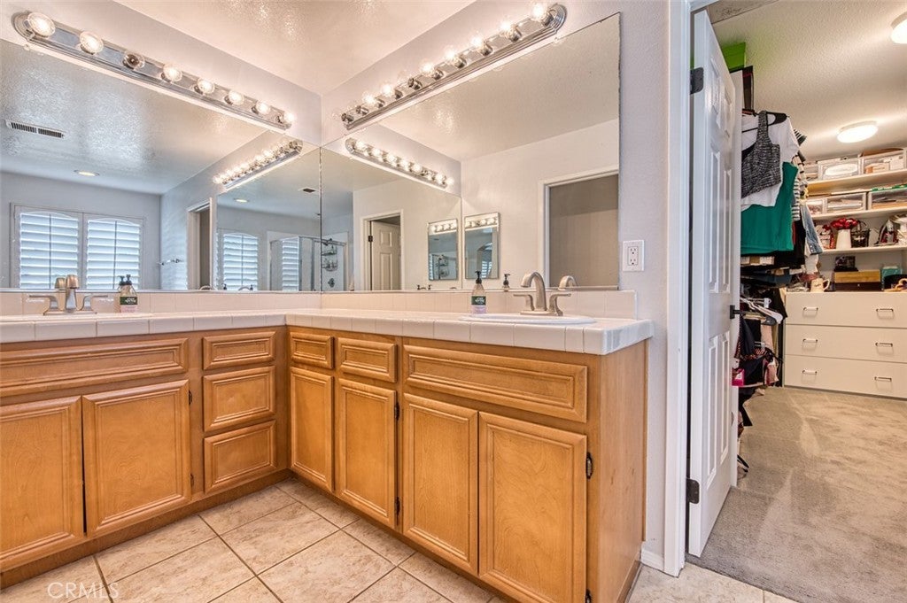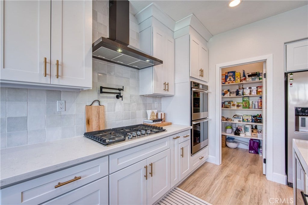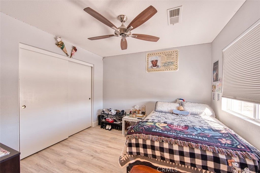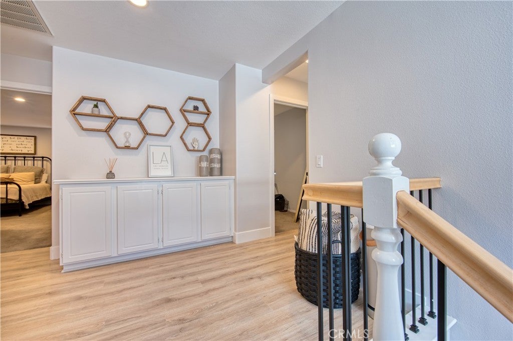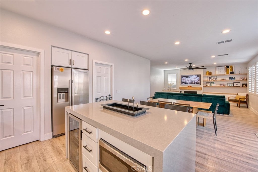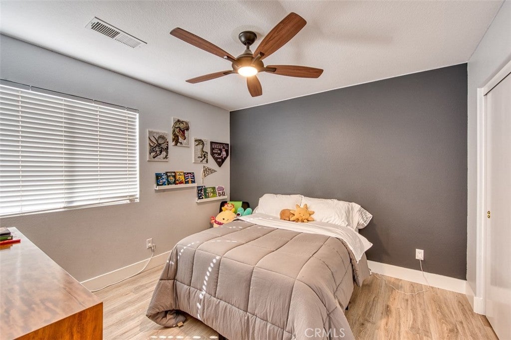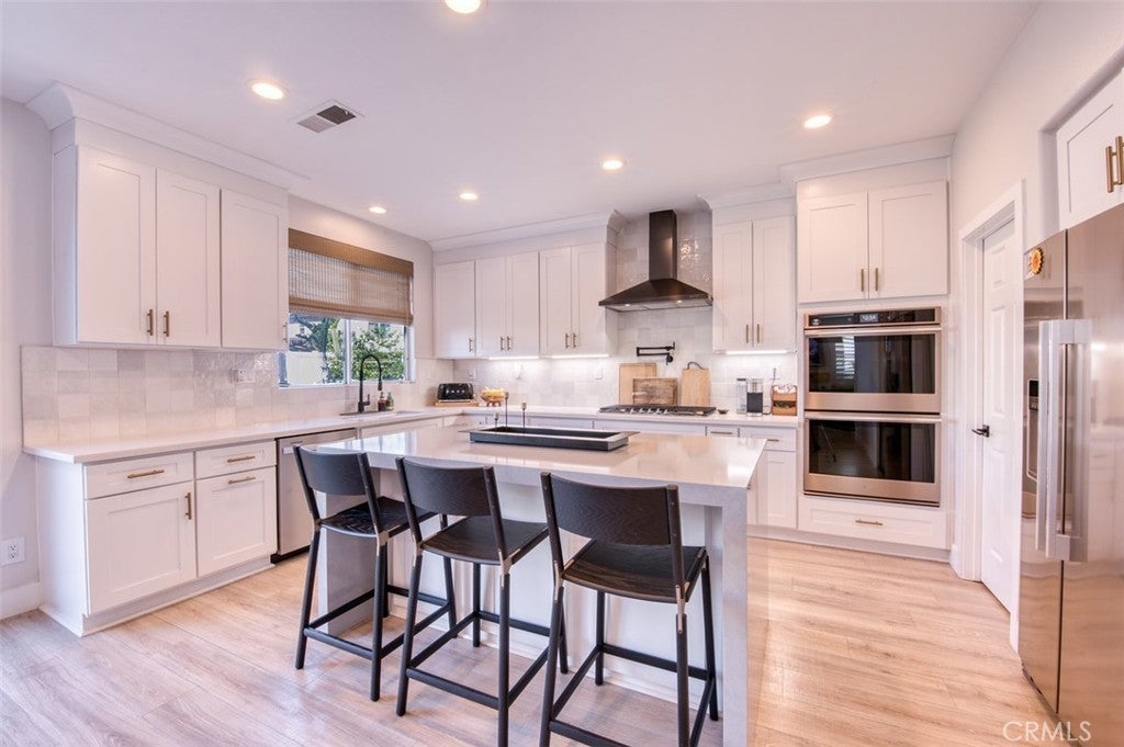 MOVE-IN READY EASTVALE HOME! Gorgeous two-story home offering 2,253 square feet of living space, featuring 4 bedrooms and 3 full bathrooms, thoughtfully designed for comfort and functionality. The entry welcomes you with a downstairs bedroom and full bathroom with walk-in shower, ideal for guests or multigenerational living. Across the hall is a versatile flex room, perfect as a den, home office, or playroom. Enjoy an open-concept floor plan enhanced by wood grained water-resistant vinyl flooring throughout the main living areas. The spacious family room features a cozy fireplace, custom built-in floating shelves and storage and flows seamlessly into the dining area and stunning, fully updated kitchen. The chef’s kitchen boasts stainless steel appliances, double ovens, a 5-burner cooktop with range hood, wall-mounted pot filler, quartz countertops with matching backsplash, stylish cabinetry, a large island with Silestone countertop, and a walk-in pantry. Refrigerator and beverage refrigerator are included. Additional highlights include plantation shutters, abundant recessed lighting, and a whole house water softener system for enhanced comfort and appliance longevity. Upstairs, the primary suite offers a relaxing retreat with dual sinks, a soaking tub, separate shower, and a walk-in closet with built-in organizers. A hall bathroom with dual sinks and two additional bedrooms complete the upper level. The 3-car tandem garage features custom built-in cabinetry for excellent storage. Energy efficiency is enhanced with a solar power system. Step outside to a spacious backyard with artificial turf and attractive landscaping, perfect for entertaining or low-maintenance outdoor living. The home is conveniently located within walking distance to Harada Elementary School and Harada Heritage Park, and just minutes from shopping, dining, and entertainment.