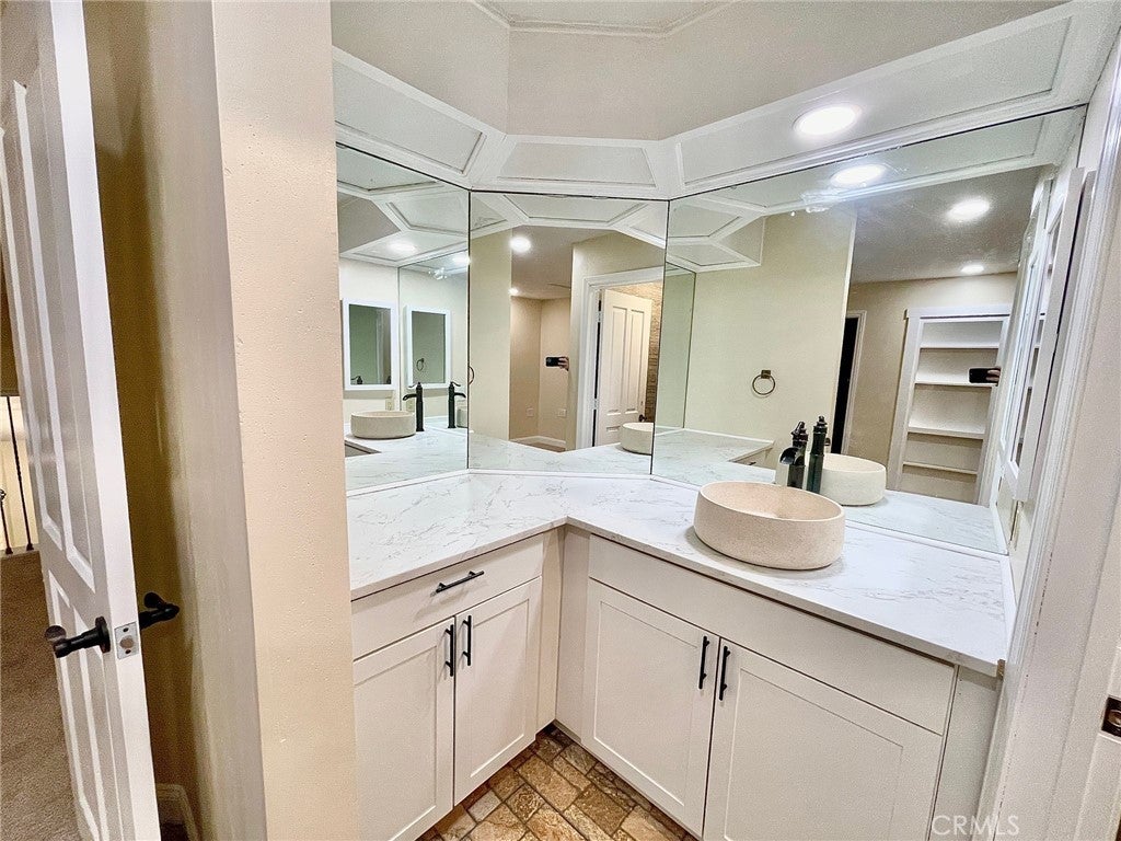 Enjoy resort-style living and serene golf course views in this beautifully updated end-of-cul-de-sac townhome featuring 2 bedrooms, 2.5 baths, and a flexible loft/office, located within the prestigious gated Bear Creek community. Offering approximately 1,840 square feet, the home showcases an open, light-filled layout with vaulted ceilings, exposed beams, and warm wood flooring throughout the main living areas. The spacious living room is anchored by a stone-clad fireplace and flows seamlessly into the kitchen, complete with white cabinetry, stone accents, ample counter space, and a professional-style range, ideal for entertaining. Glass doors open to a private patio overlooking the golf course and greenbelt, providing a peaceful outdoor retreat. The primary suite is conveniently located on the main level, while the upstairs loft offers versatile space for an office, den, or optional third bedroom (no window). The end-of-cul-de-sac location adds privacy and a quieter setting rarely available in the community. Bear Creek residents enjoy access to a championship golf course, clubhouse, pool and spa, fitness center, and 24-hour guard-gated security, all close to shopping, dining, and freeway access. A rare opportunity to own a private, view-oriented home in one of Murrieta’s most desirable gated communities.