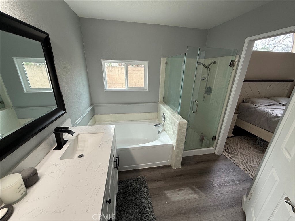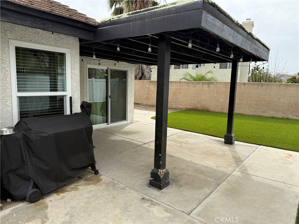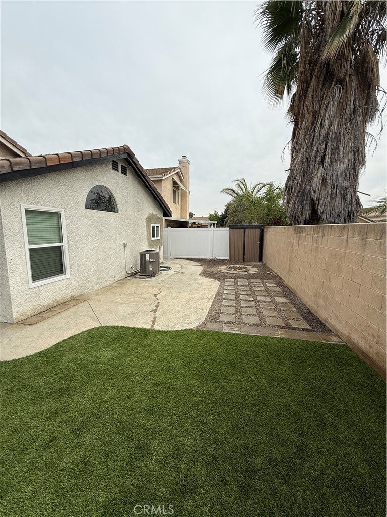 Modern updates and intentional design are felt throughout. The front yard features a low-maintenance desertscape with pebble ground cover and succulents. Inside, the living room offers high ceilings, a gas fireplace, and sleek ceiling fans, with brand-new windows bringing in abundant natural light. The wide kitchen includes a dining area, recessed lighting, and quartz countertops, creating a functional and inviting space. The primary suite features a large bathroom with a walk-in closet and separate tub and shower. Ceiling fans are installed in every bedroom, and a new water heater adds peace of mind. The backyard is finished with artificial turf for easy outdoor enjoyment. The refurbished garage is complete with textured walls, fresh paint, recessed lighting, and a clean epoxy floor.